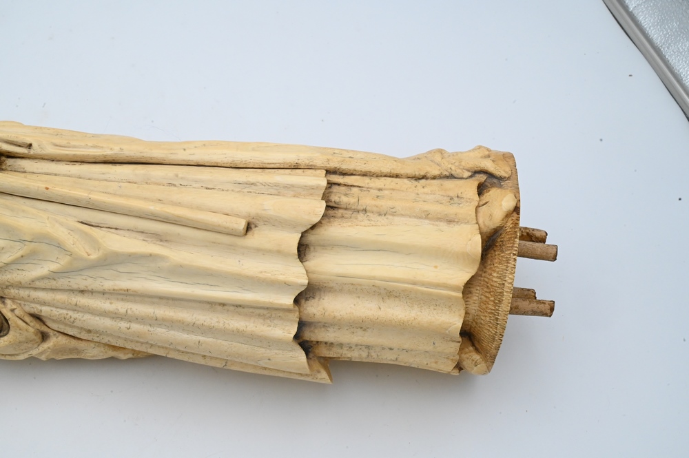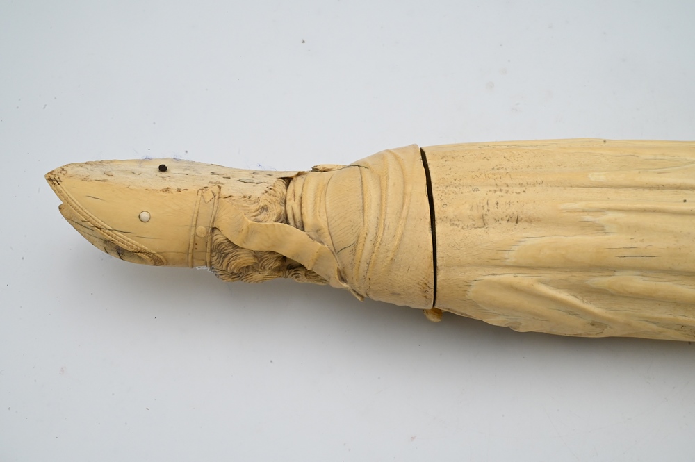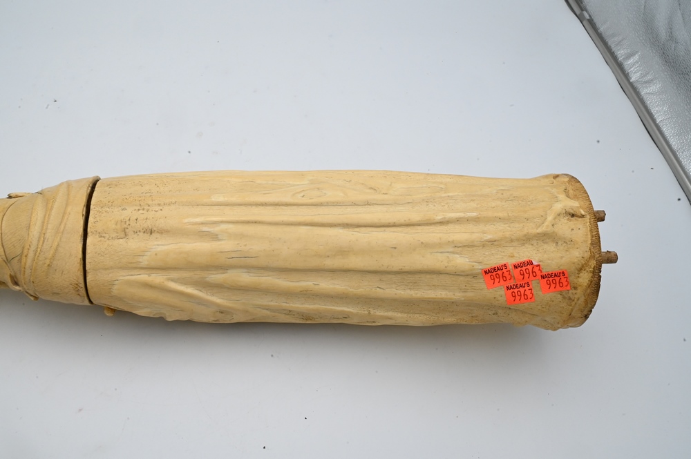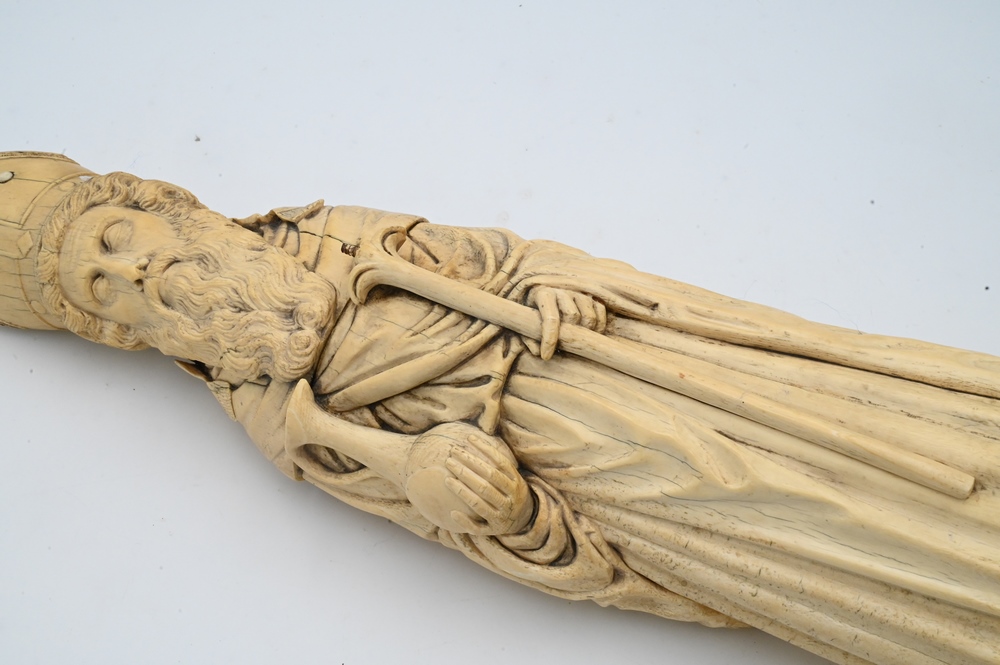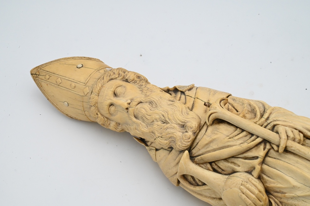 Lot 521: Large Carved Ivory Statue of a Bishop, holding a staff and urn, wearing a hat mounted with ivory beads and wearing a robe, 18th century, height 25 1/2 inches. Please note: Items containing ivory cannot be purchased or shipped by bidders residing outside of the United States or California, Hawaii, Nevada, New Jersey, New York, Washington, Oregon, or District of Columbia. If an ivory item is purchased by a bidder in one of the above mentioned locations or attempts to ship ivory to one of the above mentioned locations, bidder will forfeit the item and be responsible for any incurred fees such as a restocking fee.