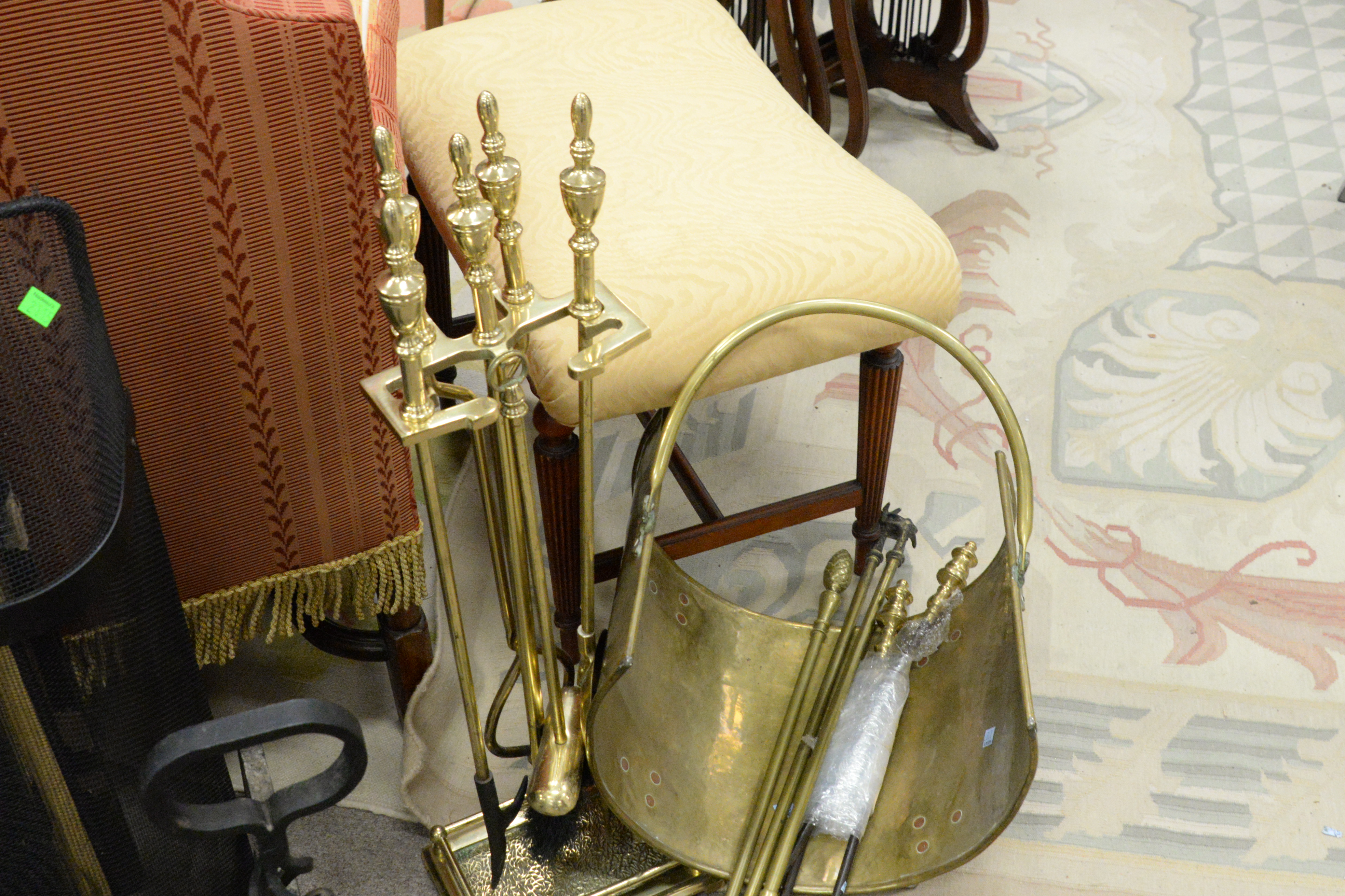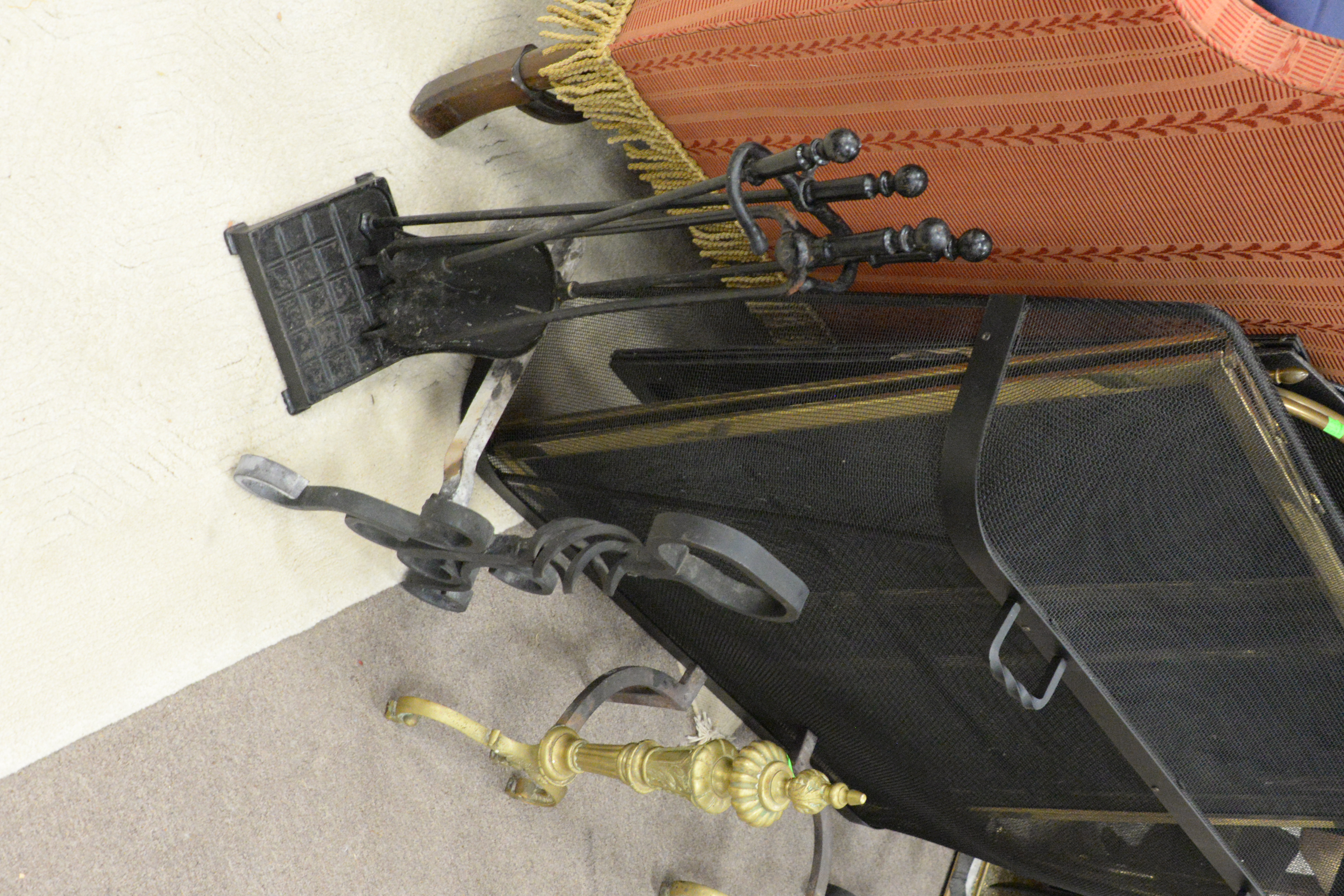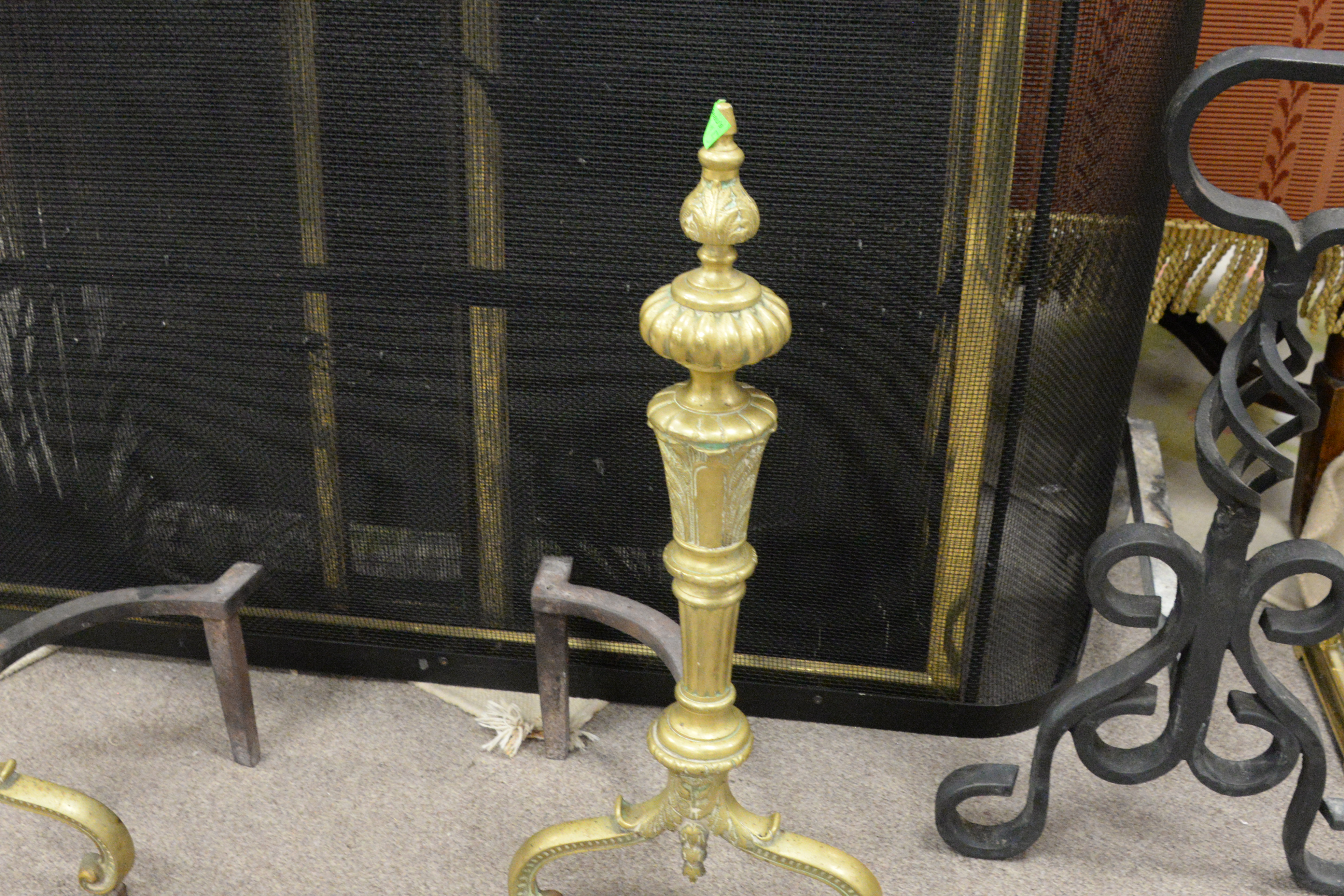 Large Fireplace Grouping to Include, four screens, two sets of firetools, two sets of andirons, along with a log holder, largest height 30 inches, width 44 inches
