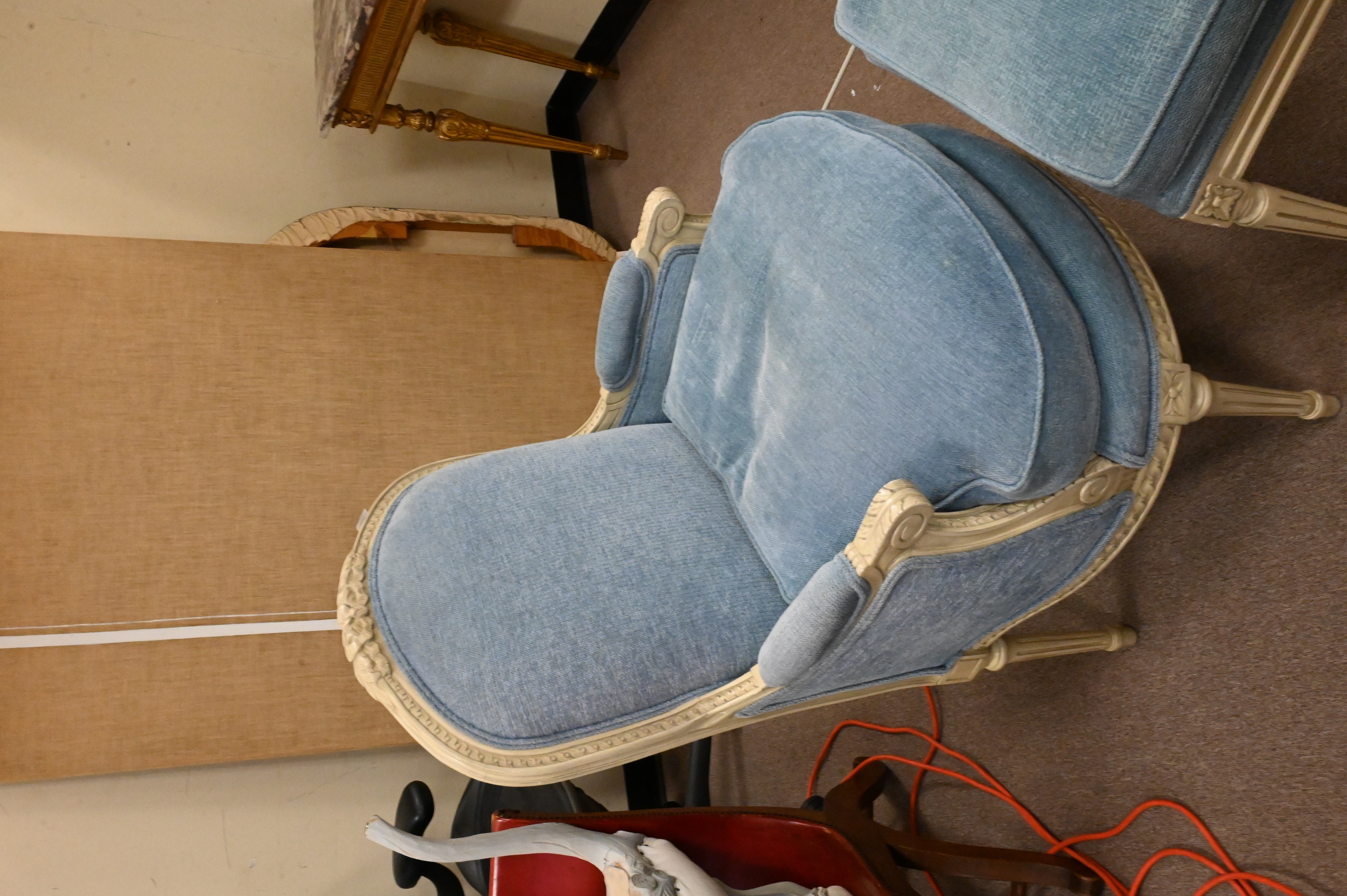 both having carved and painted white / grey frame with floral accents, set on fluted and tapering legs, both in custom blue upholstery