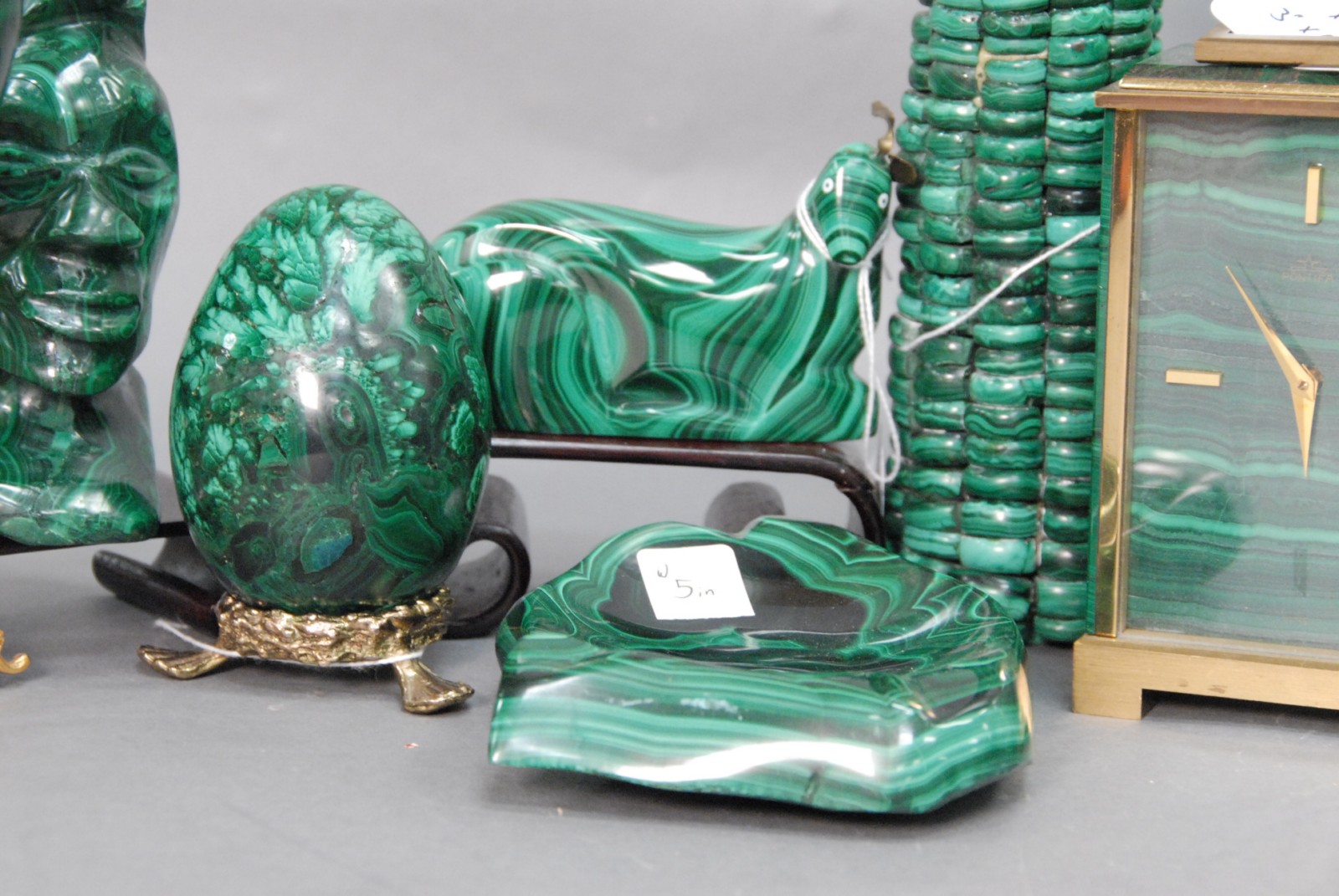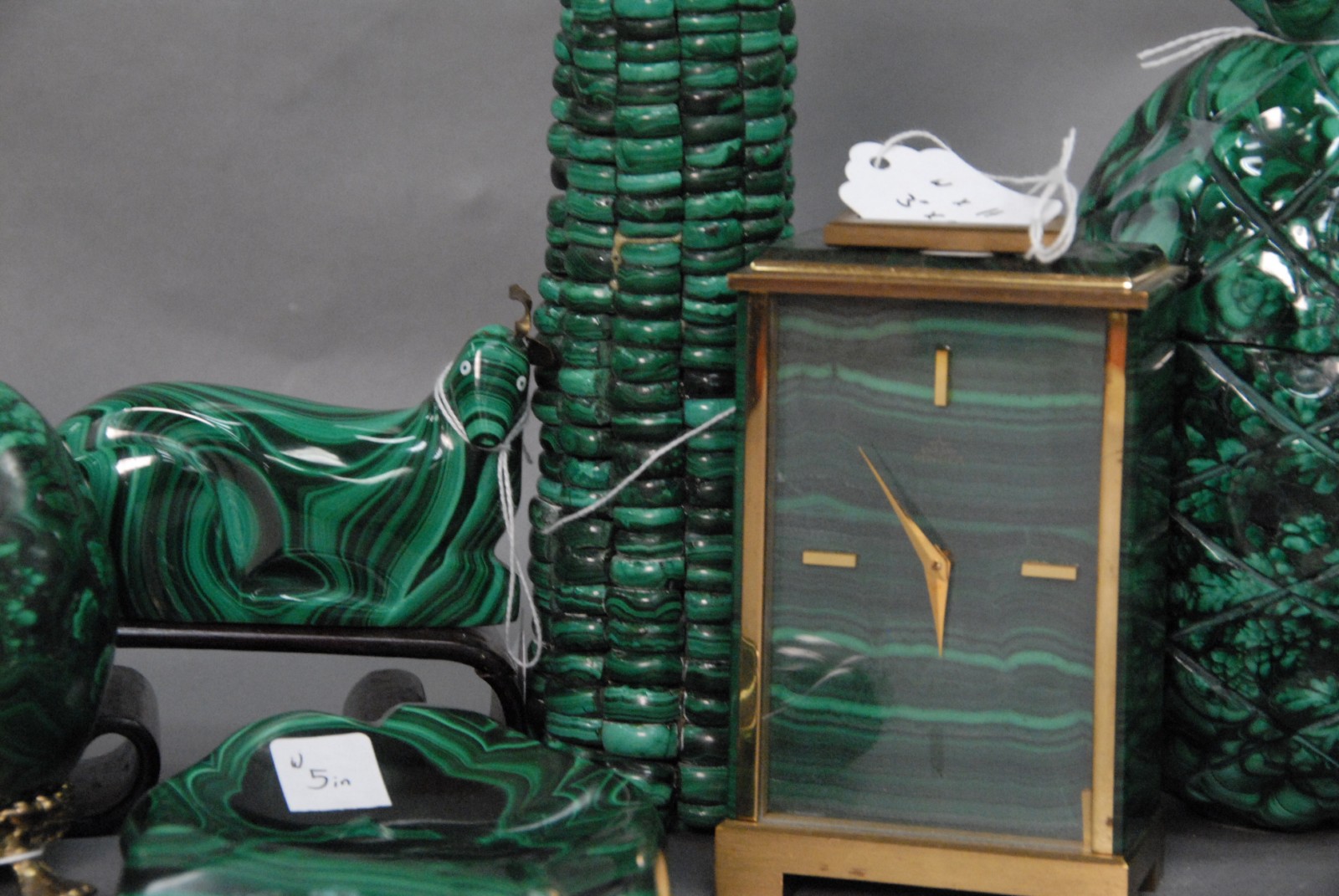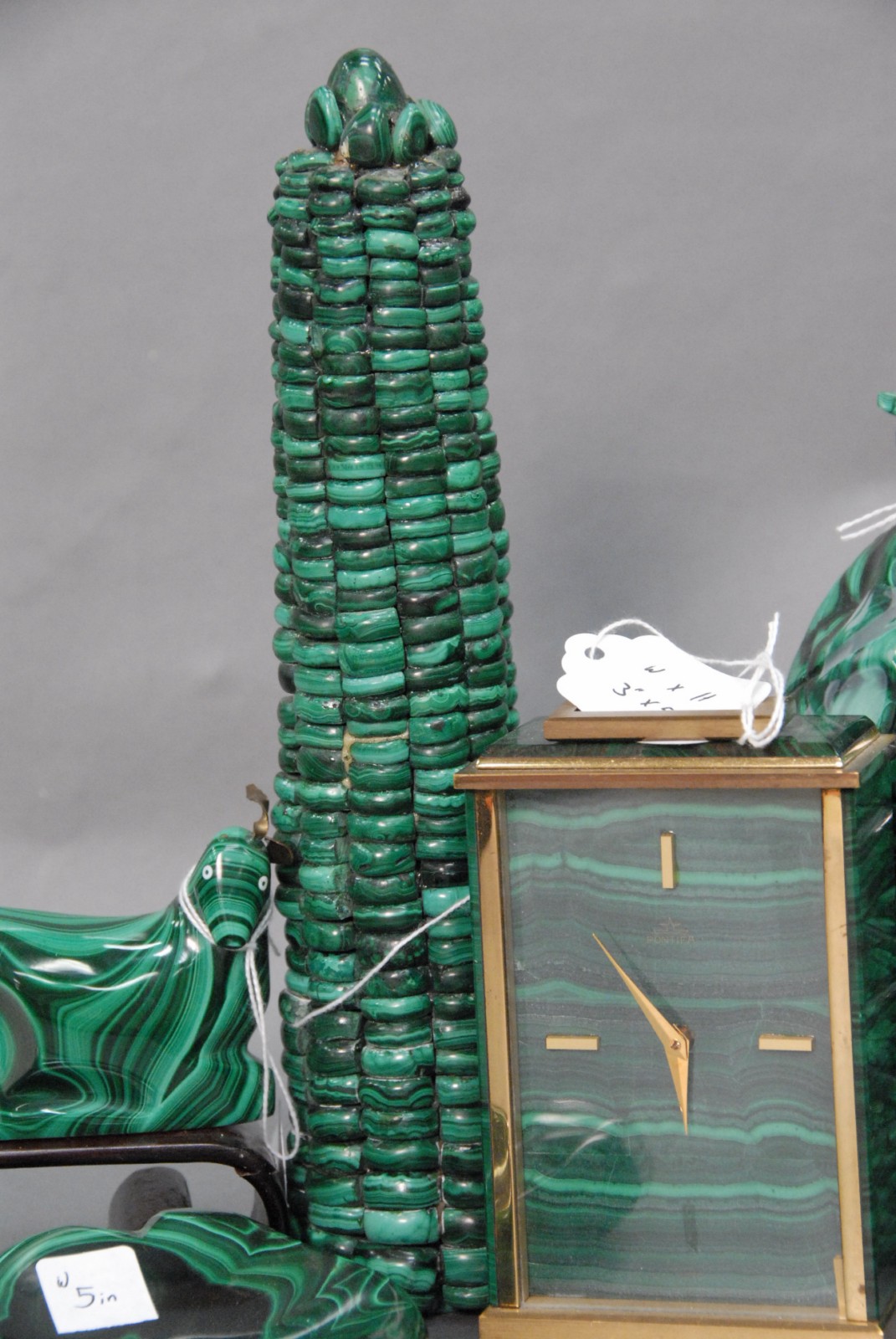 Nine piece malachite lot to include pineapple, two eggs, corn, clock and tower, bust of a man, an animal and ashtray.