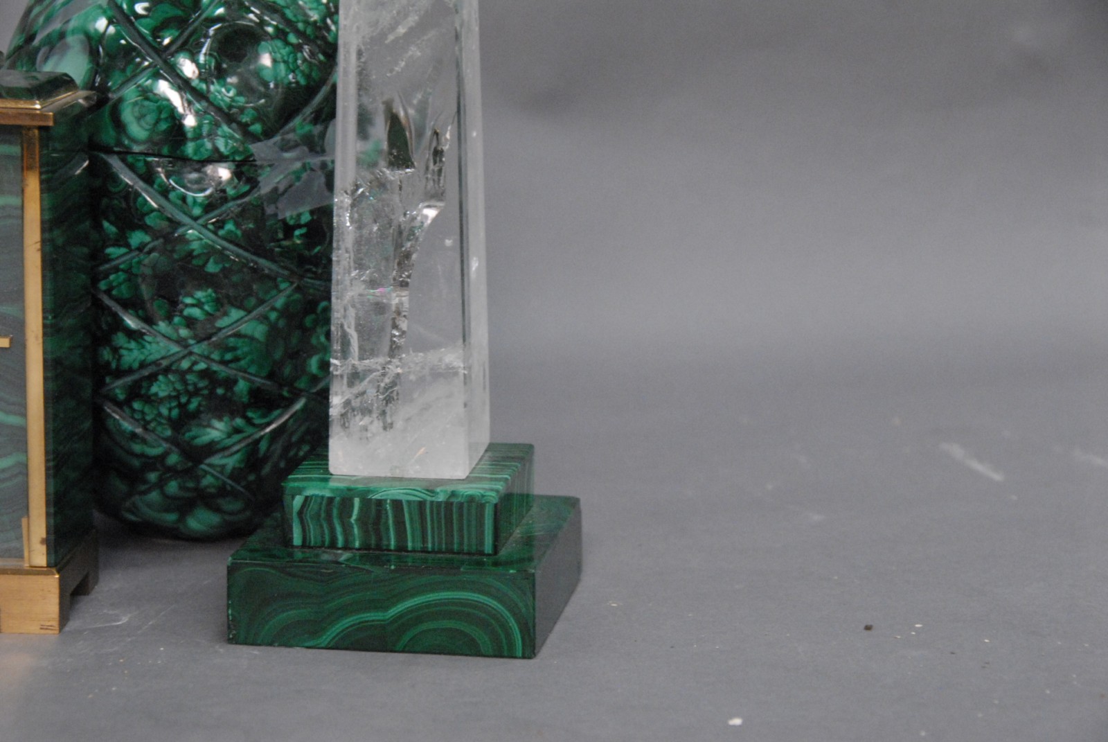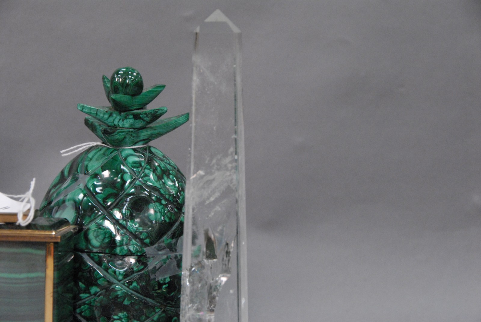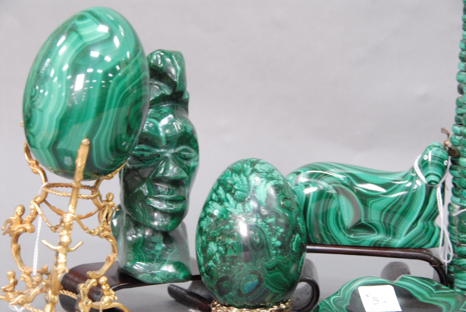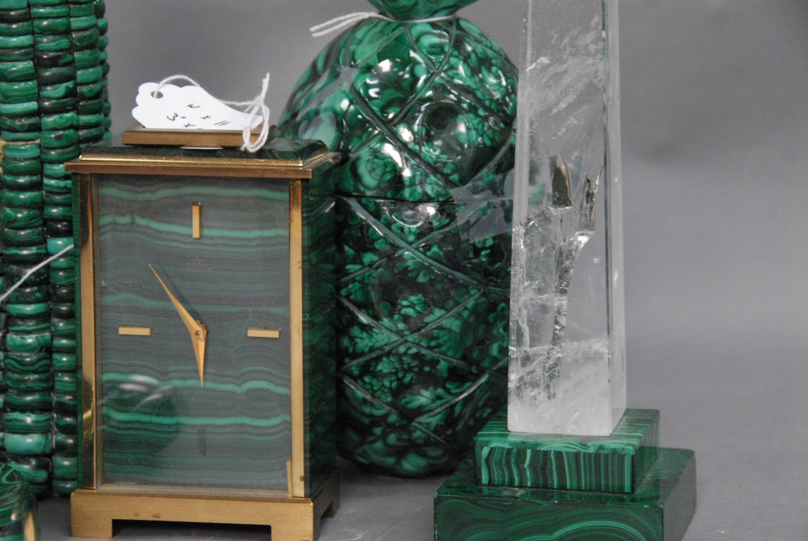 Nine piece malachite lot to include pineapple, two eggs, corn, clock and tower, bust of a man, an animal and ashtray.