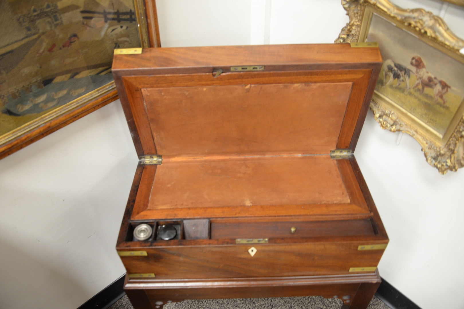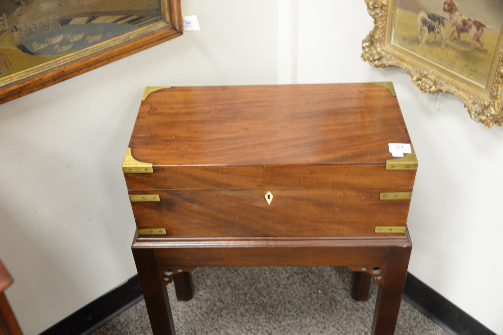 Lot 521: Regency Mahogany Lap Desk and Stand brass bound campagne style, height 28 3/4 inches, width 20 inches.