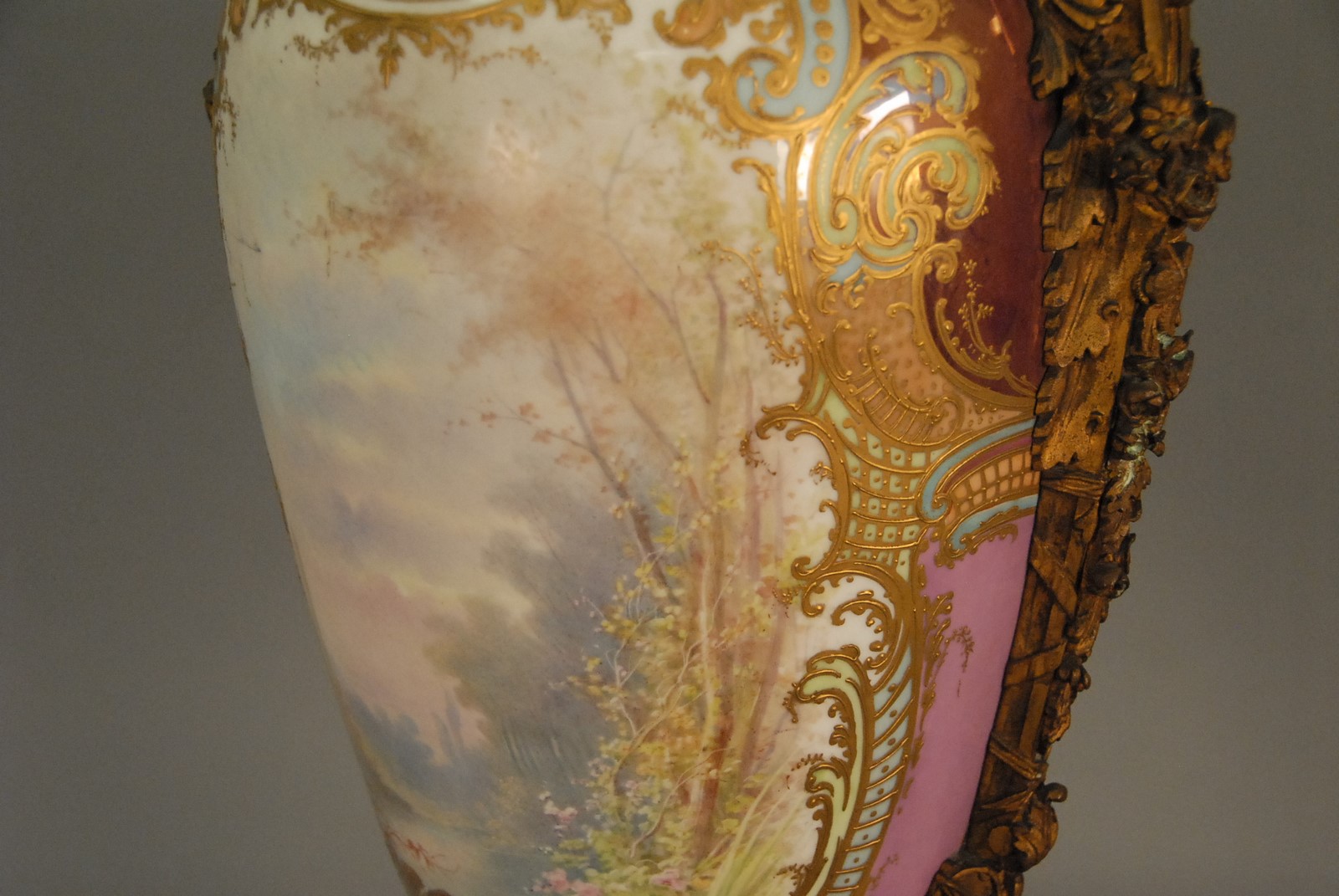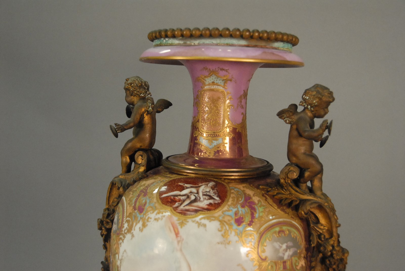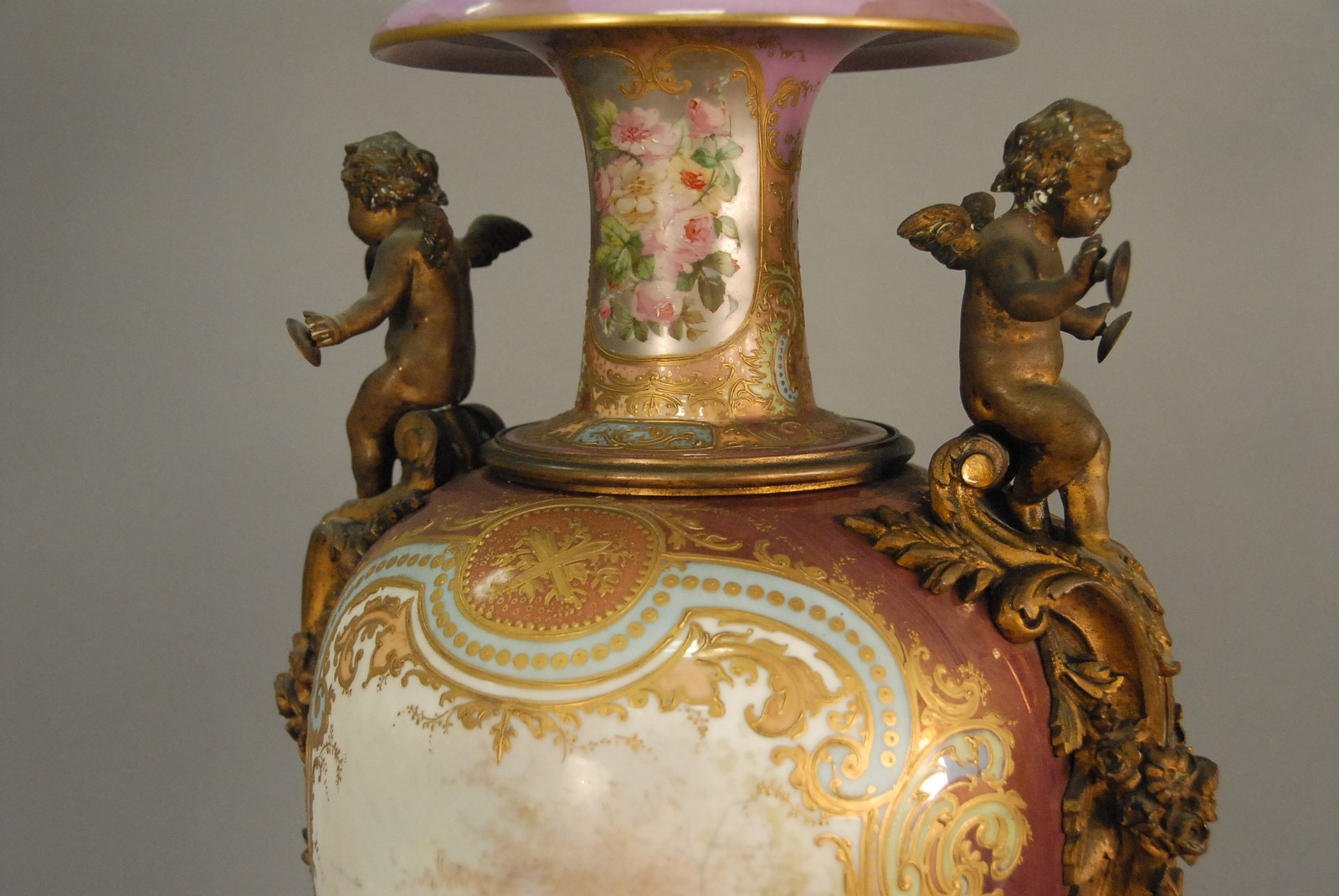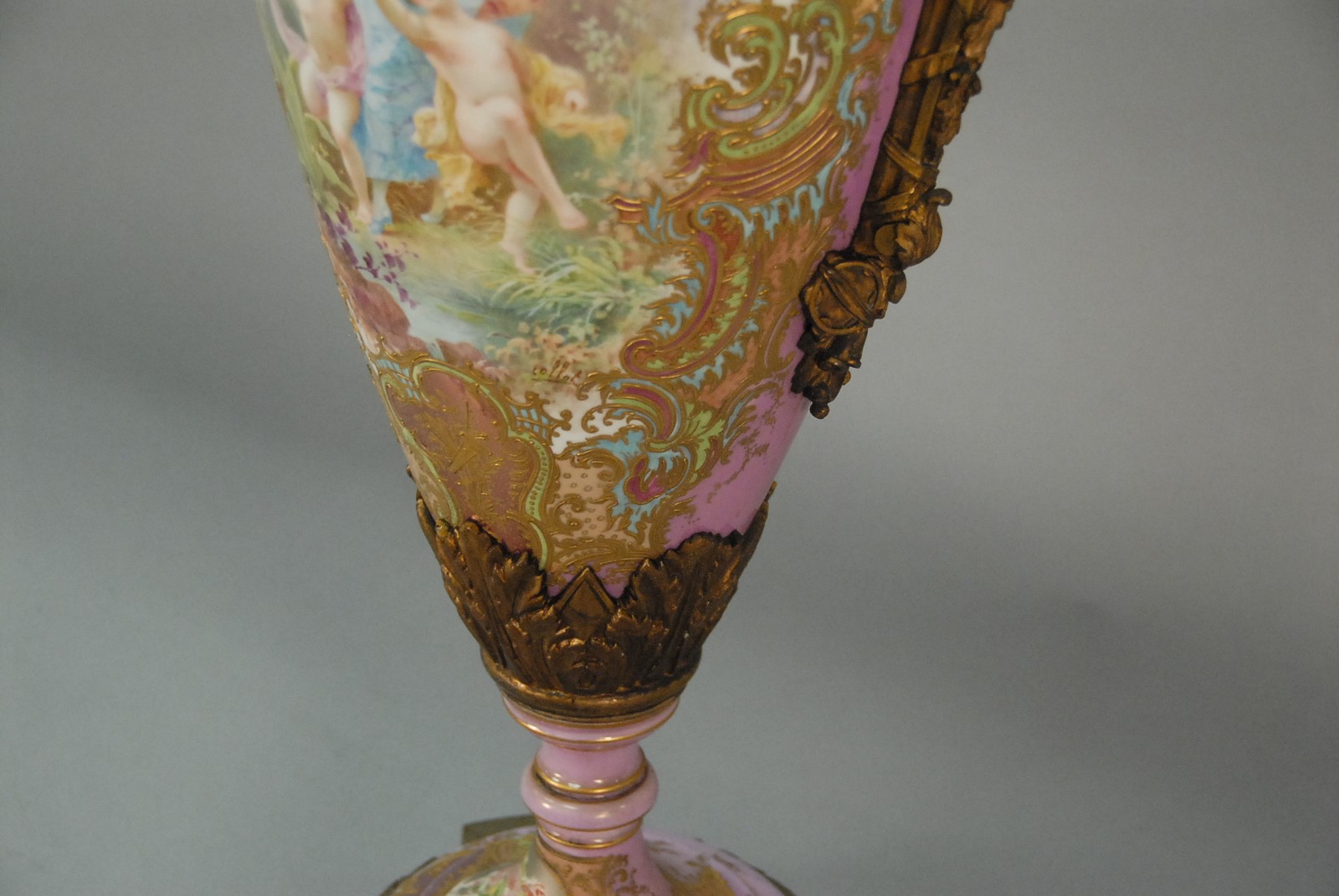 Sevres style gilt bronze mounted porcelain urn in baluster form having pink ground and painted cartouche depicting woman figure and cherubs on one side and landscape on the other, signed Collat, having heavy gilt decoration of scrolling leaves and flowers no cover. urn ht. 31 1/4 in. total ht. 35 1/2 in.