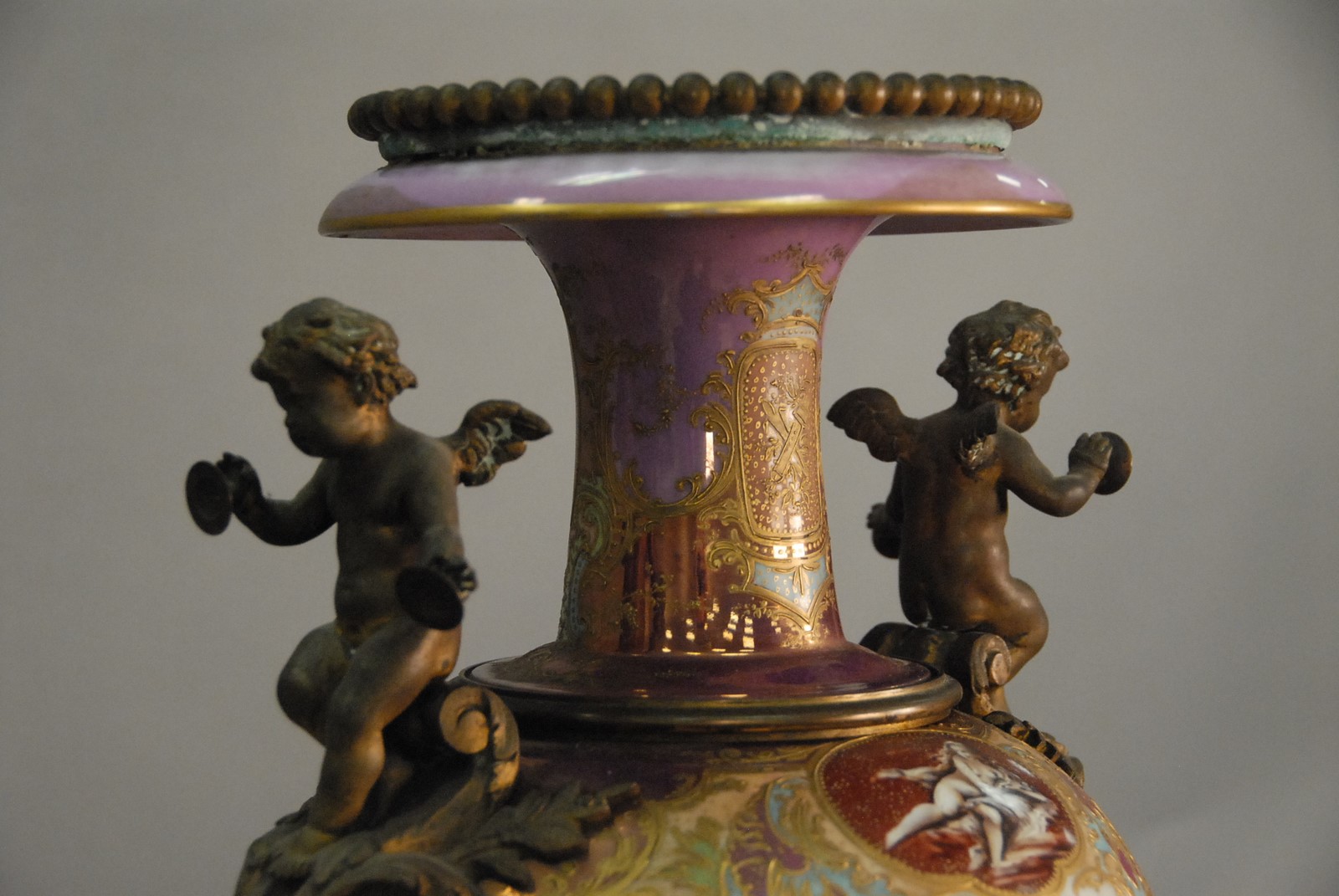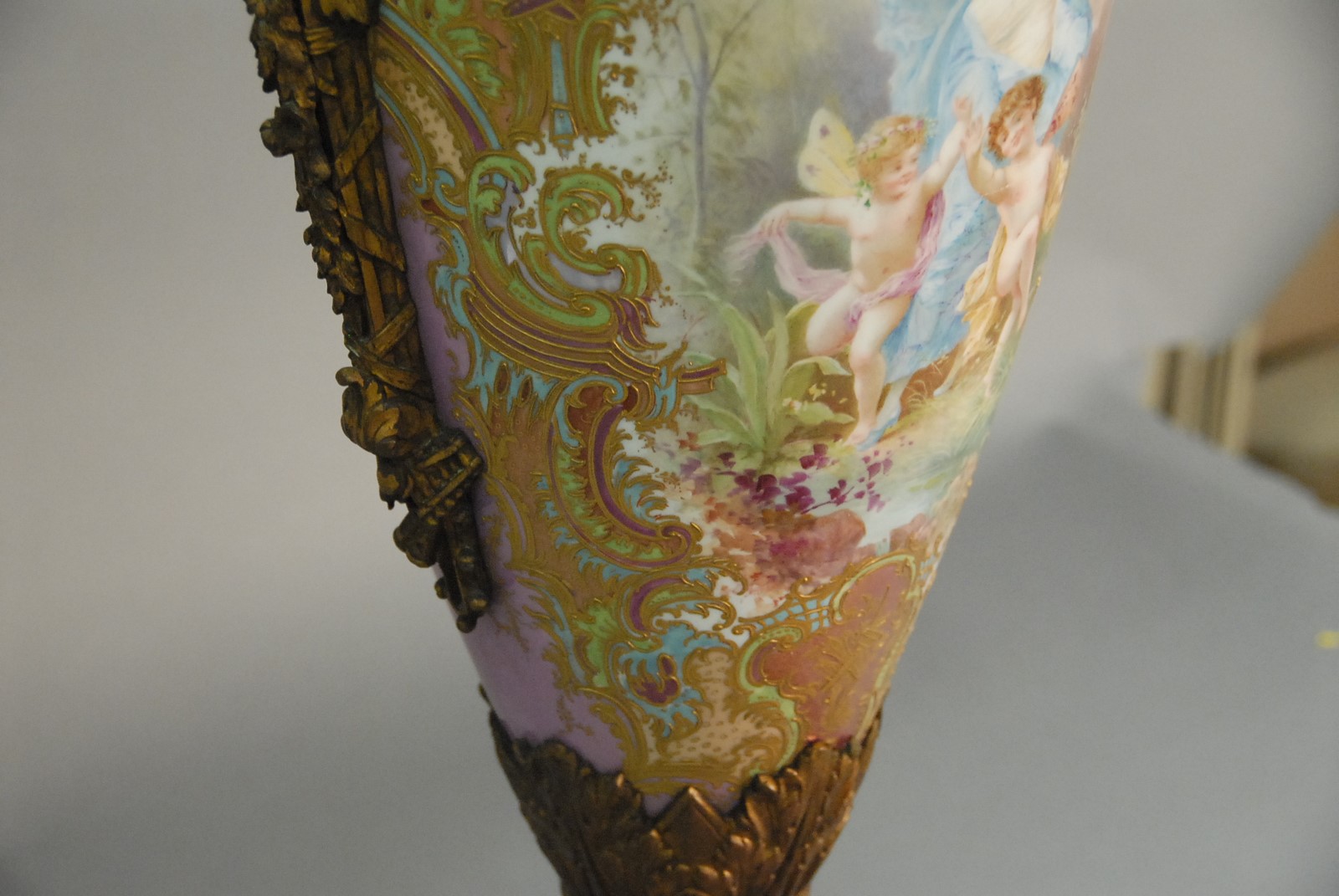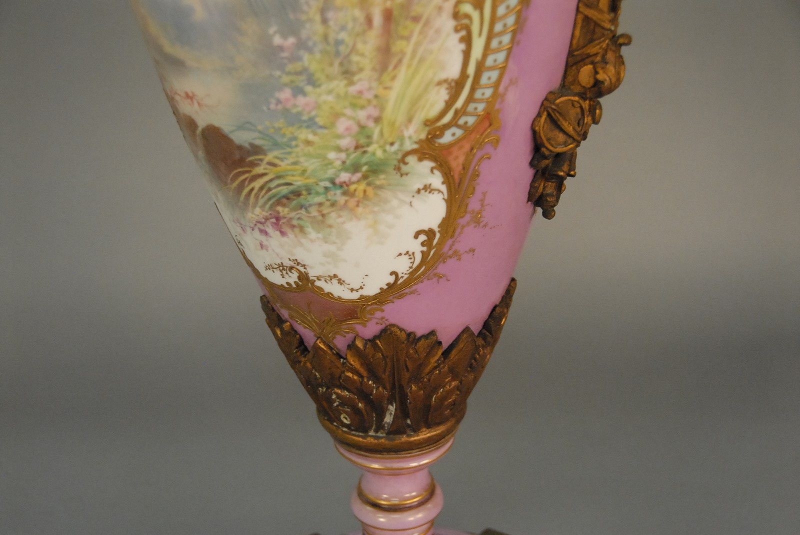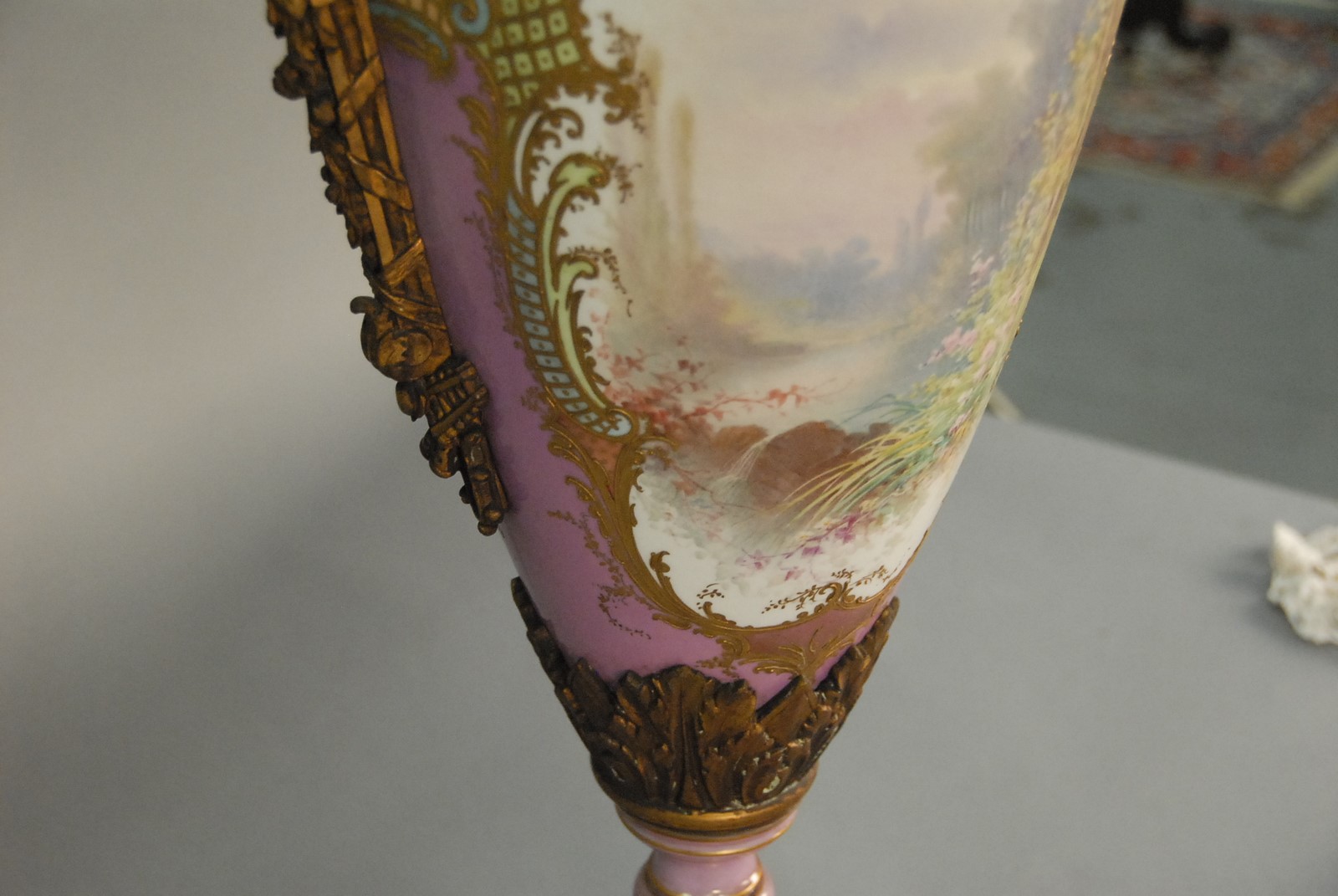 Sevres style gilt bronze mounted porcelain urn in baluster form having pink ground and painted cartouche depicting woman figure and cherubs on one side and landscape on the other, signed Collat, having heavy gilt decoration of scrolling leaves and flowers no cover. urn ht. 31 1/4 in. total ht. 35 1/2 in.