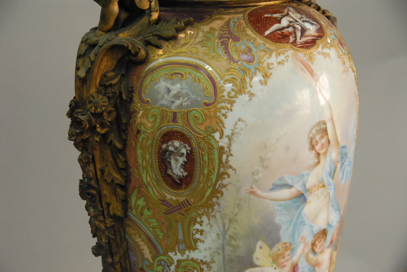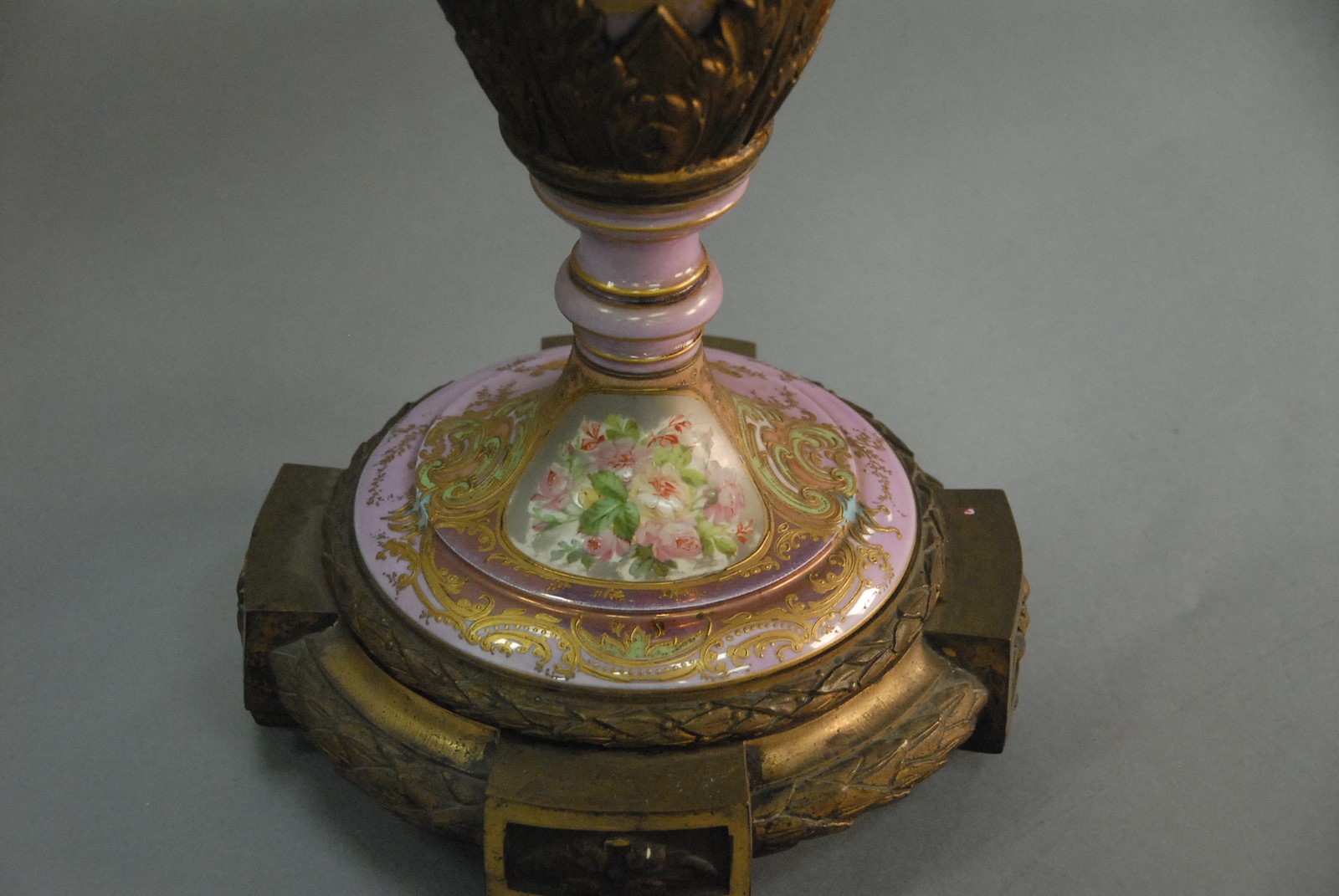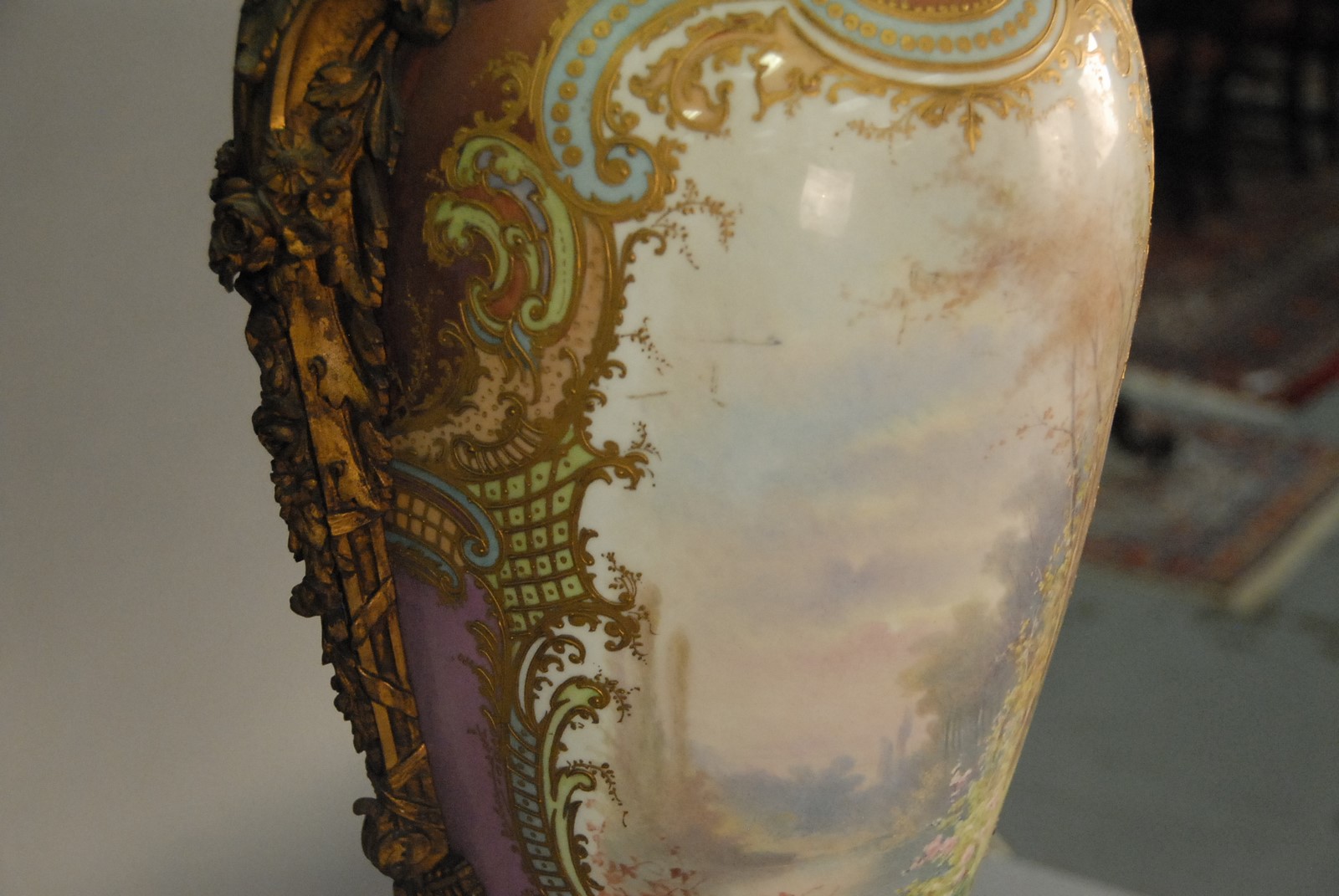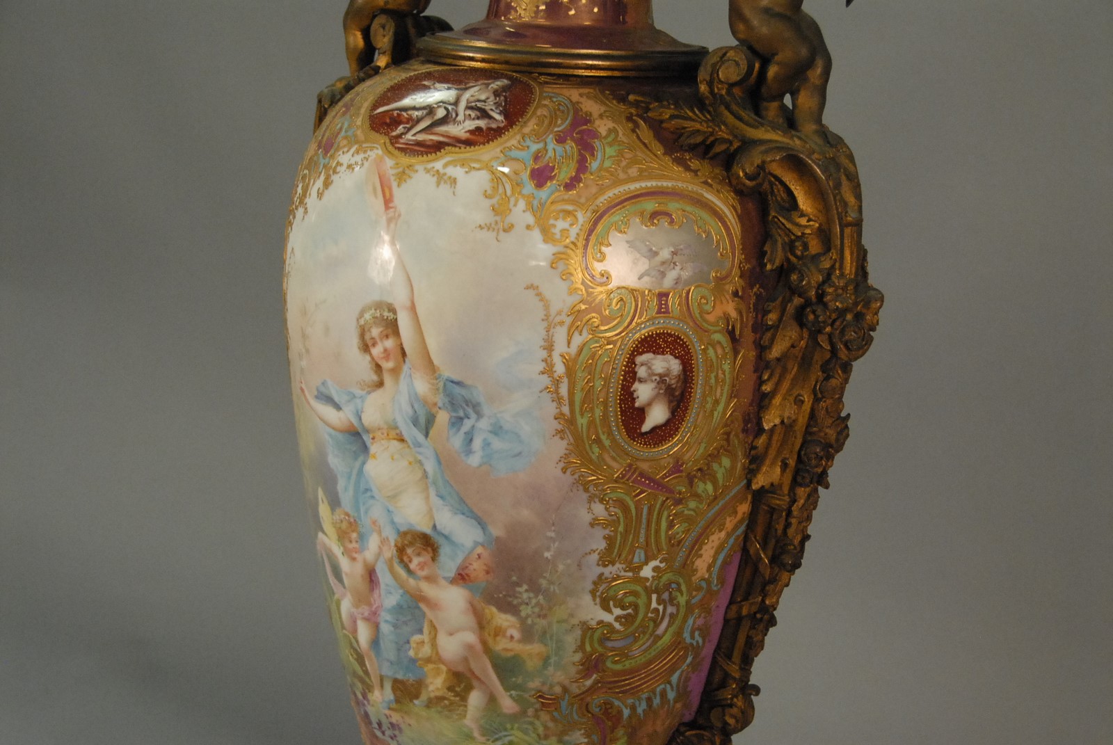 Sevres style gilt bronze mounted porcelain urn in baluster form having pink ground and painted cartouche depicting woman figure and cherubs on one side and landscape on the other, signed Collat, having heavy gilt decoration of scrolling leaves and flowers no cover. urn ht. 31 1/4 in. total ht. 35 1/2 in.