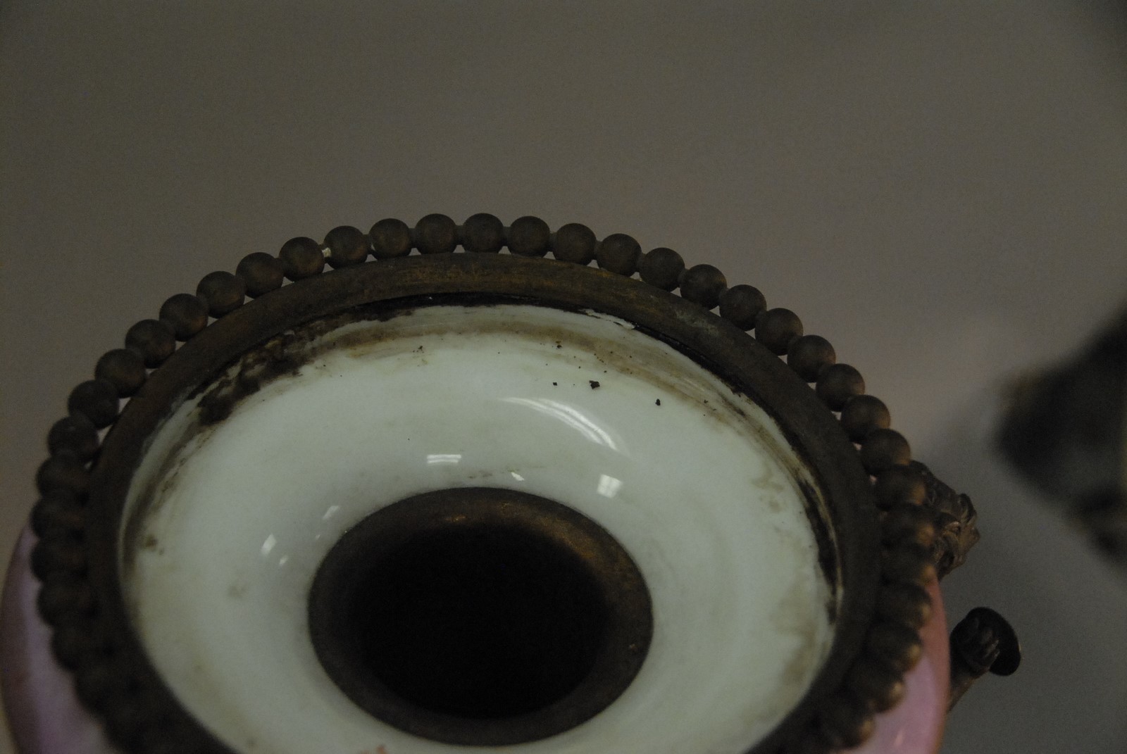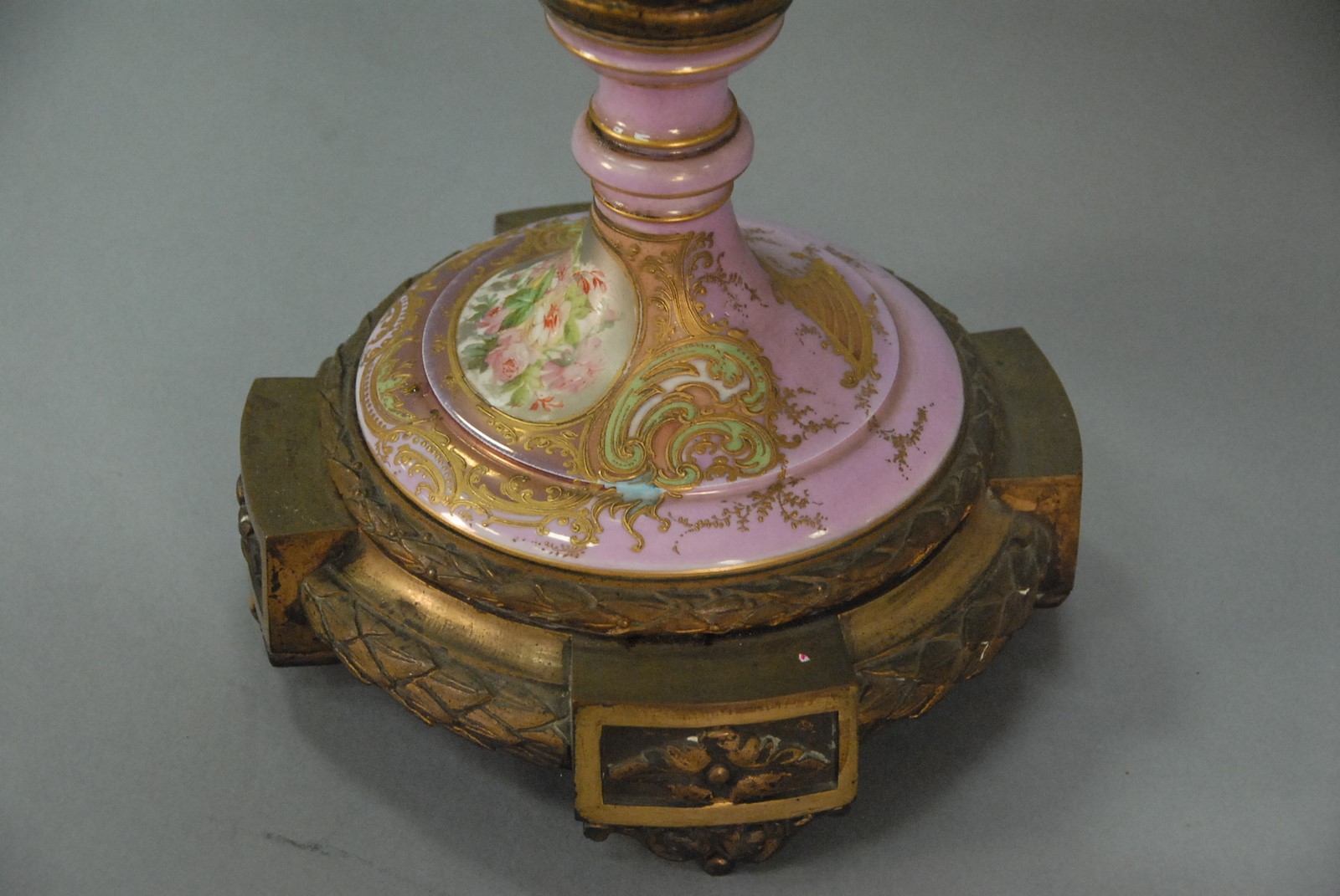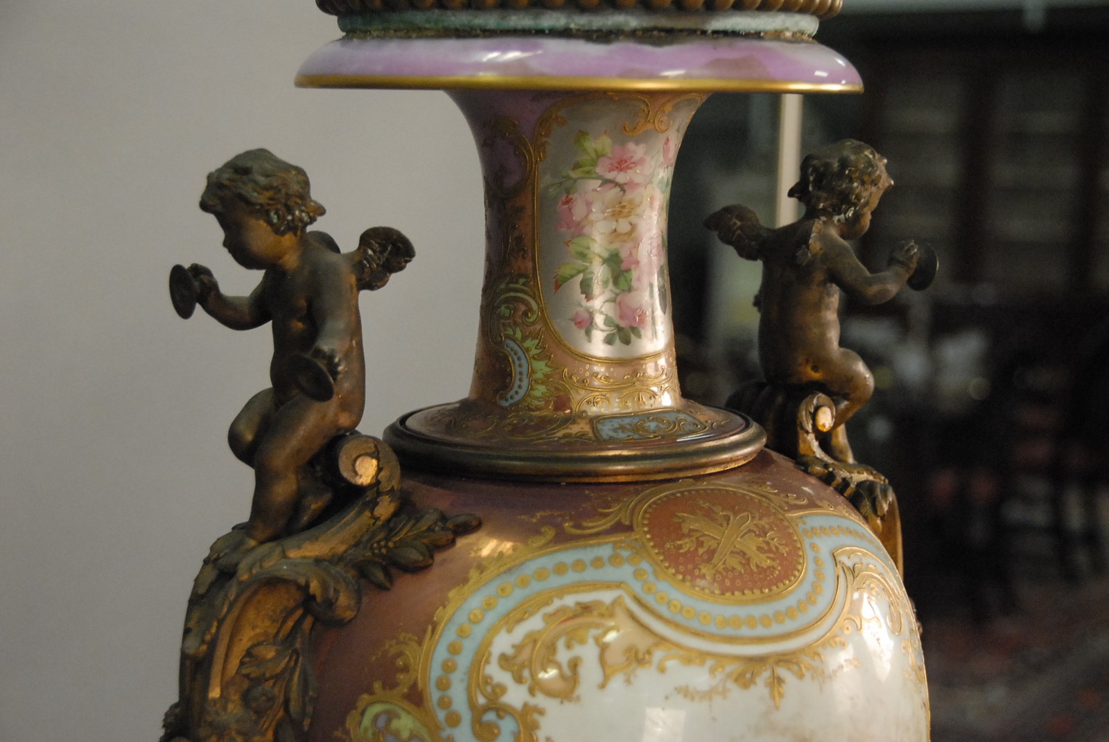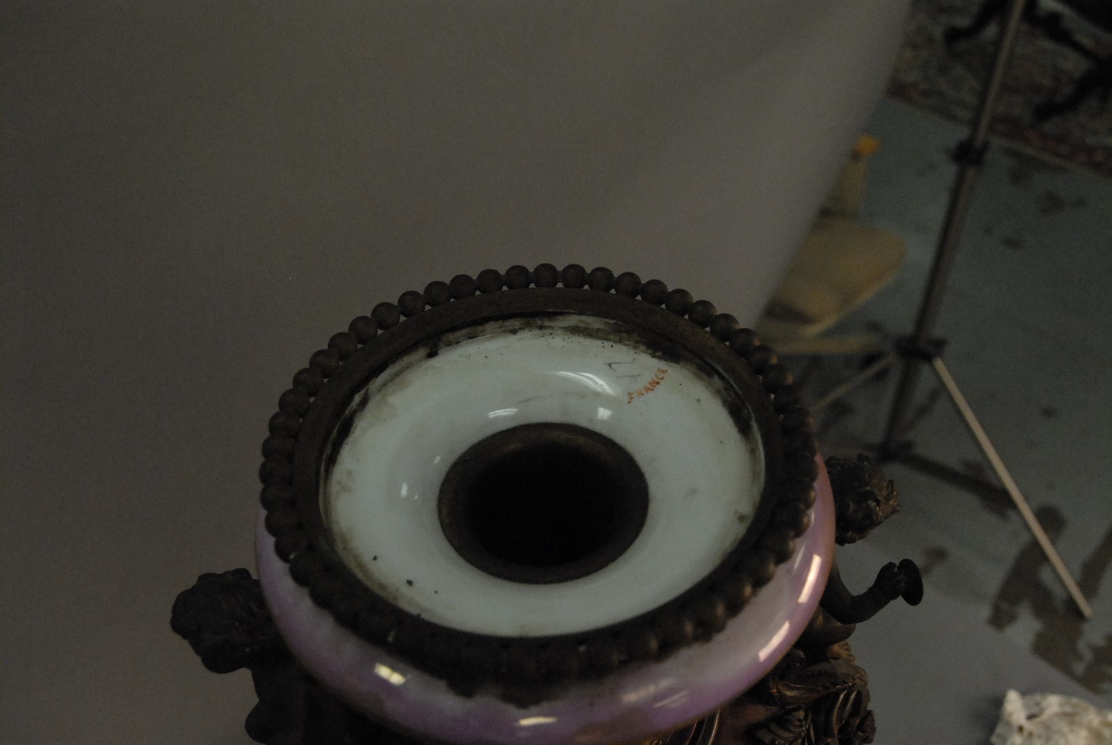 Sevres style gilt bronze mounted porcelain urn in baluster form having pink ground and painted cartouche depicting woman figure and cherubs on one side and landscape on the other, signed Collat, having heavy gilt decoration of scrolling leaves and flowers no cover. urn ht. 31 1/4 in. total ht. 35 1/2 in.