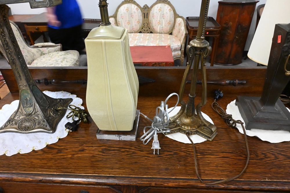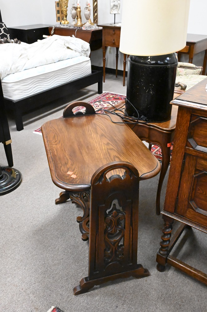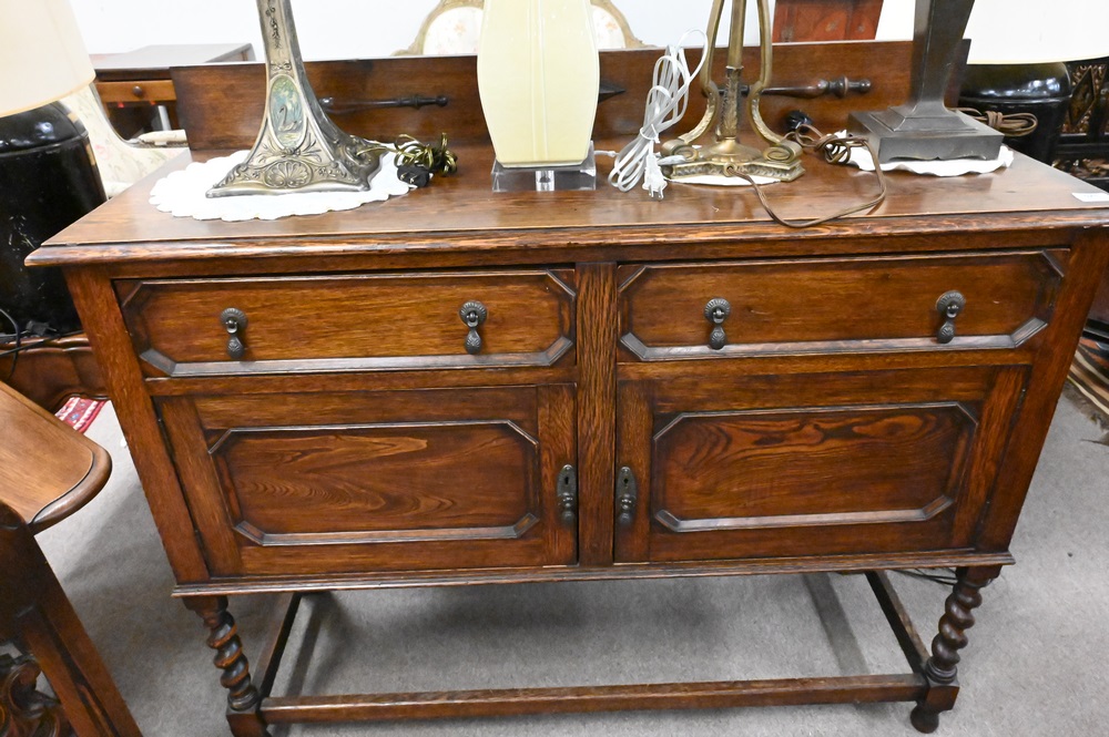 Two Piece Lot, to include an oak sideboard, along with an oak occasional table, paper label under smaller piece, barley twist legs; height 41 inches, top 17 1/2″ x 48″.