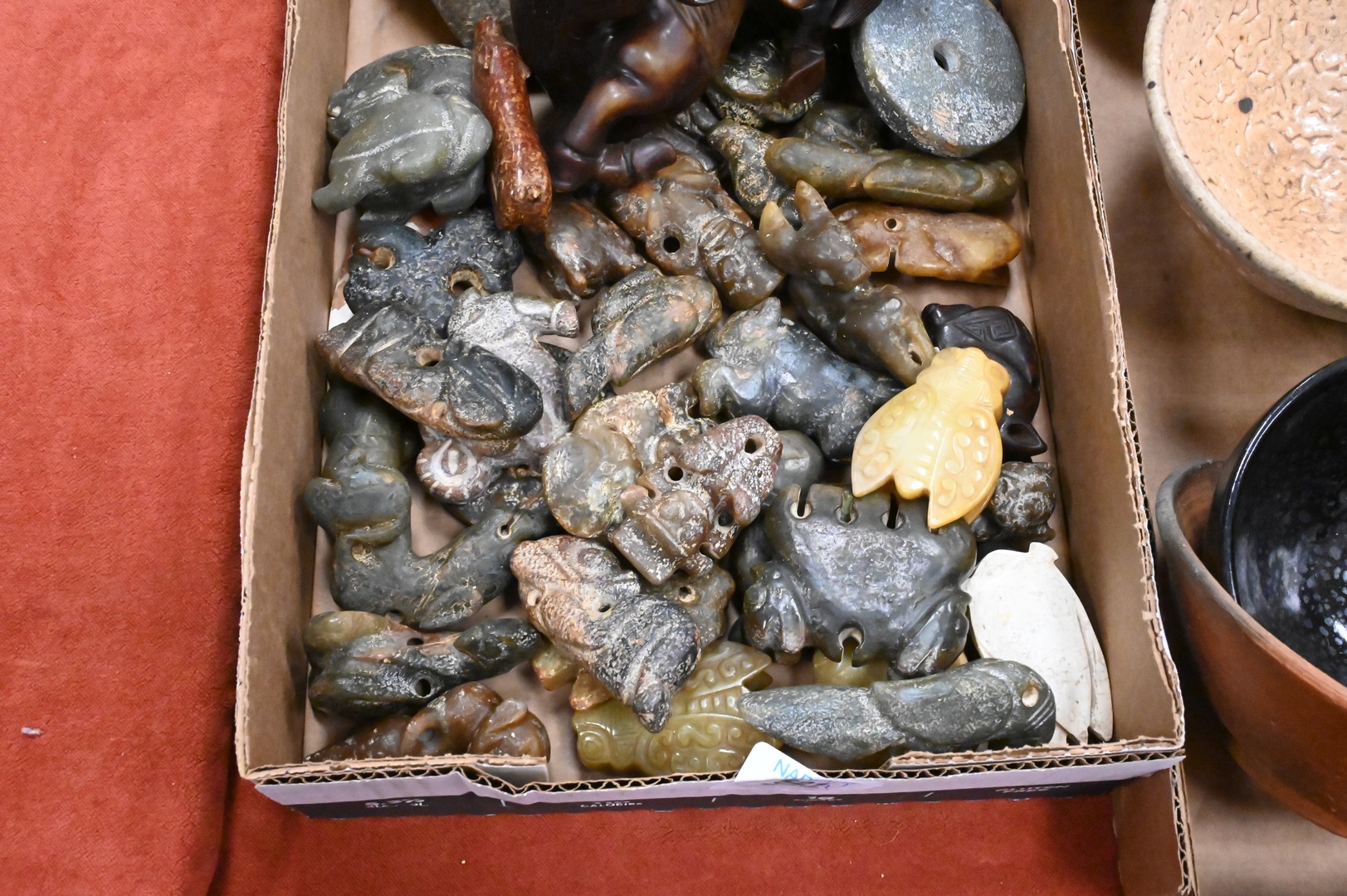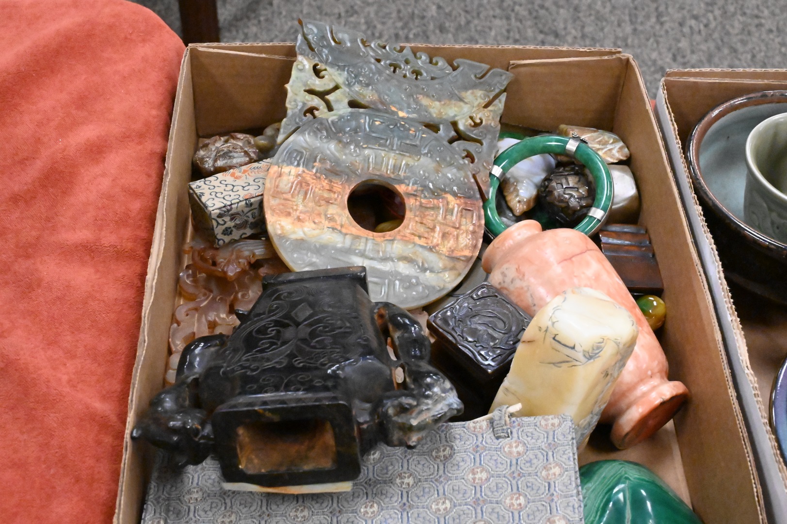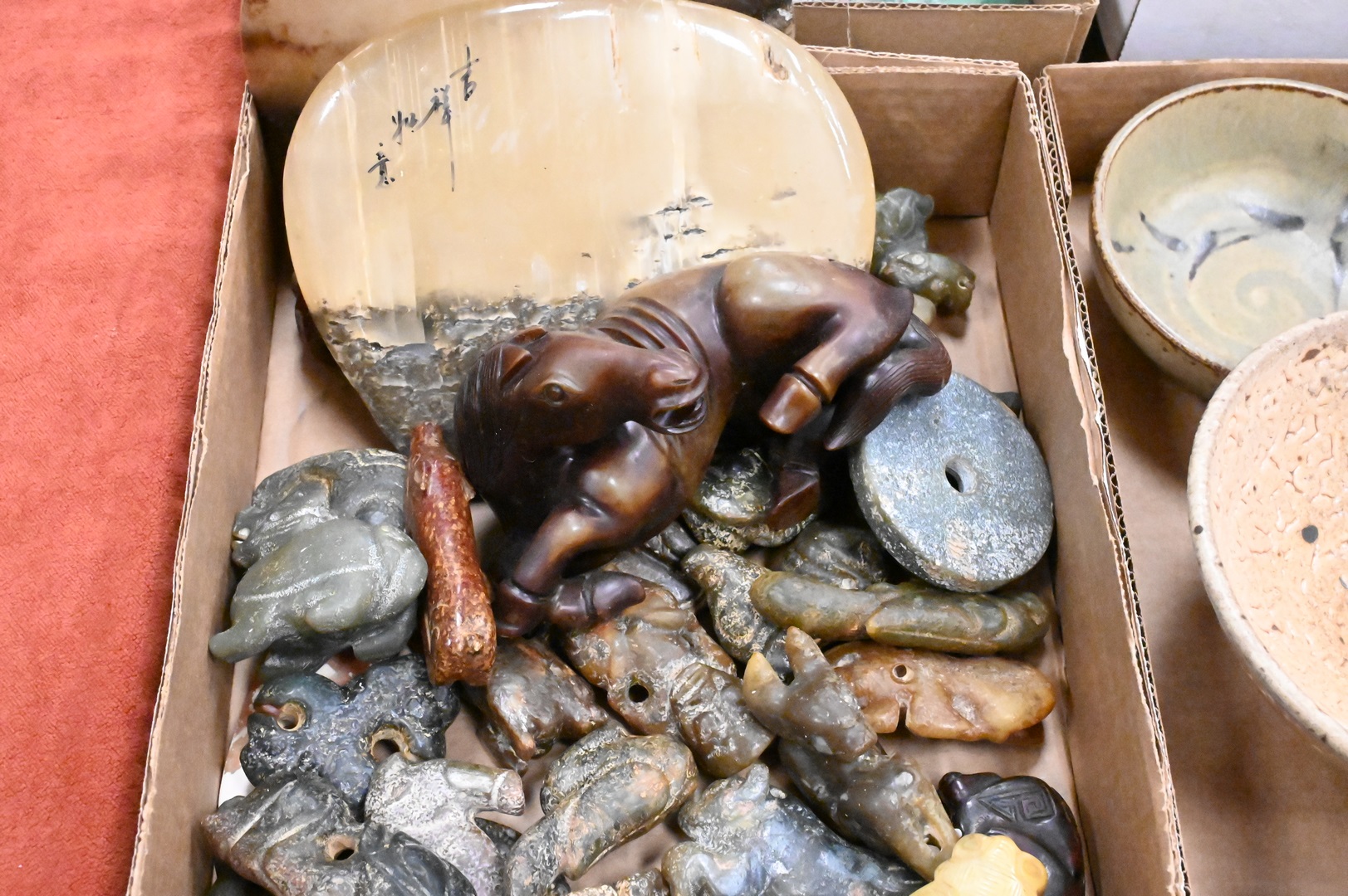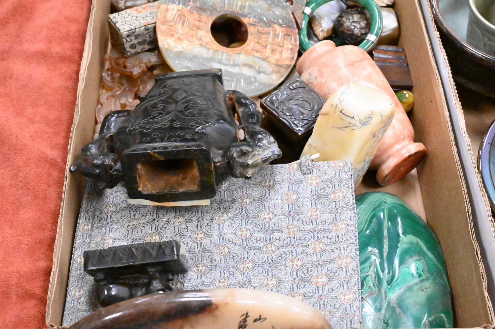 Two Tray Lots of Chinese Carved Stone Items, to include small figures, plaques, urns etc.