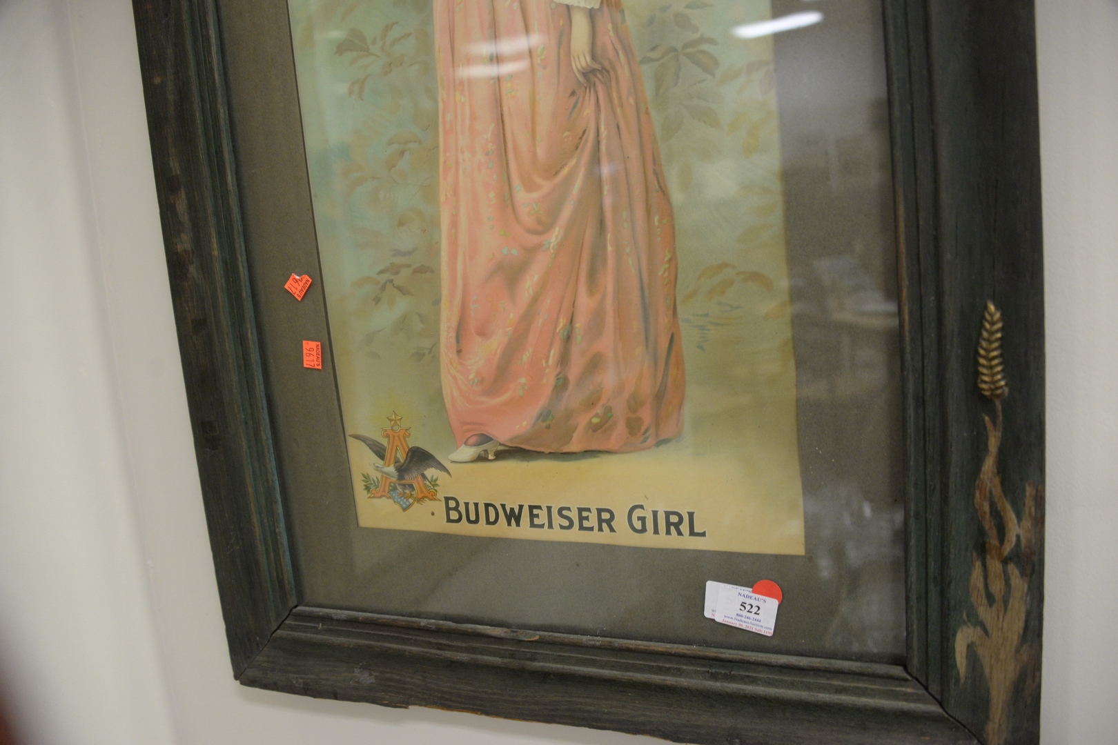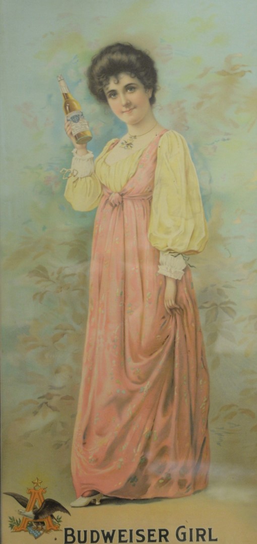 Lot 522: Anheuser Busch Budweiser Girl cardboard advertising sign 27 1/2 x 13 Provenance: From the Marjorie & Howard Drubner Collection, M…