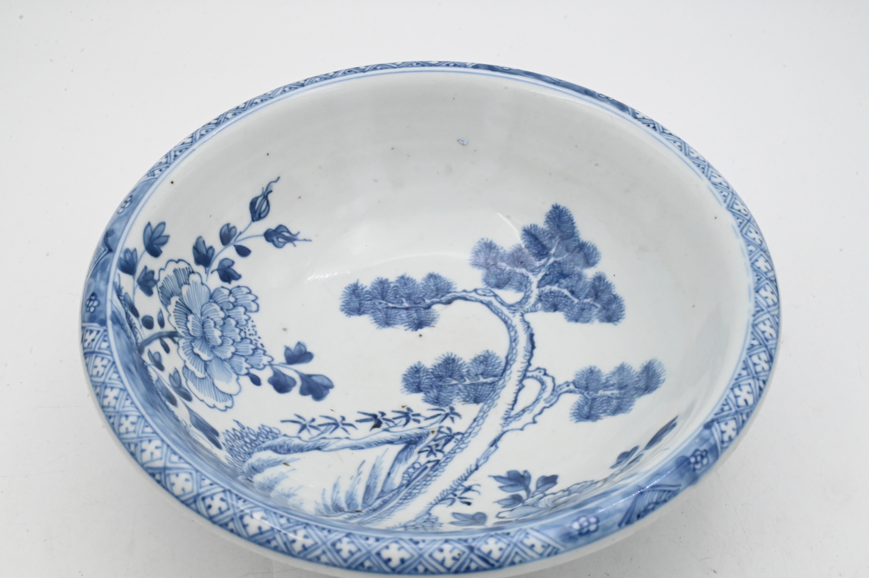 deep porcelain bowl, the interior decorated with a pine tree and peony floral scene within a diaper border, the exterior with floral sprays and double circle at base. With dealer’s label to underside