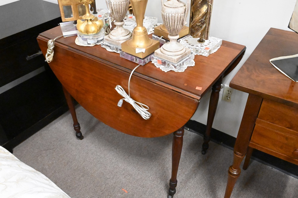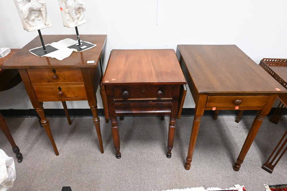 Four Piece Lot, to include one drop leaf, two drawer drop leaf, one two drawer stand along with a single drawer stand.