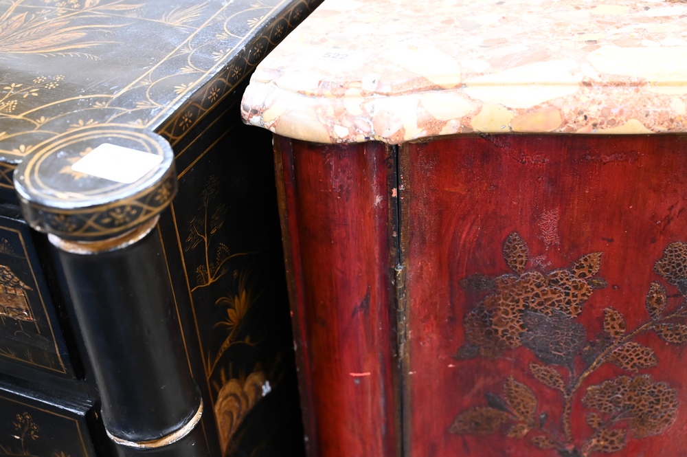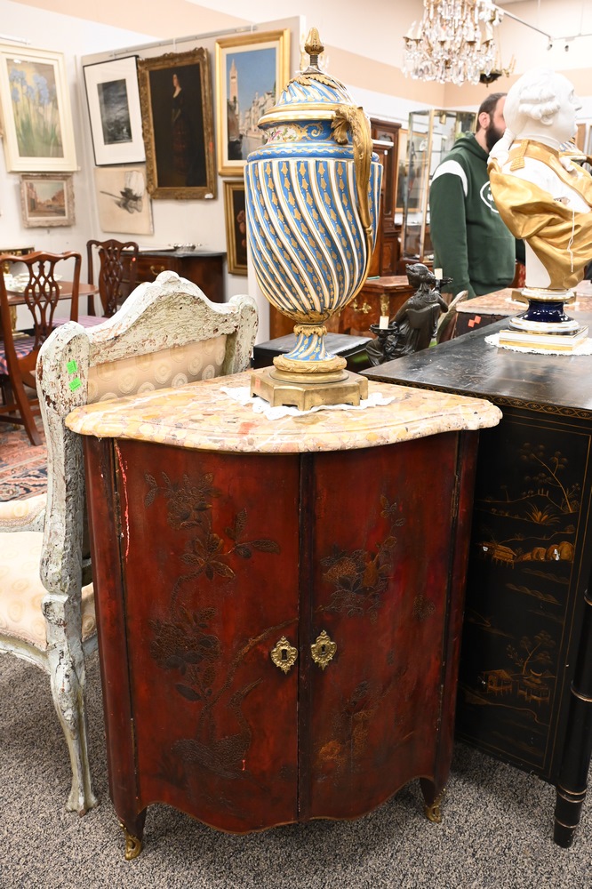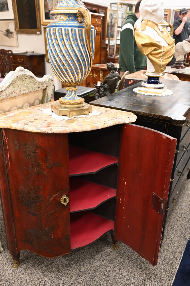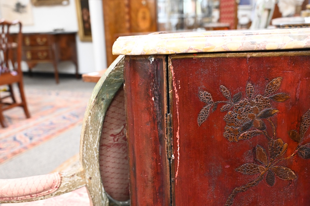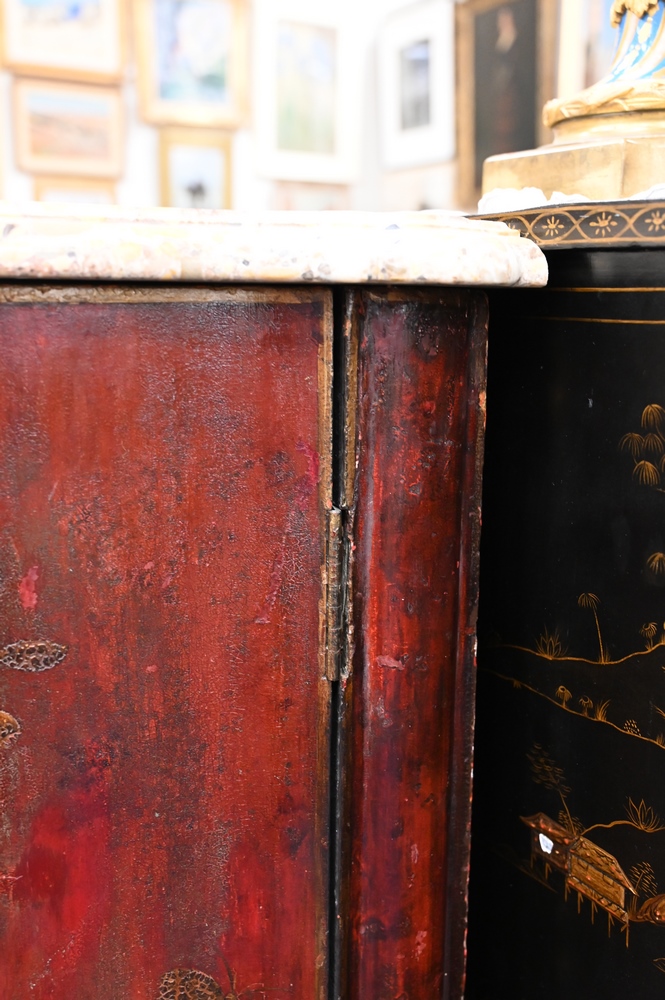 Lot 522: Pair of Louis XV Style Marble Top Corner Cabinets, having two doors, chinoiserie decorated with red background, height 35 1/4 inches…