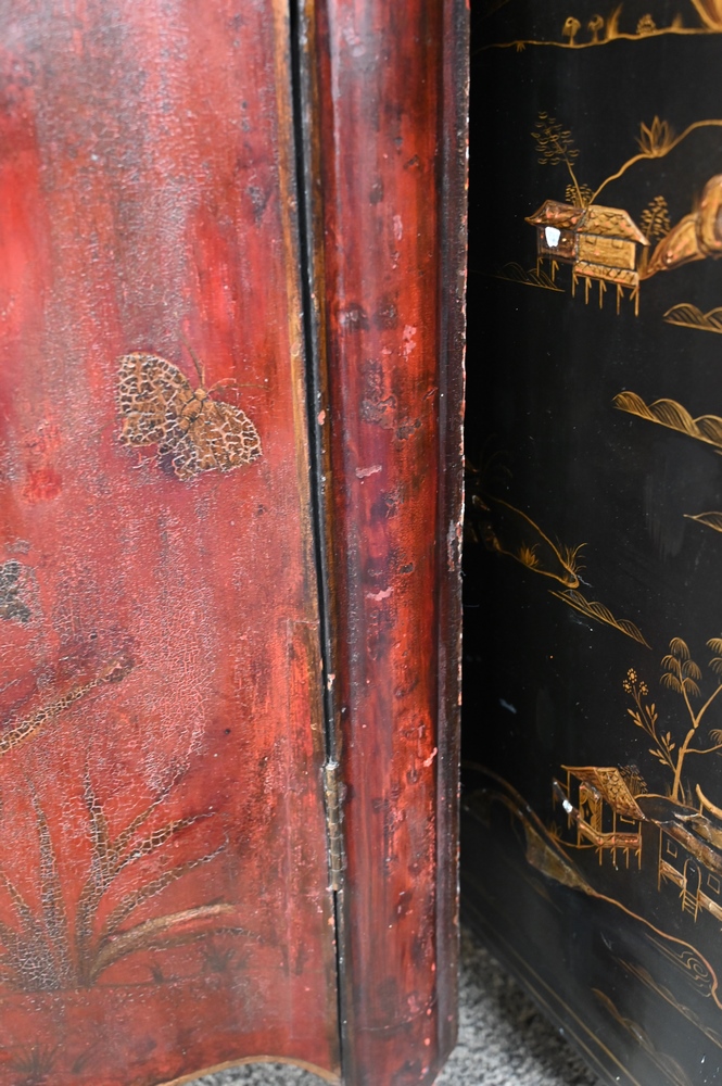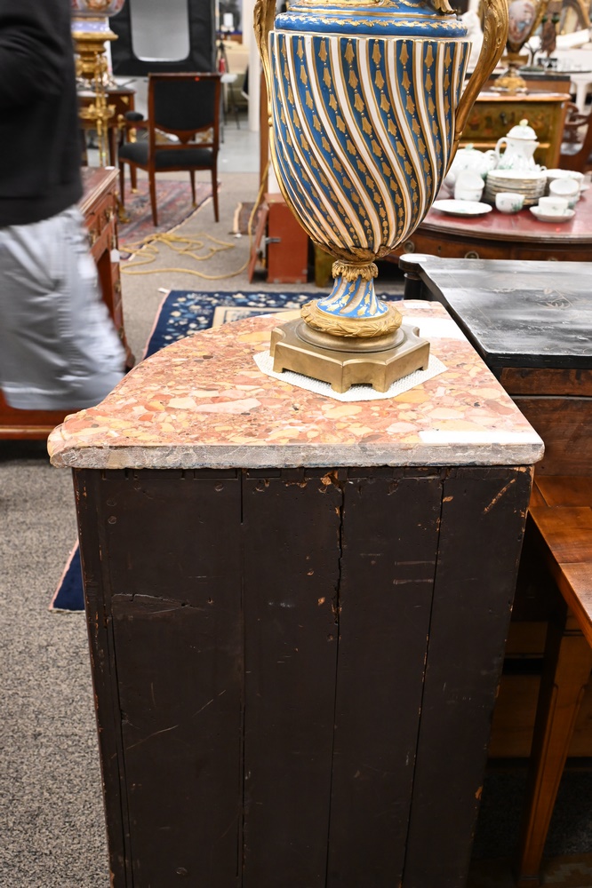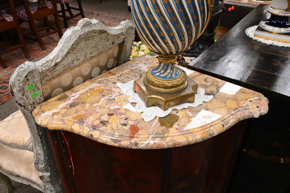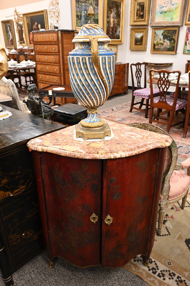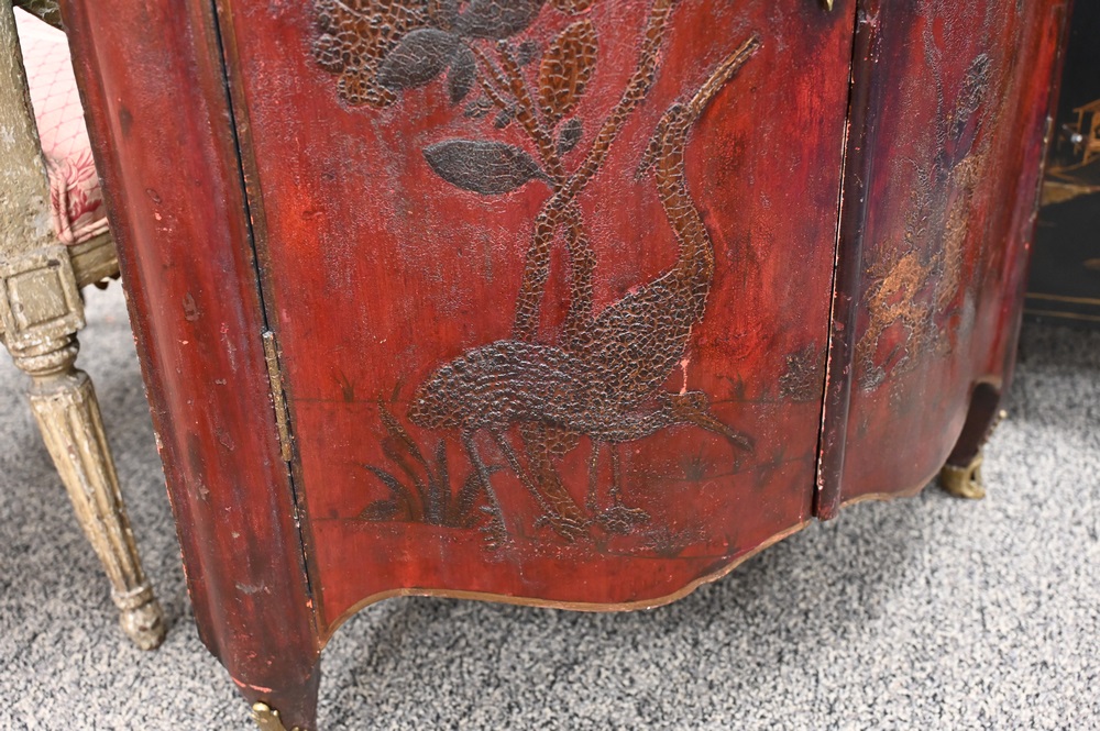 Lot 522: Pair of Louis XV Style Marble Top Corner Cabinets, having two doors, chinoiserie decorated with red background, height 35 1/4 inches…