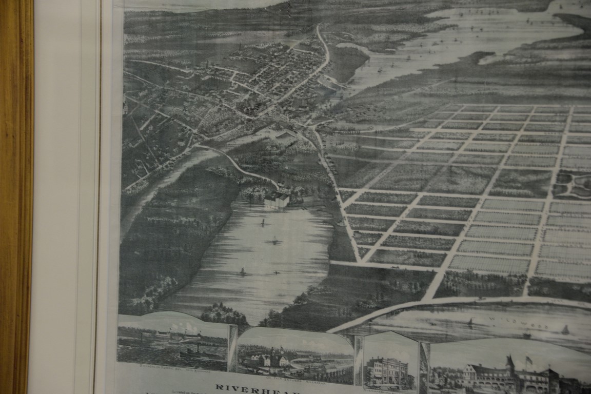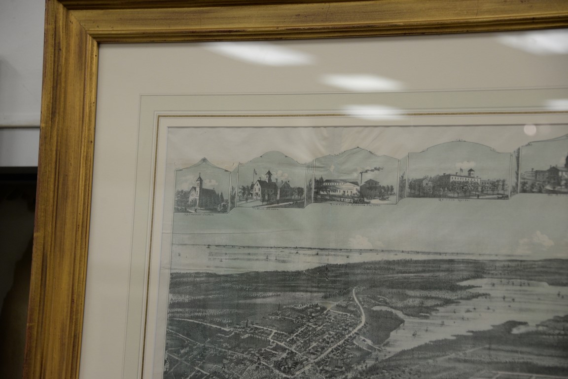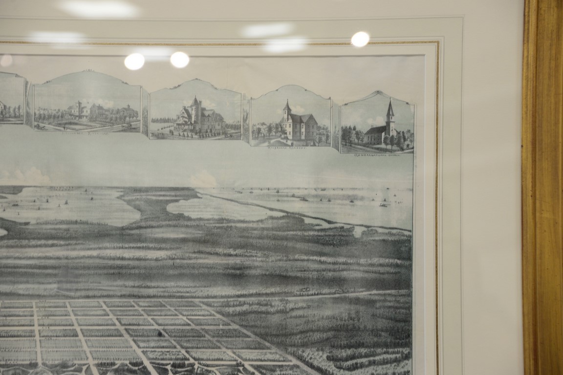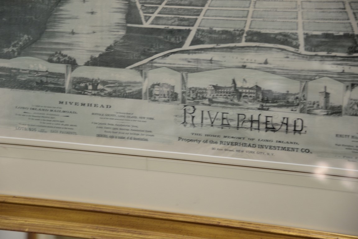 Survey map lithograph, Riverhead, The Home Resort of Long Island, Property of the Riverhead Investment Co., map showing sixteen Vignettes or important local buildings and scenes including steamers in Peconic Bay, Long Island, circa 1890, sight size 23 1/2 x 34 1/4. Provenance: Property from Credit Suisse’s Americana Collection