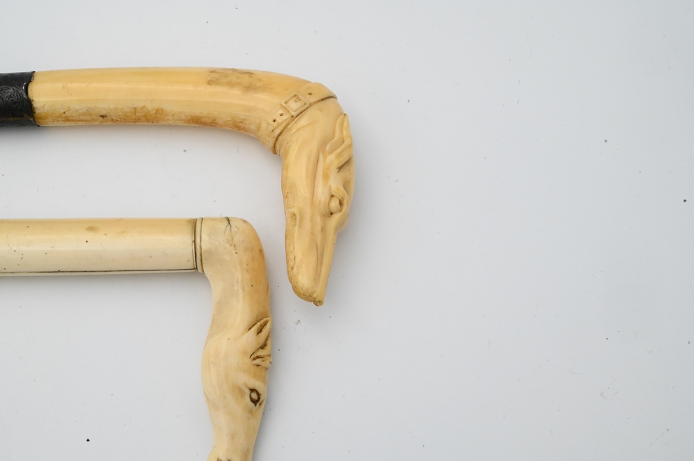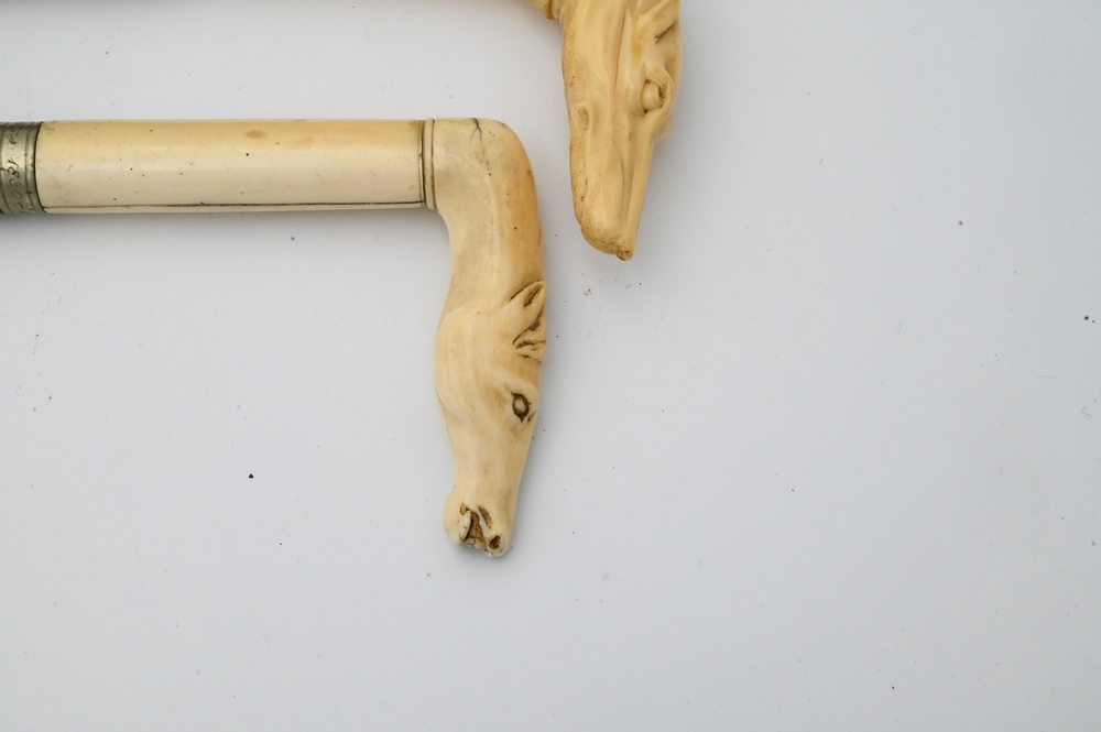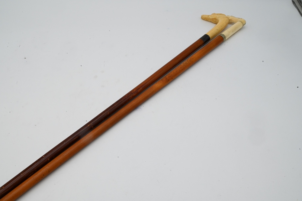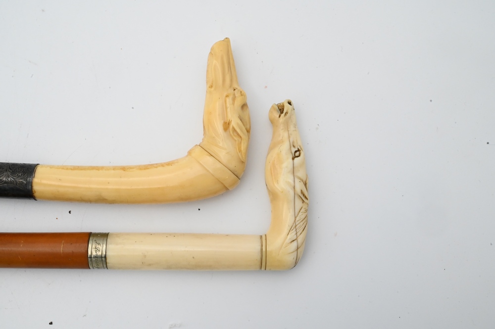 Two Canes Having Ivory Heads, dog head and horse head having silver band, marked J. Deming Perkins 1830 – 1911, circa 1911, lengths 33 and 34 1/2 inches. Please note: Items containing ivory cannot be purchased or shipped by bidders residing outside of the United States or California, Hawaii, Nevada, New Jersey, New York, Washington, Oregon, or District of Columbia. If an ivory item is purchased by a bidder in one of the above mentioned locations or attempts to ship ivory to one of the above mentioned locations, bidder will forfeit the item and be responsible for any incurred fees such as a restocking fee.