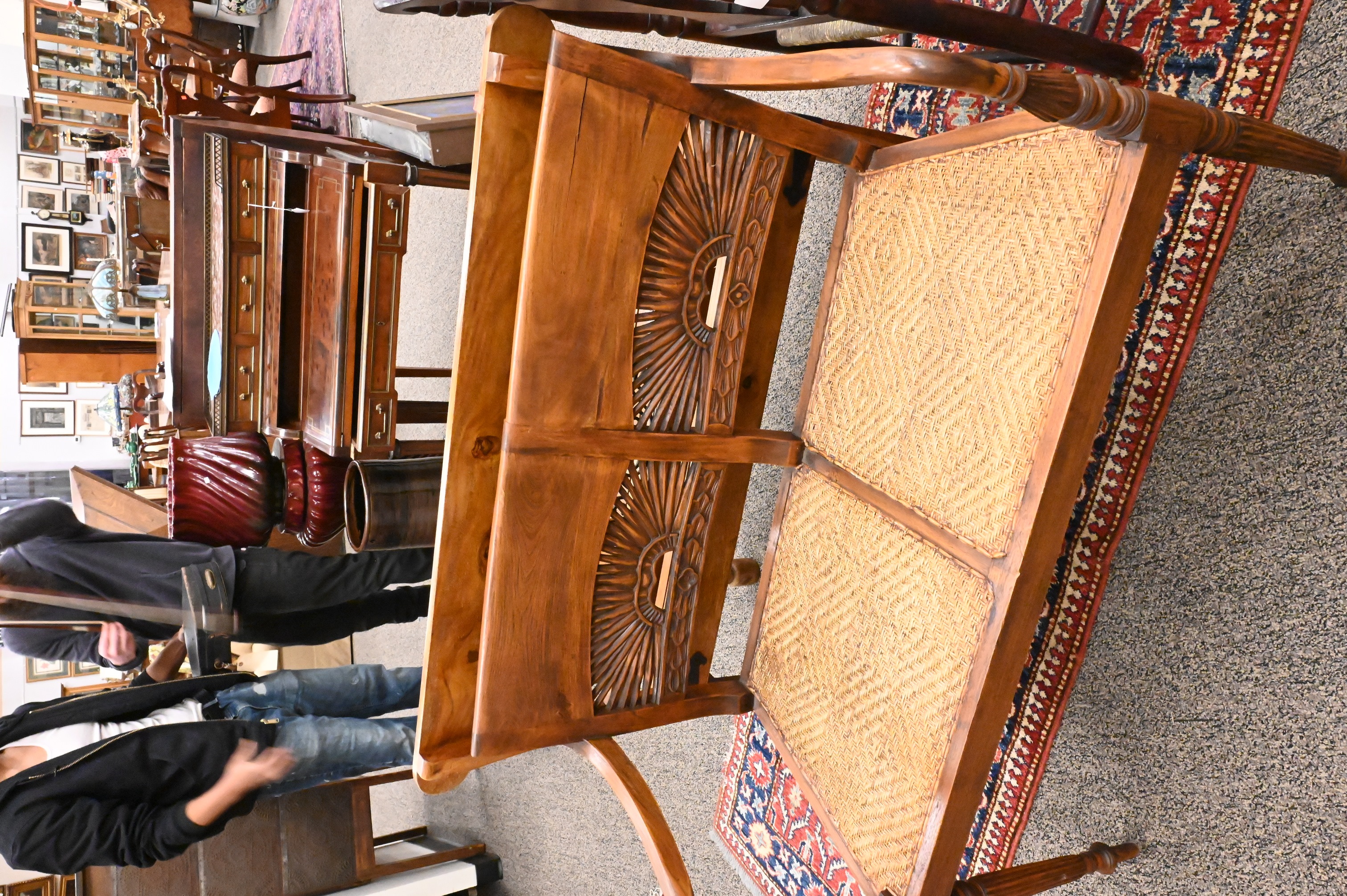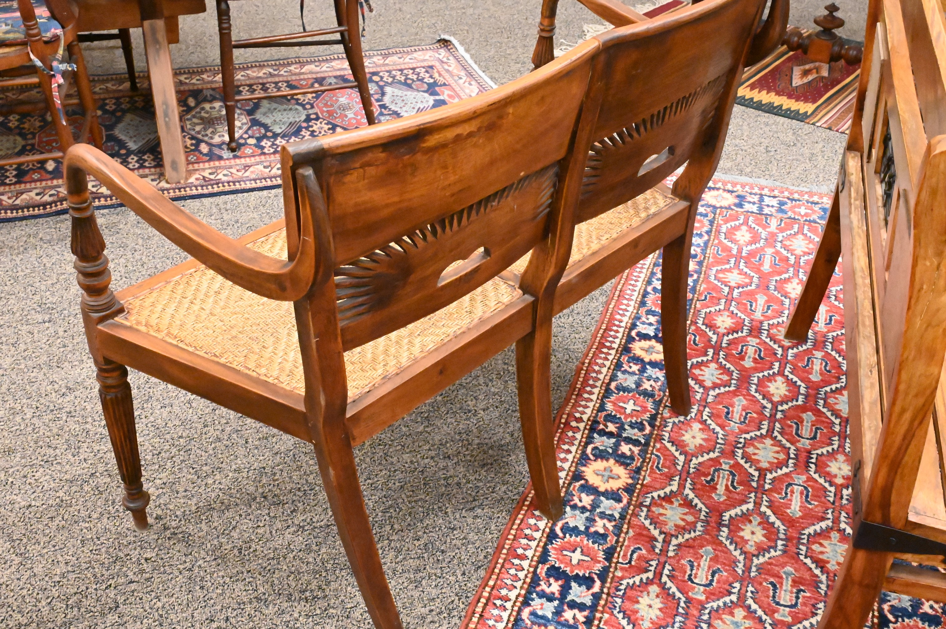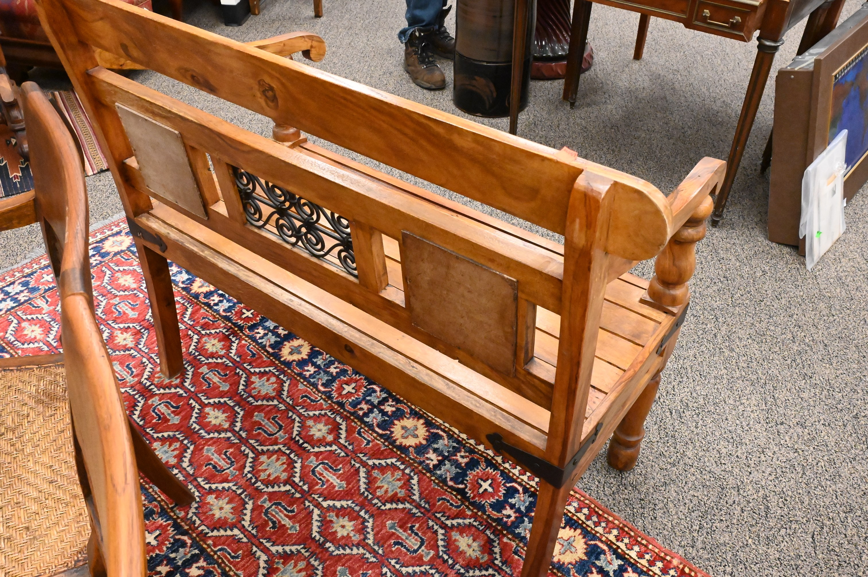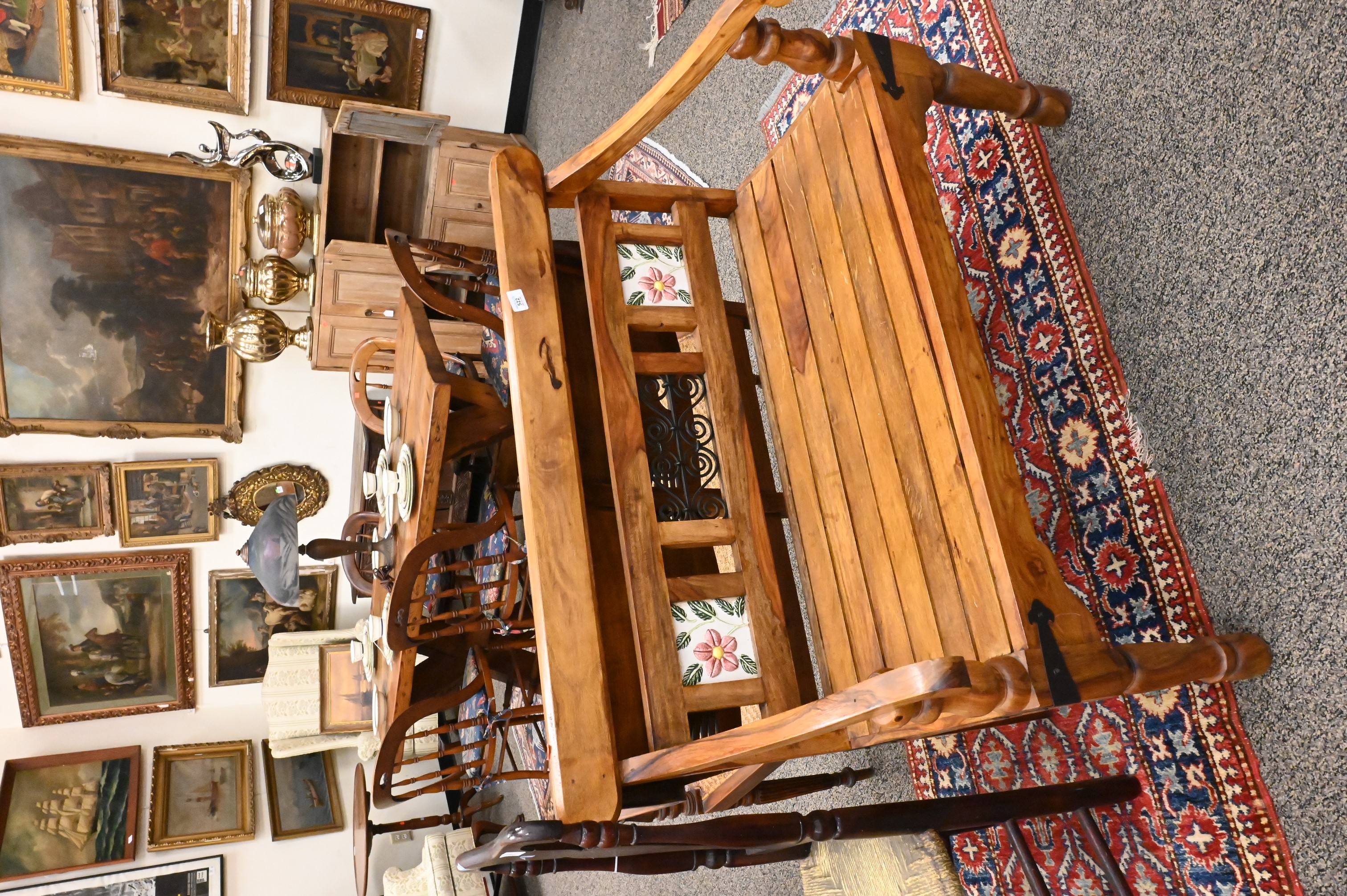 one having tiles and iron strapping, along with a Sheraton style bench having rush seat