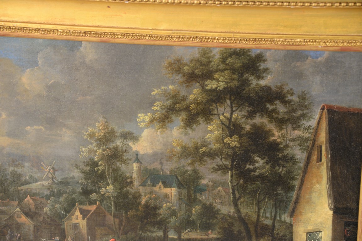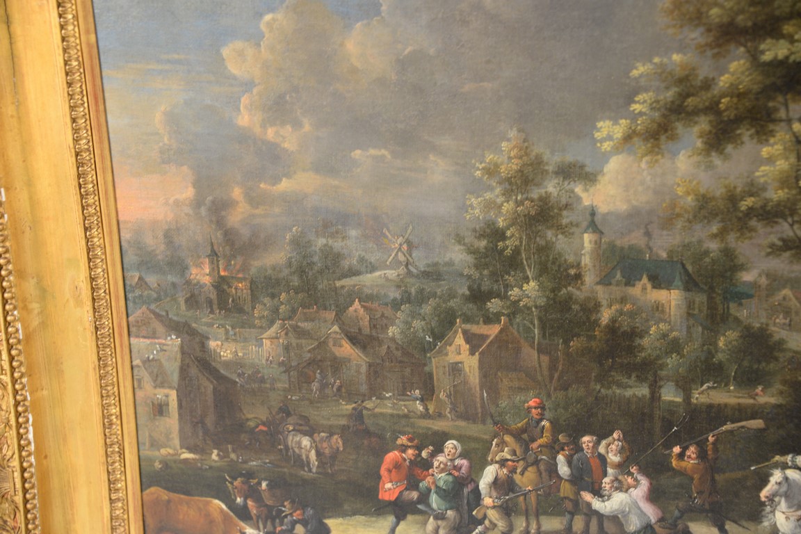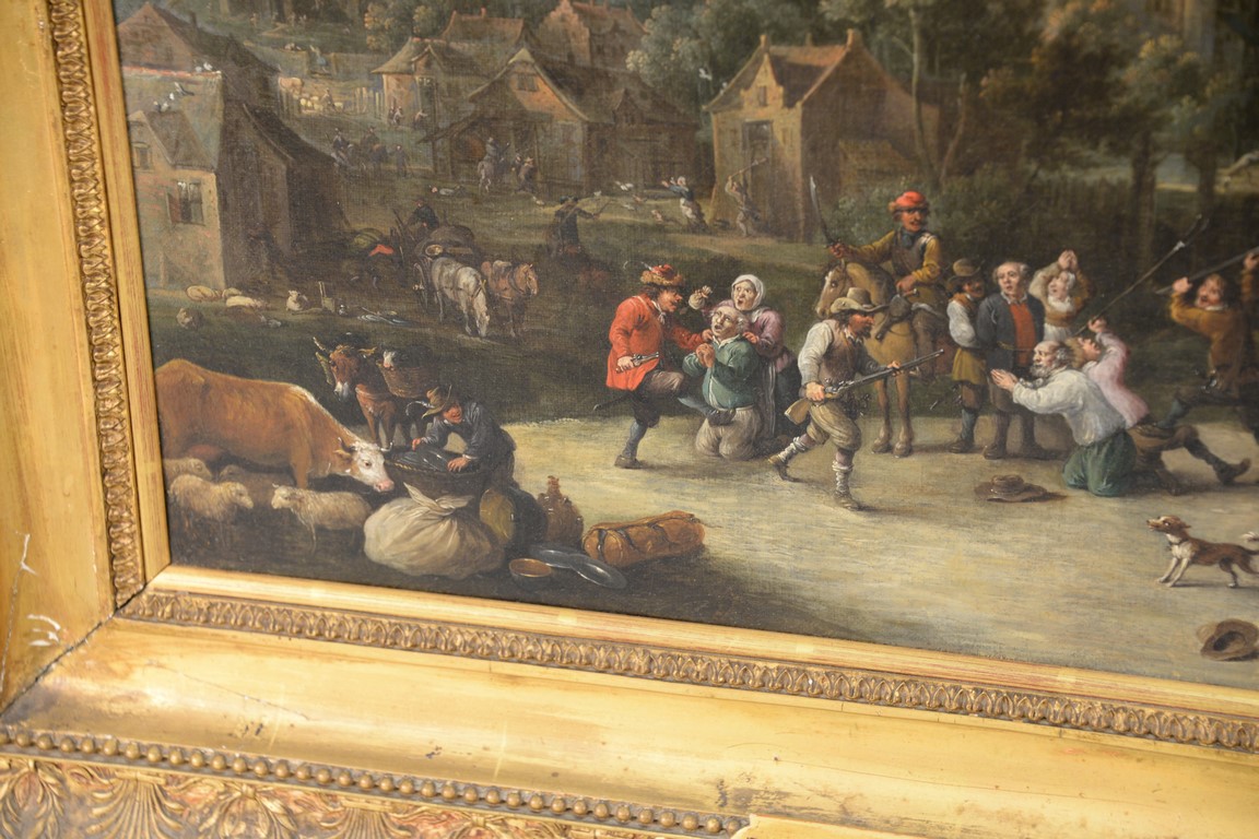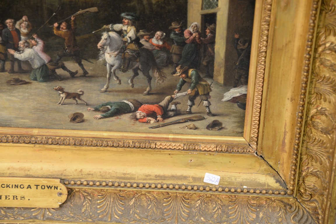 Lot 522A: Teniers oil on canvas Banditti Sacking a Town signed lower right: Teniers marked on reverse: The Studio Pictures by Ten…
