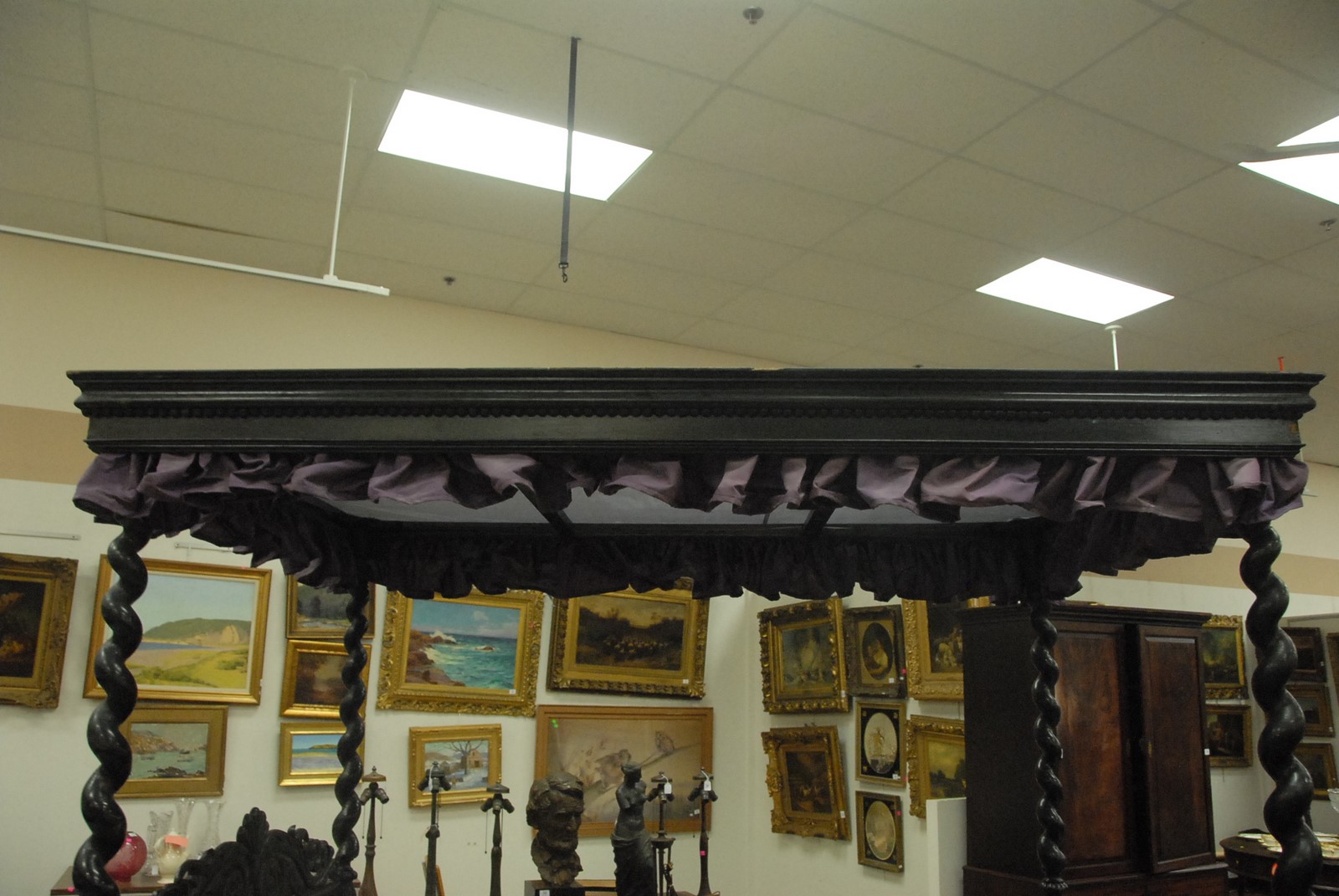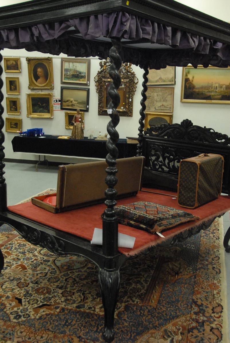 Lot 523: Anglo Indian four post bed with spiral turned posts, flat canopy top with carved side rails, pierced carved headboard, and carved cabriole legs, was originally caned, now fitted with wooden top, ebonized, probably early 19th century. lg. 78 in. wd.