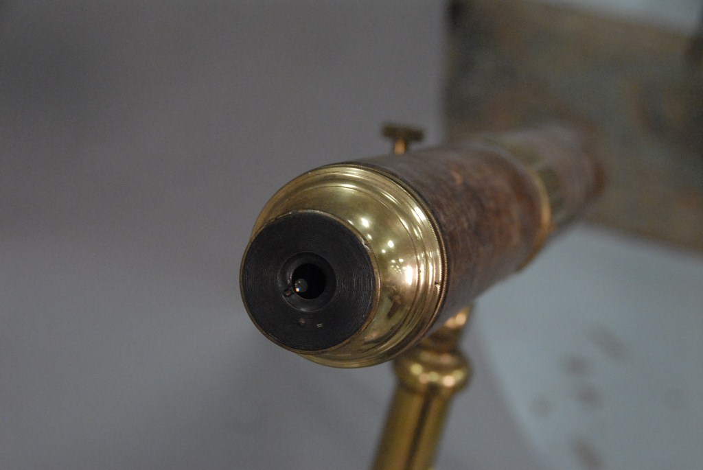 Brass two draw tripod telescope with leather covering tapering outer body tube signed Thomas Jones 1816-1850 62 Charing Cross London. Provenance: From prominent Woodbridge, Connecticut family collection.