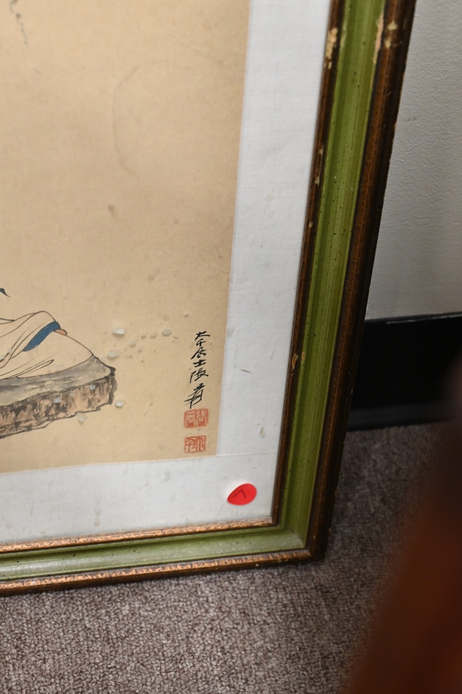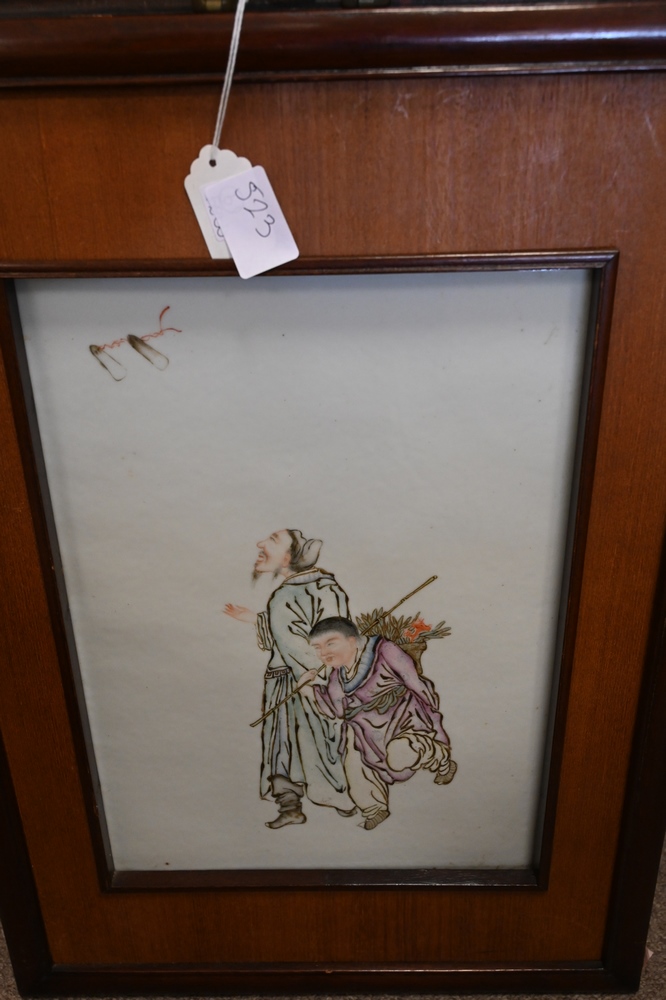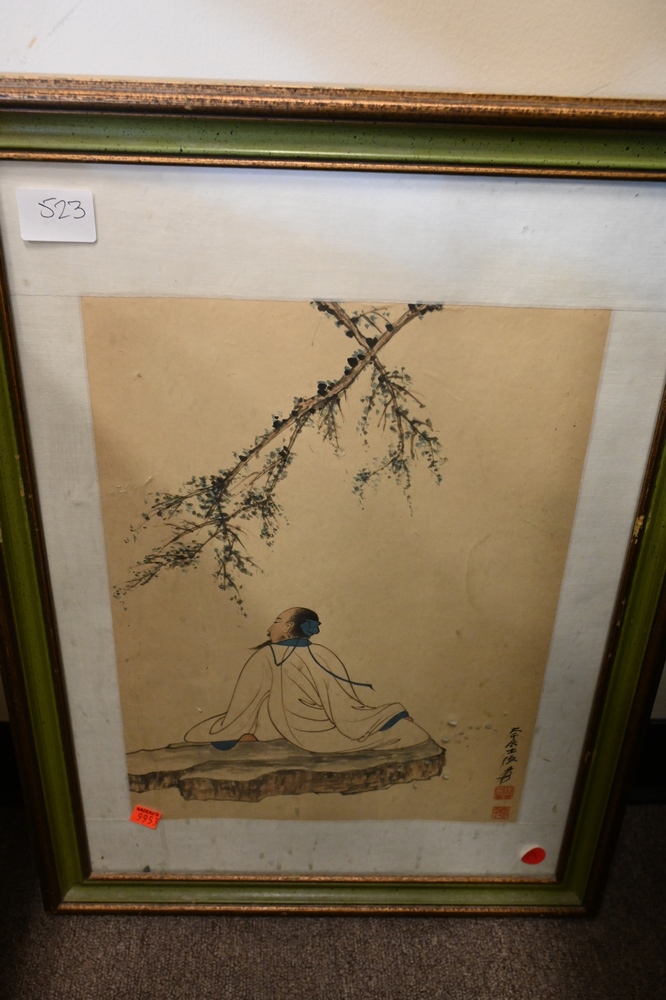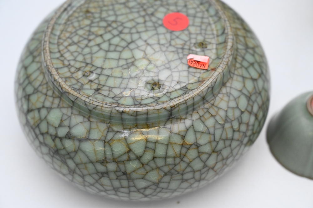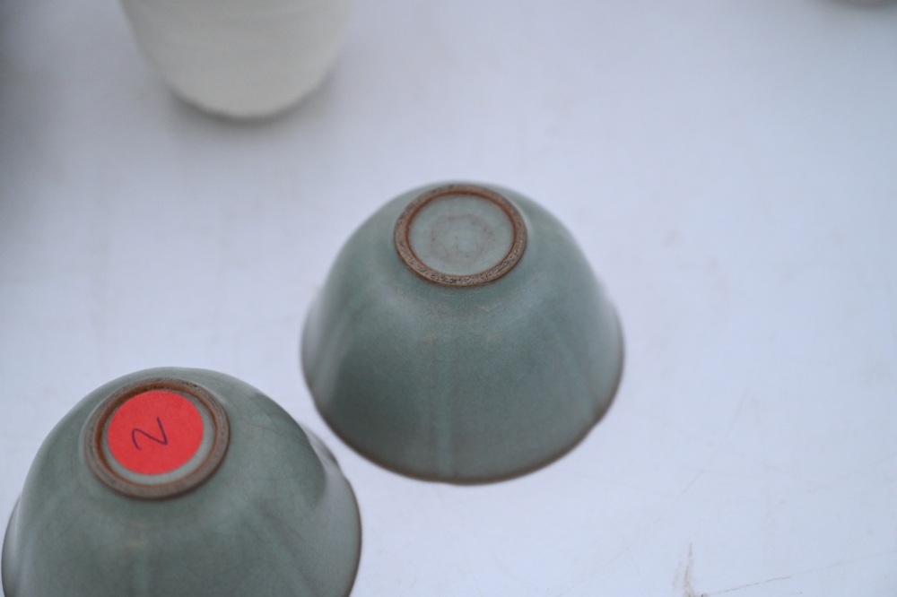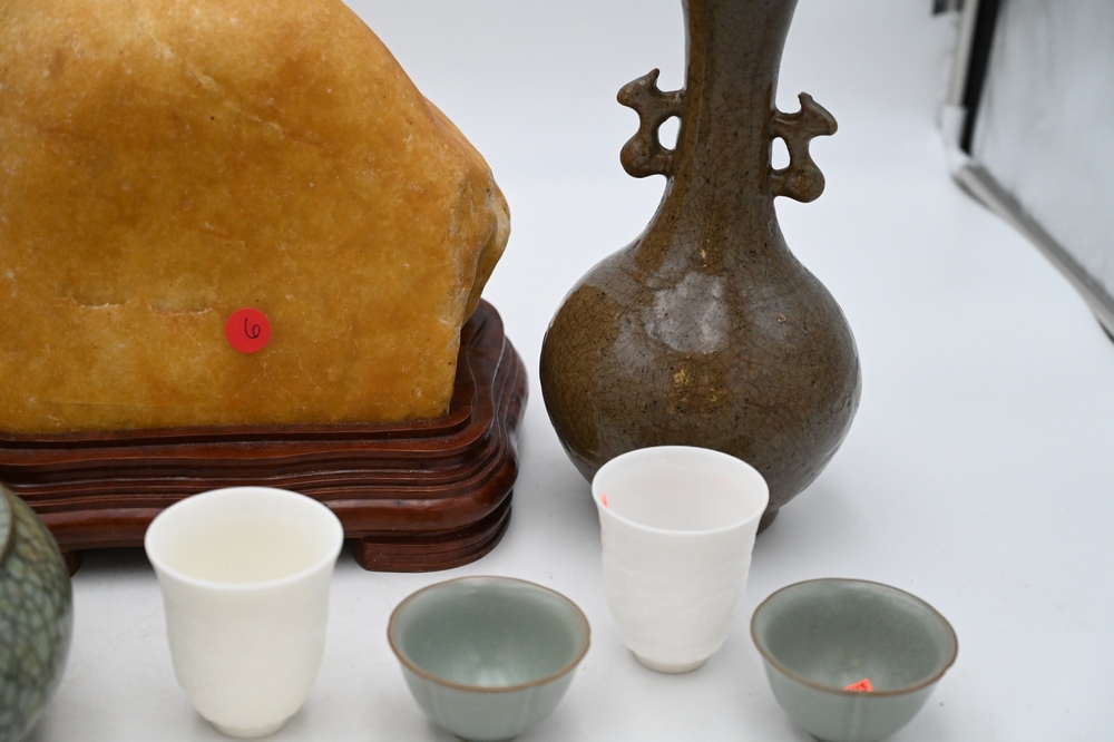 Lot 523: Group of Ten Chinese Ceramic and Porcelain Items, to include a crackle glazed celadon bowl; a pair of celadon glazed small cups; a pair of white cups; a porcelain stem cup; porcelain Chinese plaque; framed scroll; along with a crackle glazed vase, possible jade stone; sizes ranging from 1 1/2 to 10 1/2 inches.