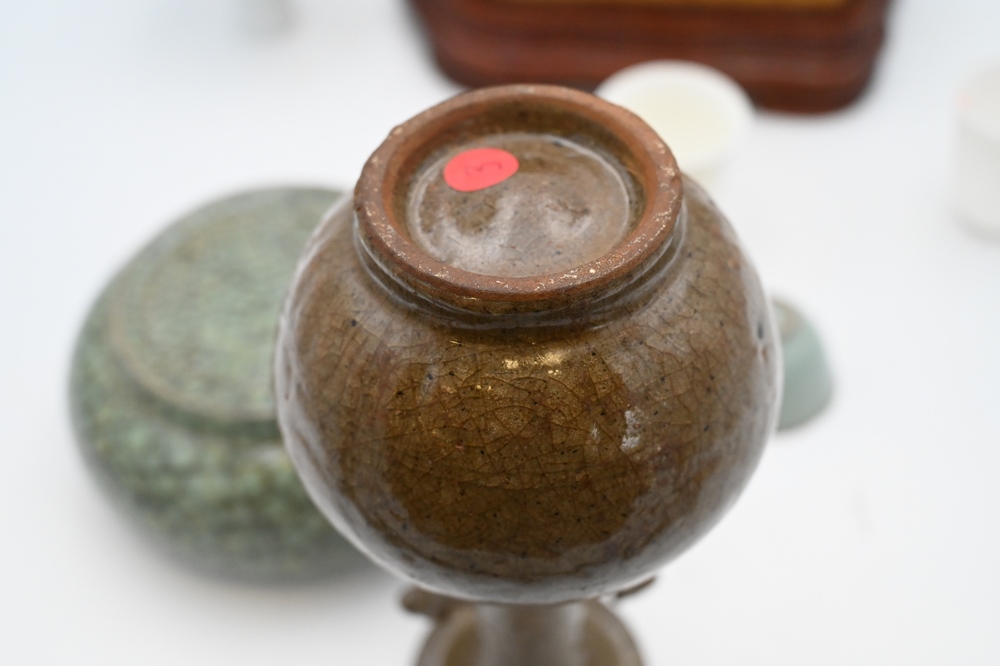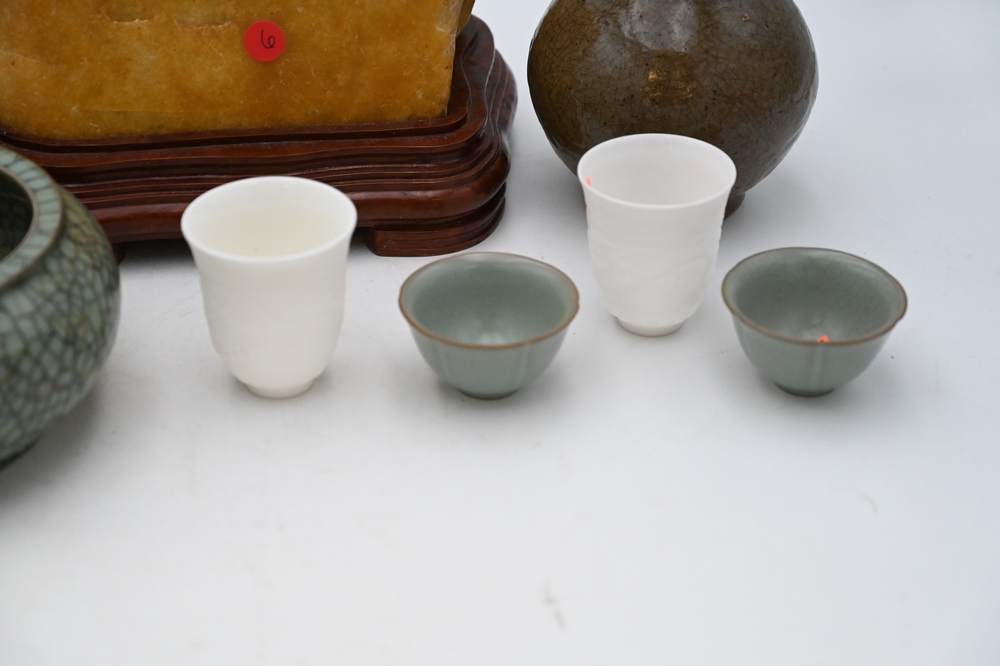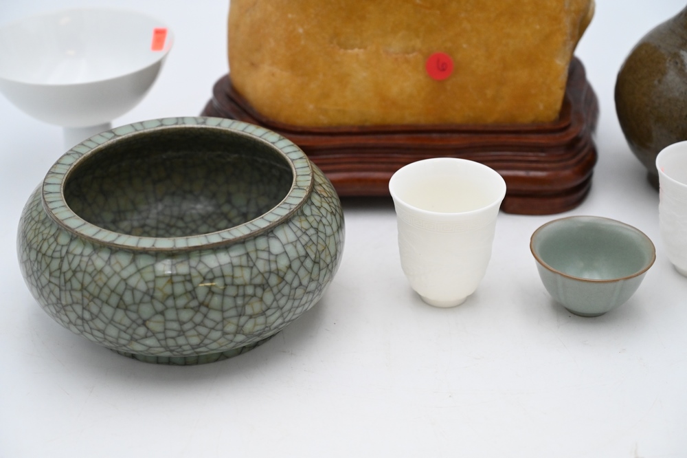 Group of Ten Chinese Ceramic and Porcelain Items, to include a crackle glazed celadon bowl; a pair of celadon glazed small cups; a pair of white cups; a porcelain stem cup; porcelain Chinese plaque; framed scroll; along with a crackle glazed vase, possible jade stone; sizes ranging from 1 1/2 to 10 1/2 inches.