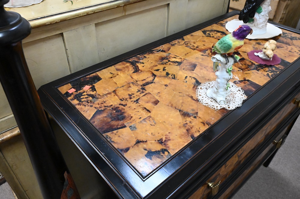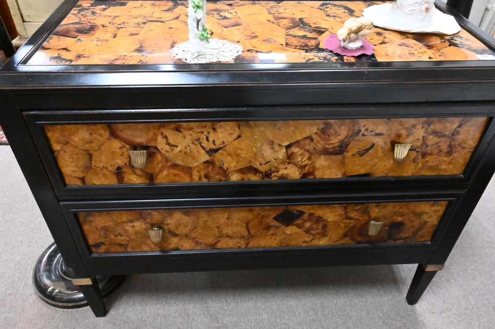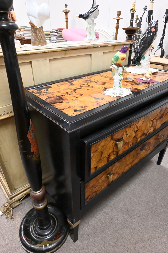 John Richard Two Drawer Commode, inset with faux tortoise shell, height 35 1/2 inches, top 20″ x 45″.
