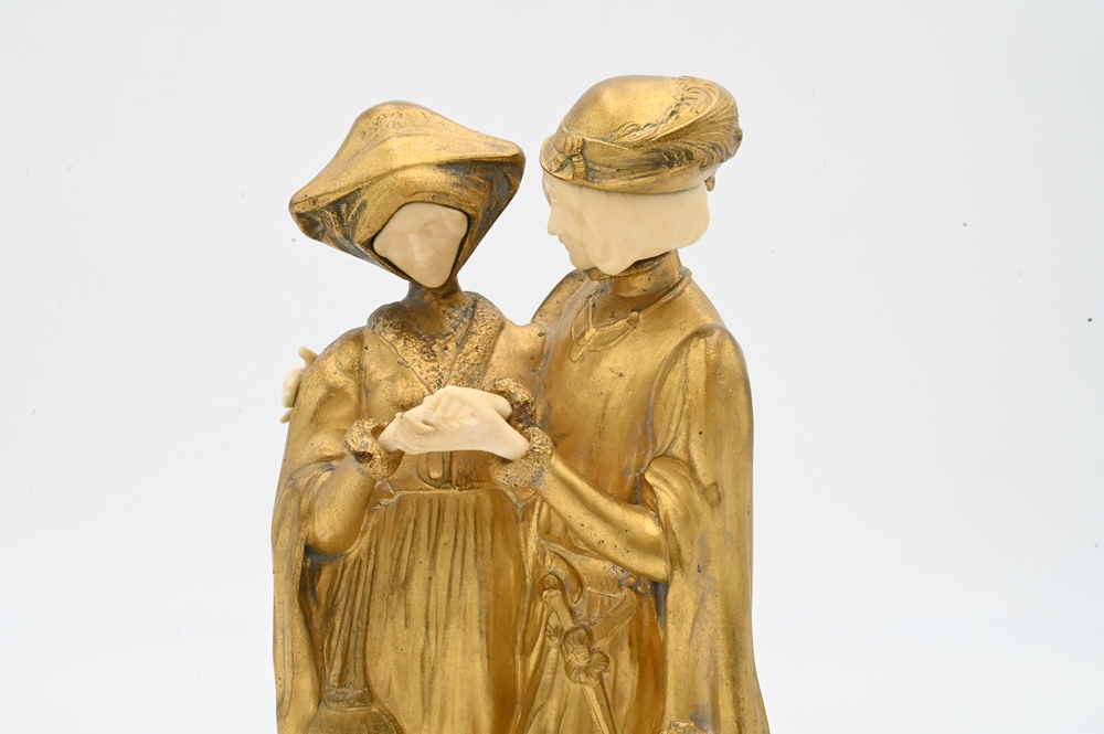 Lot 523: Louis Sosson (1905 – 1930), courtly lovers in late medieval costume, gilt bronze on onyx base, signed on back of dress L. Sosson, height 10 1/2 inches.