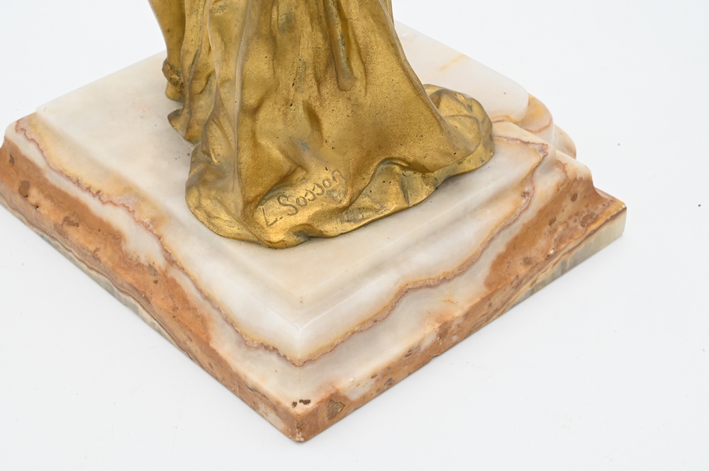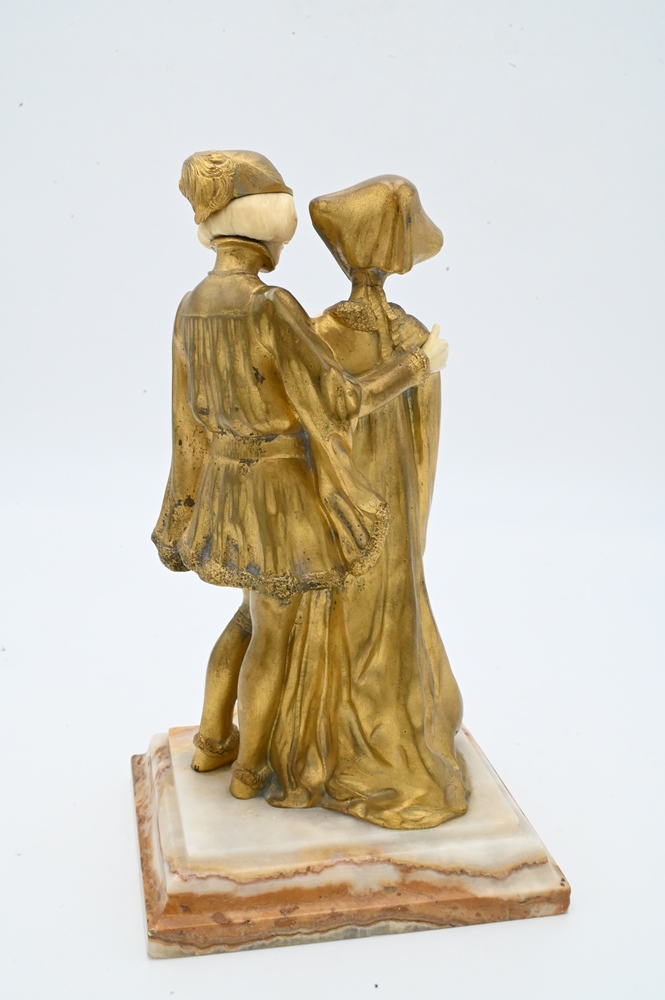 Louis Sosson (1905 – 1930), courtly lovers in late medieval costume, gilt bronze on onyx base, signed on back of dress L. Sosson, height 10 1/2 inches.