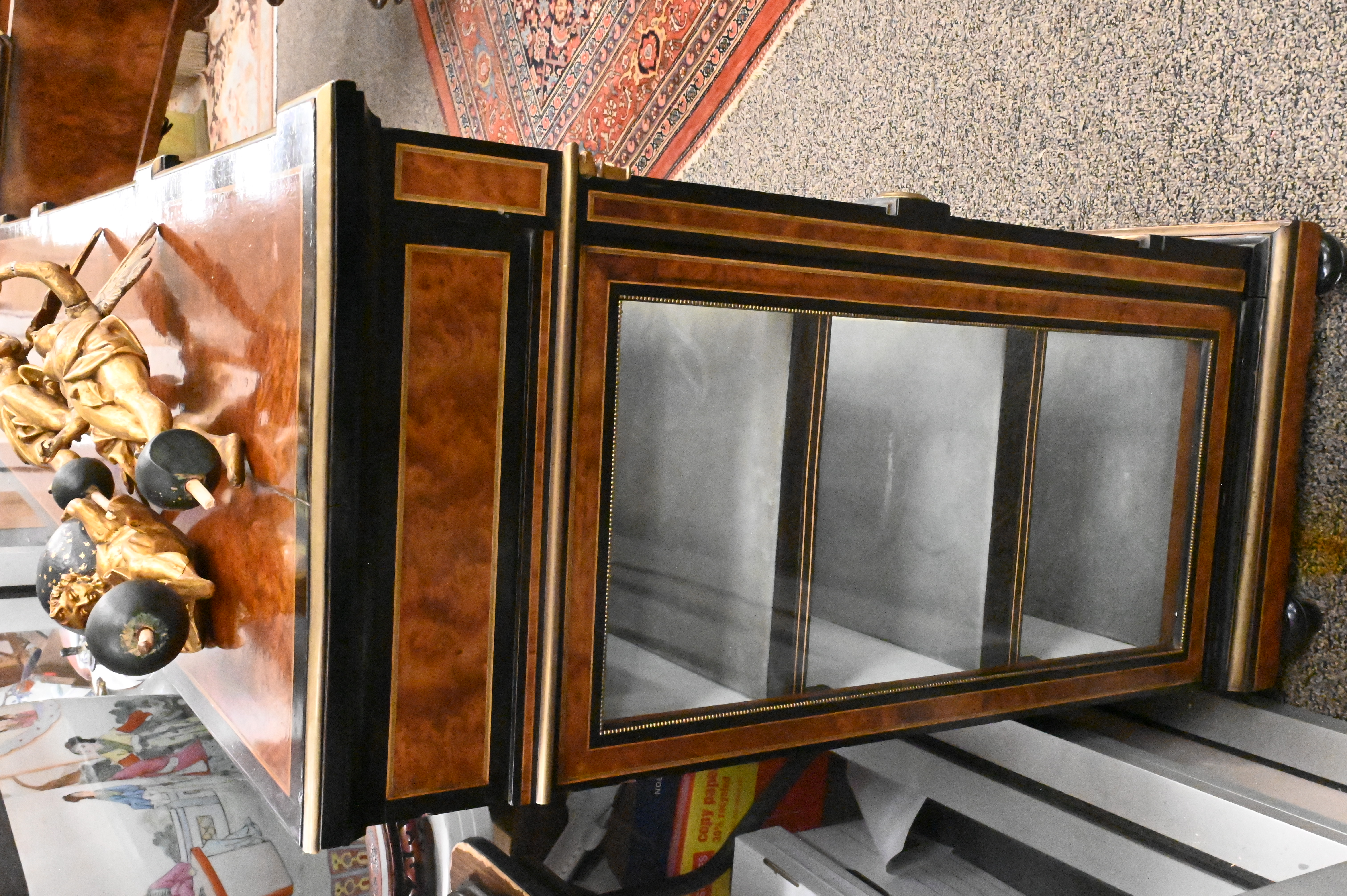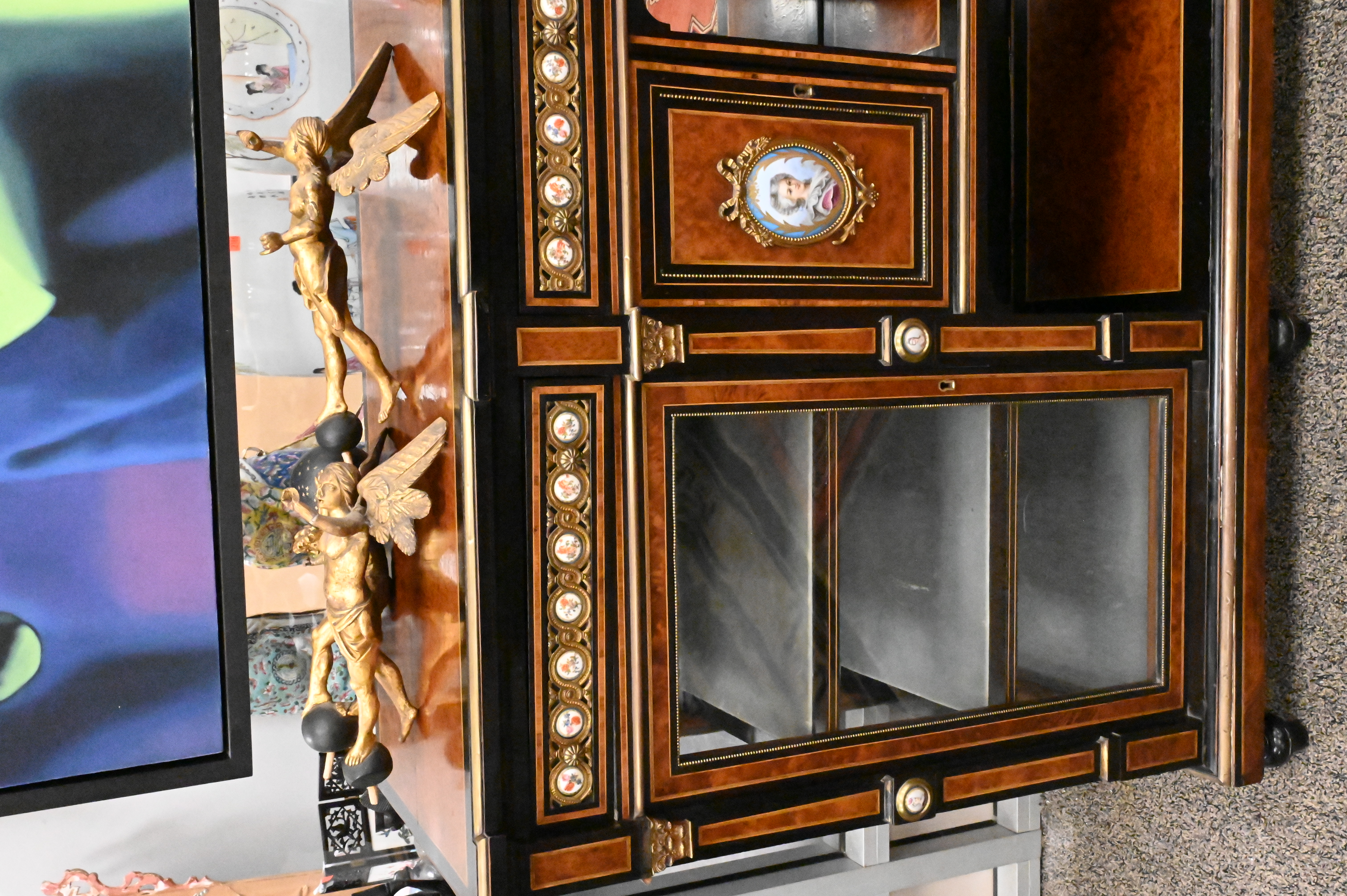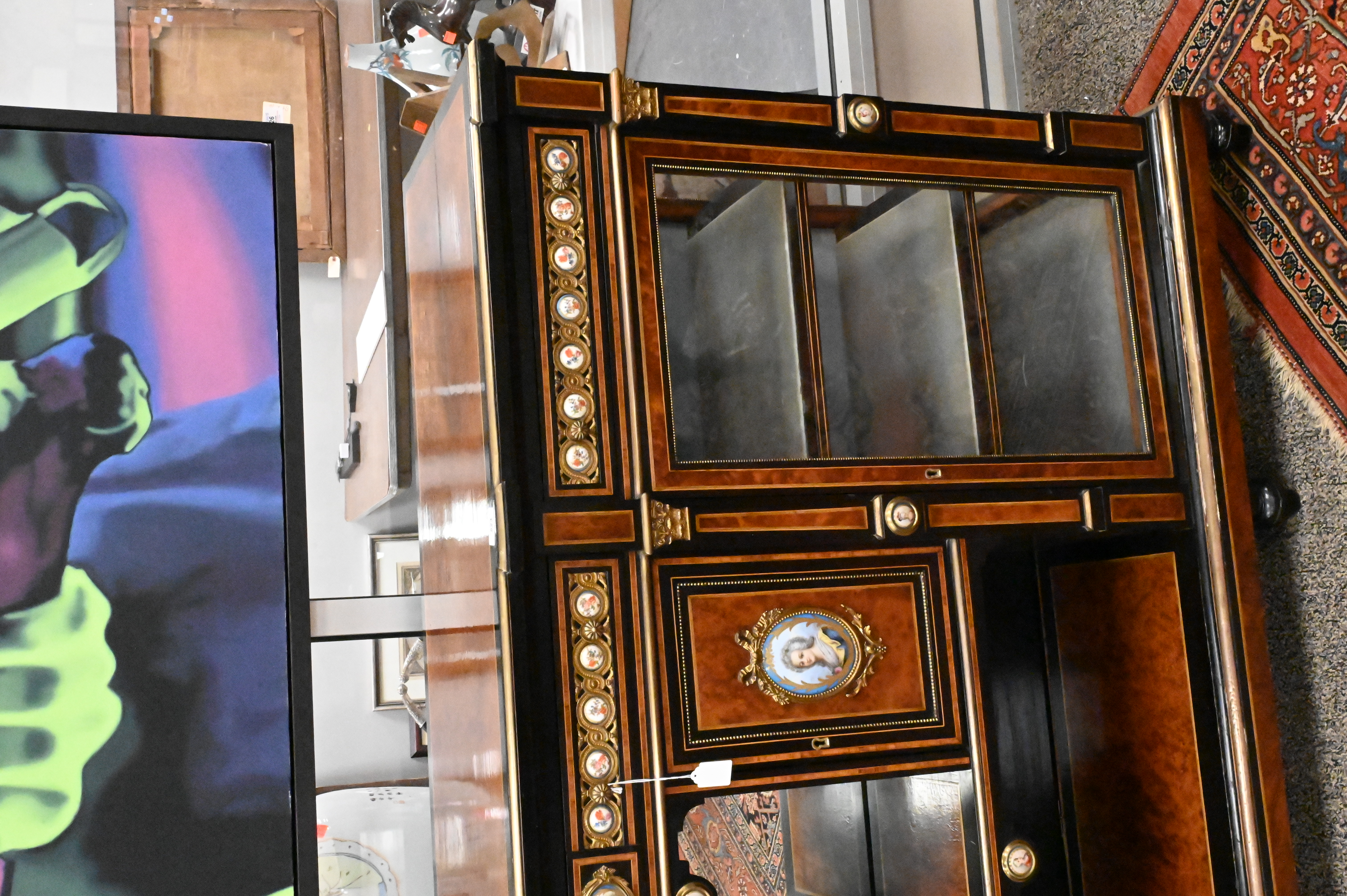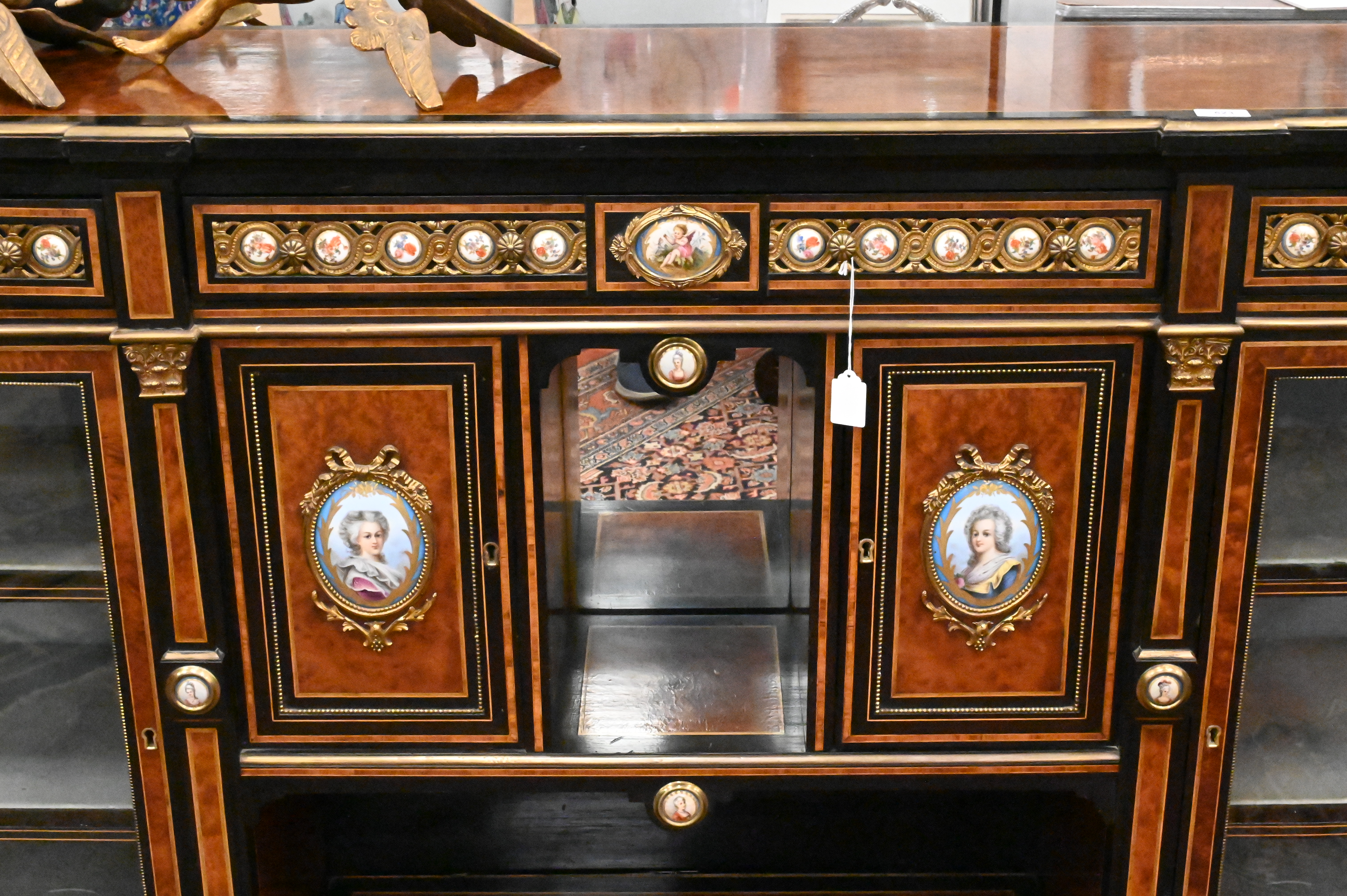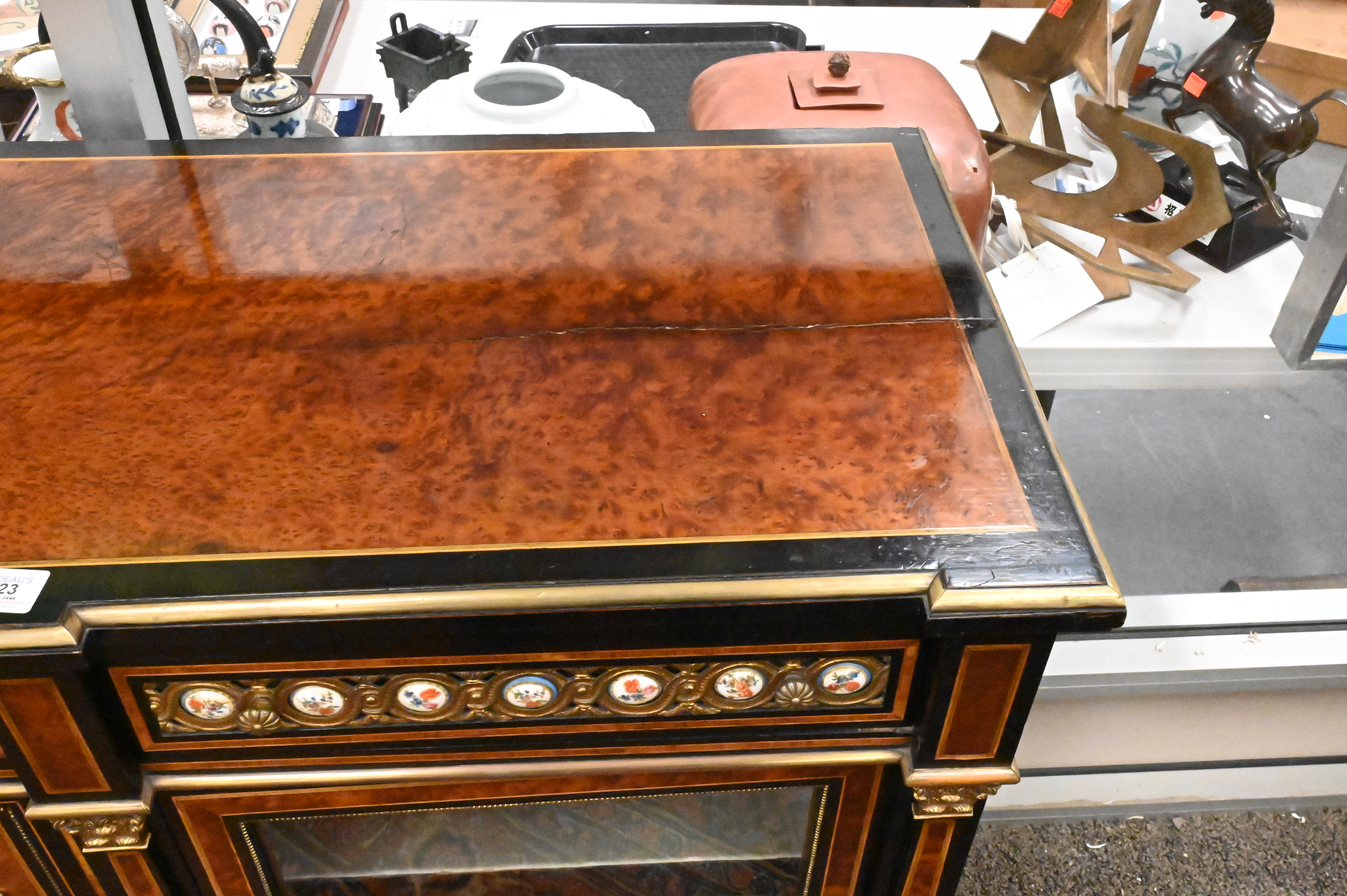 having burlwood top with brass edges over three drawers with painted porcelain round plaques, over four burlwood and ebonized doors, with two large porcelain painted plaques, all with bronze trim set on turned legs