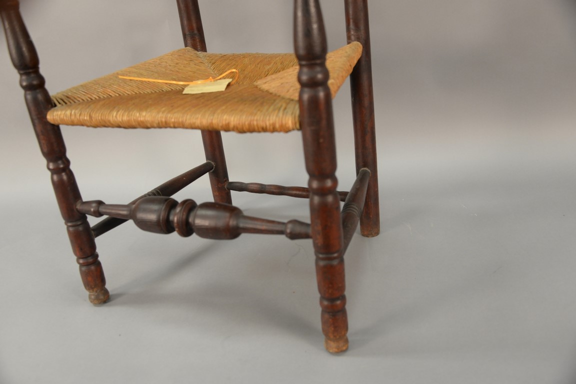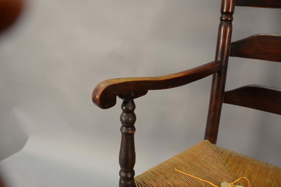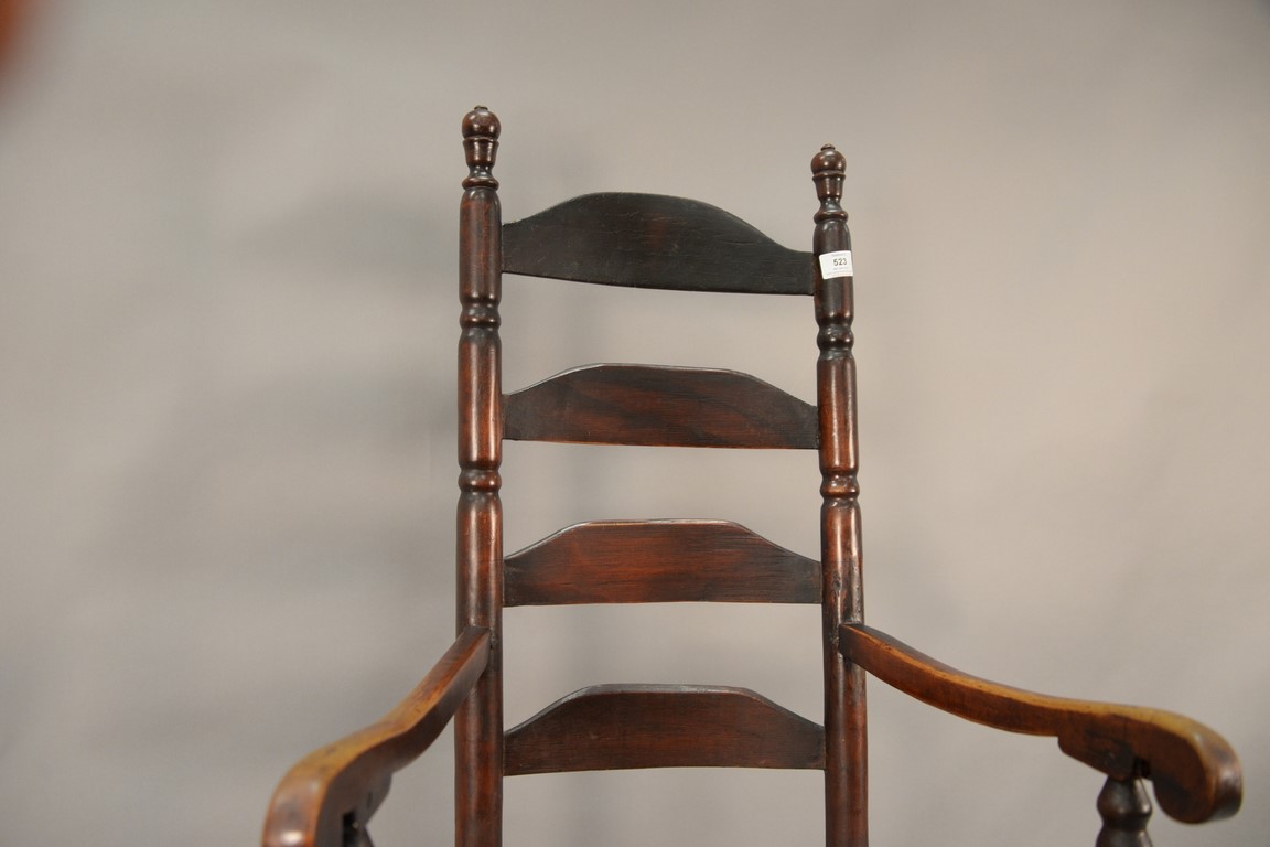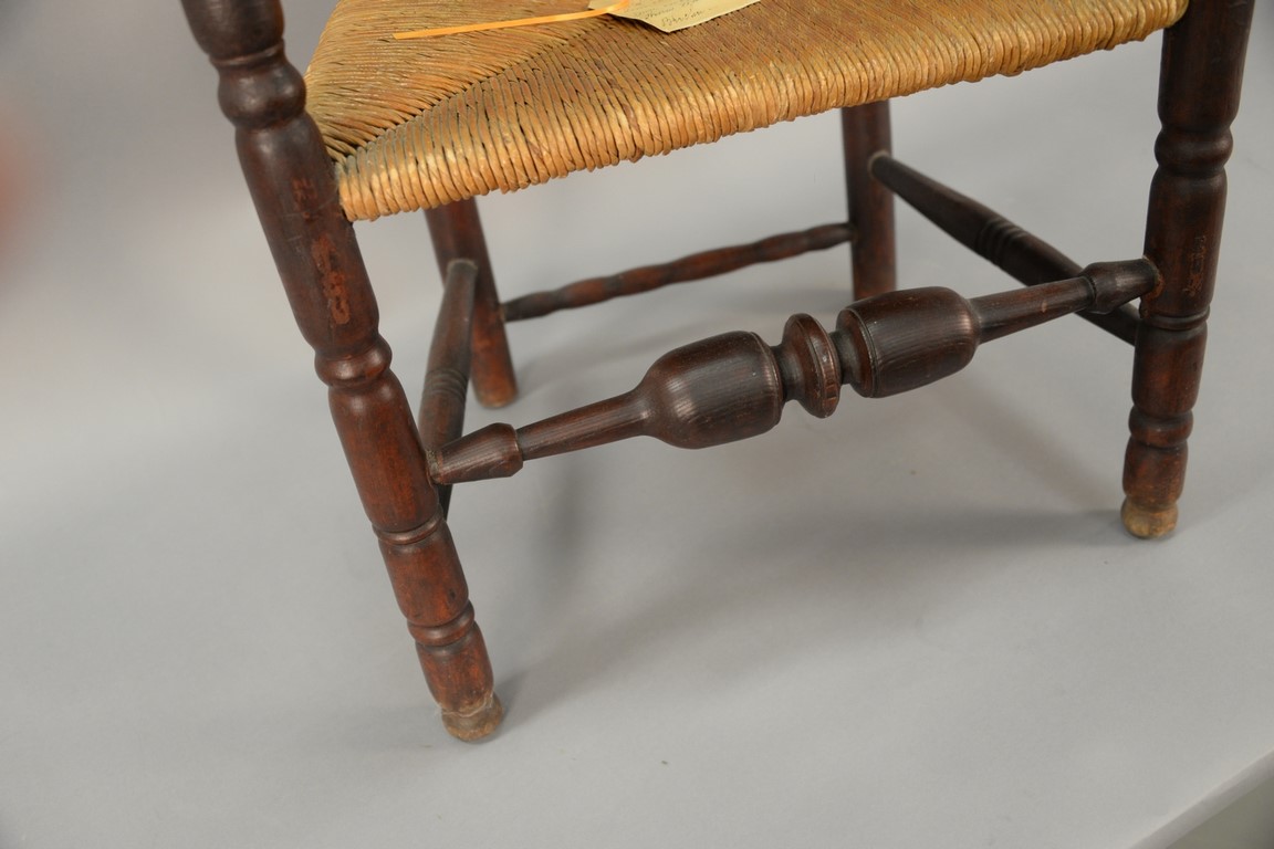Lot 523: Primitive ladderback great chair having four slats, sausage turnings and bold turned stretchers with old hand written tag 4 slat ba…