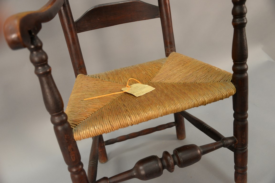 Primitive ladderback great chair having four slats, sausage turnings and bold turned stretchers with old hand written tag 4 slat back armchair once belonged to Henry Ward, early 18th century. ht. 46 1/2in., seat ht. 15 1/2in.