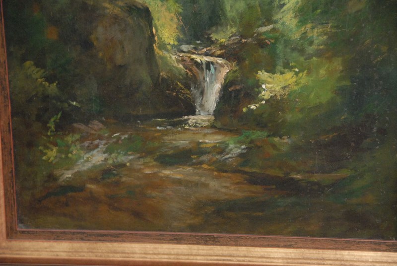 Lot 523: Roswell Morse Shurtleff 1838-1915 FOREST WATERFALL oil on canvas signed lower right barely visible Shurtleff 20 x 16
