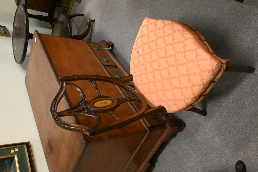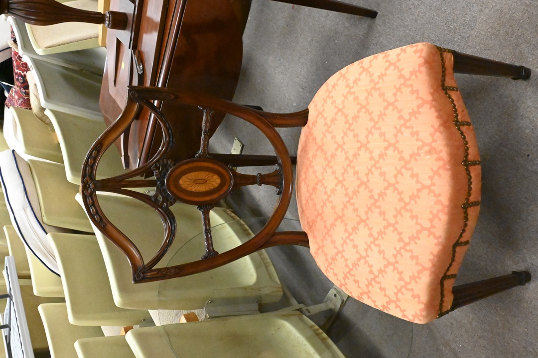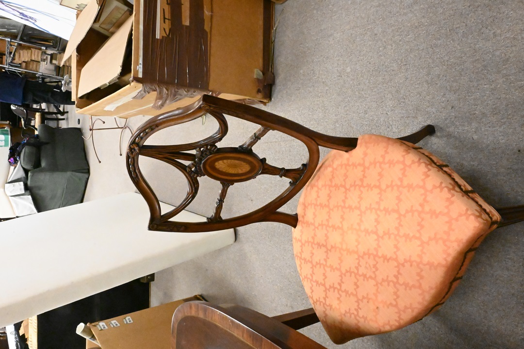 Set of Four Dining Chairs, each having shaped backs with inlaid panel in center, over upholstered seats, height 38 inches.