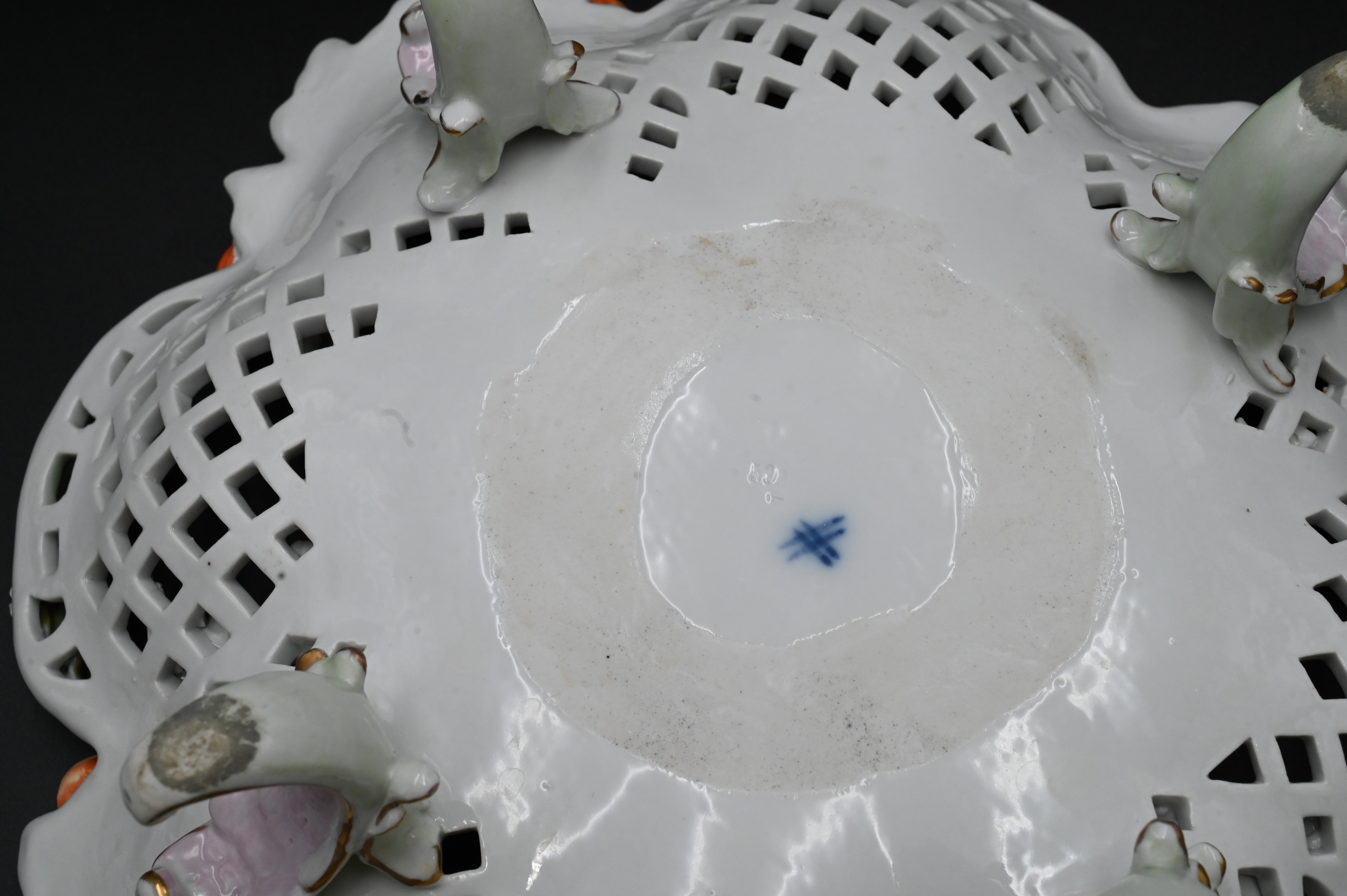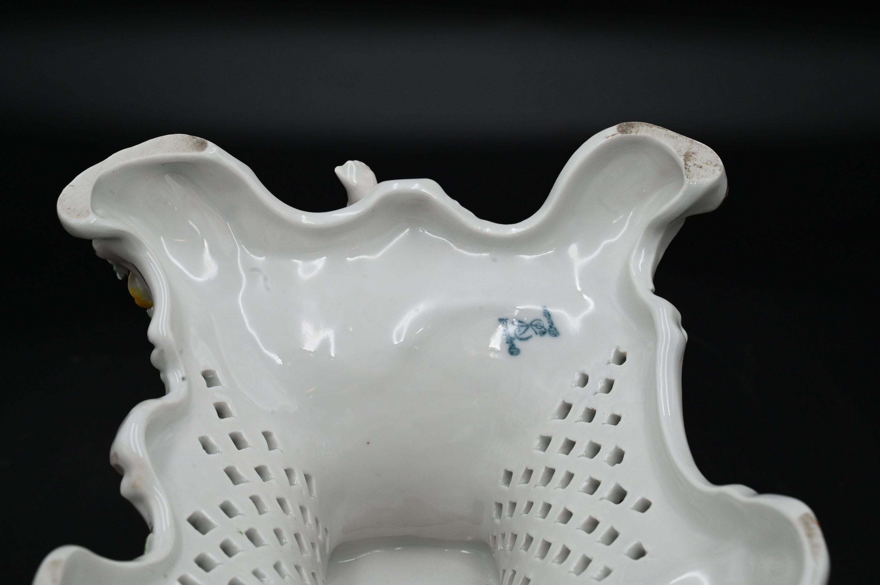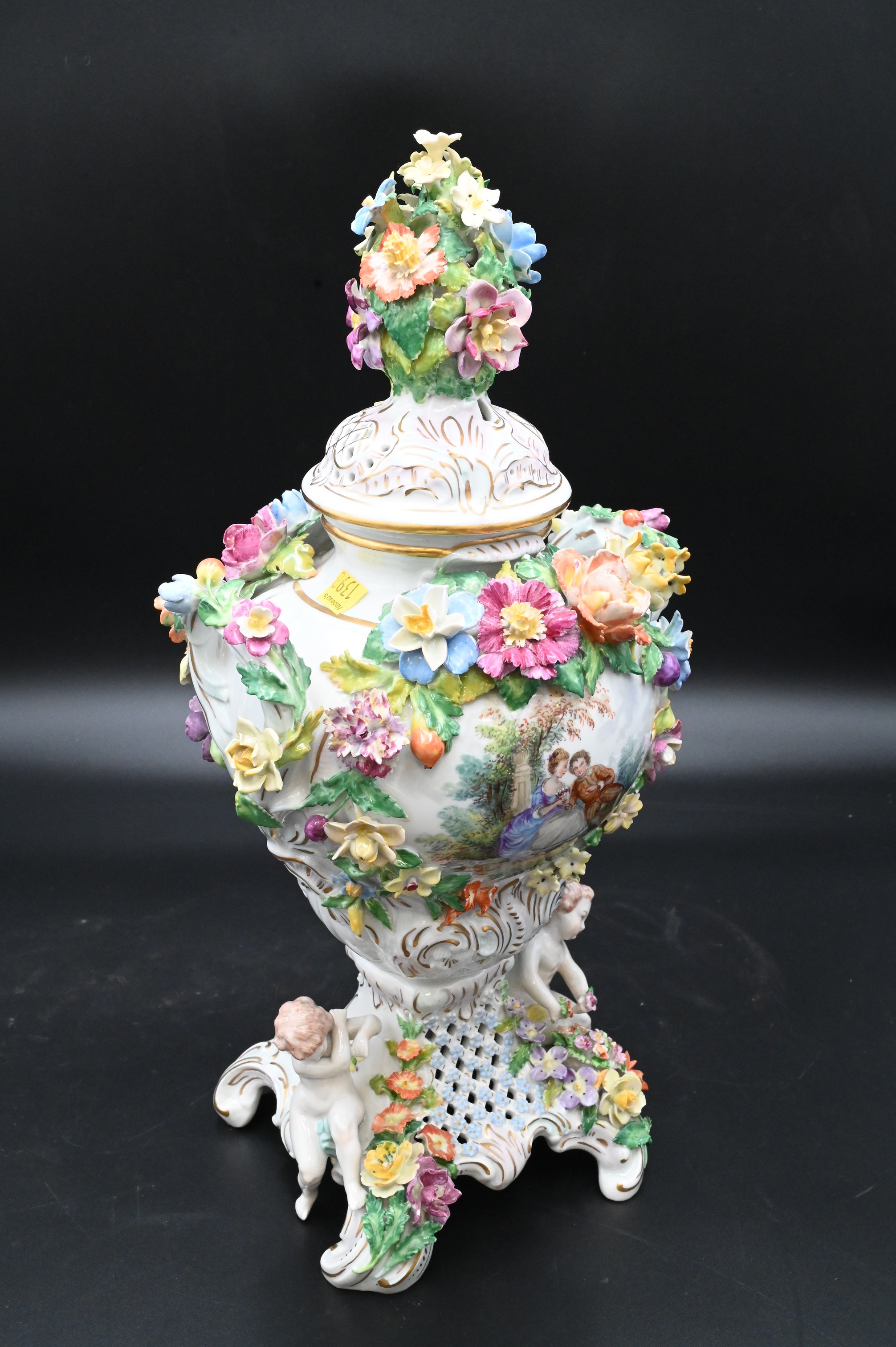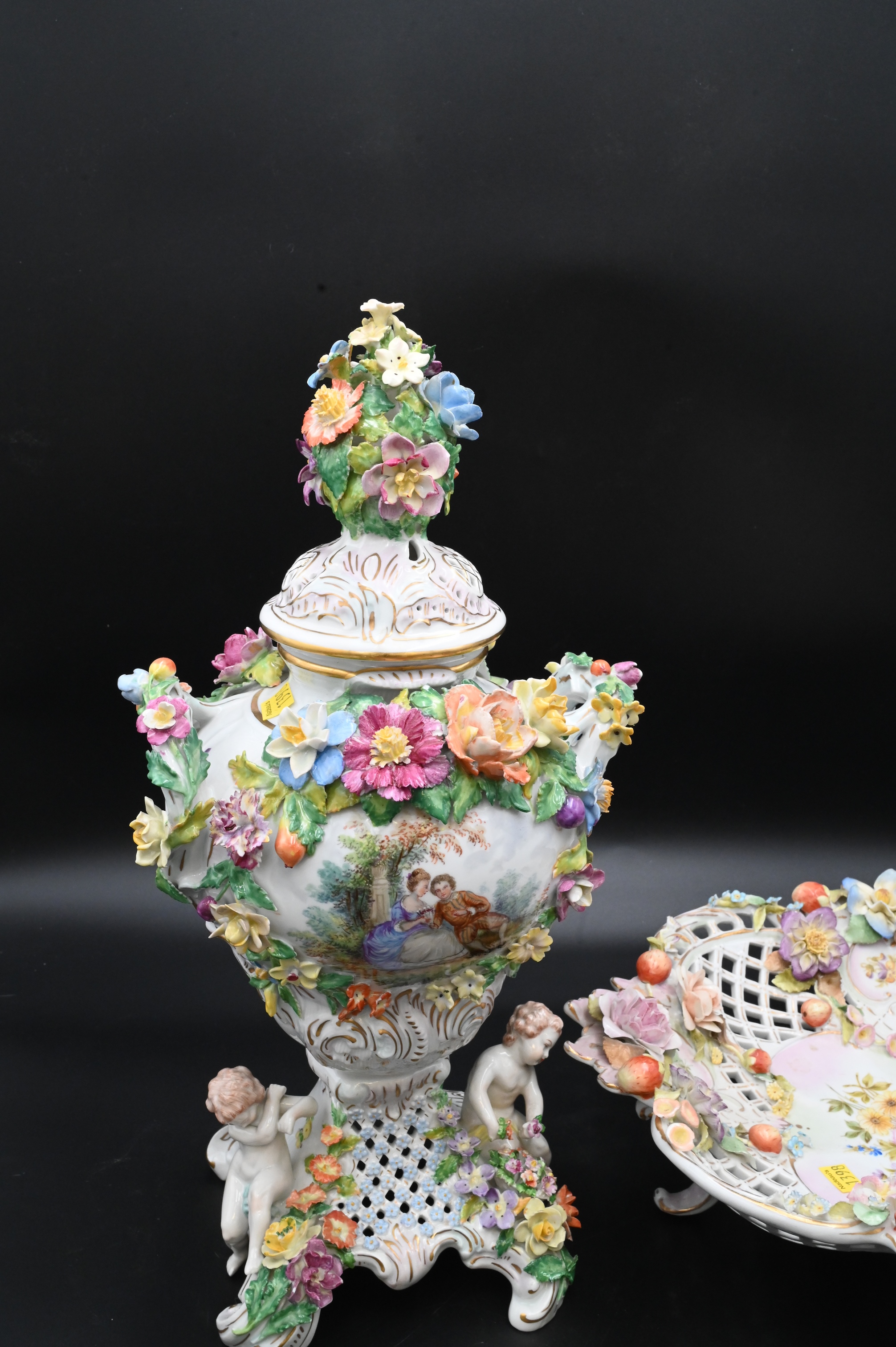 Two Dresden Porcelain Pieces, to include a covered urn with putti figures, height 18 1/2 inches, along with a large center dish having reticulated flowers, diameter 14 inches.
