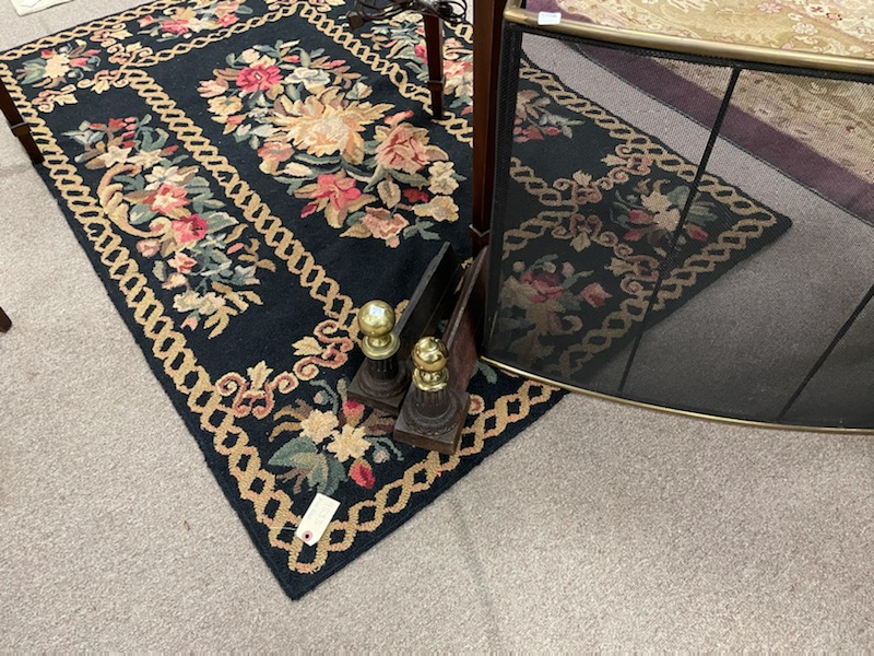 Lot 523A: Five piece lot to include two pairs of fire dogs with brass trim along with screen, height 7-1/2 inches.