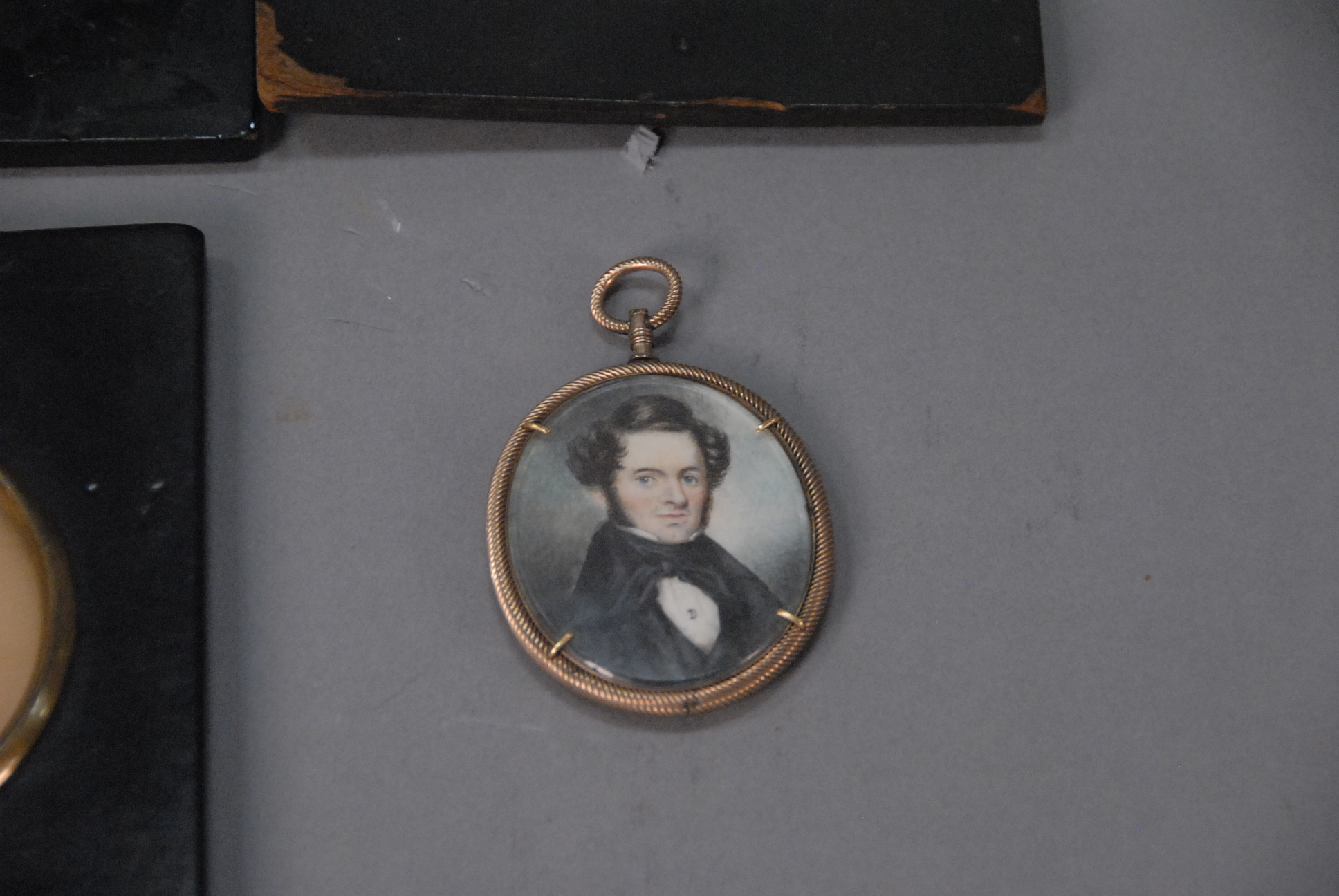 Four piece miniature lot to include two silhouettes, painting on paper, and another painting. 2 x 2 1/2 3 x 2 3/4 2 3/4 x 3 1/2 2 3/4 x 3 1/4