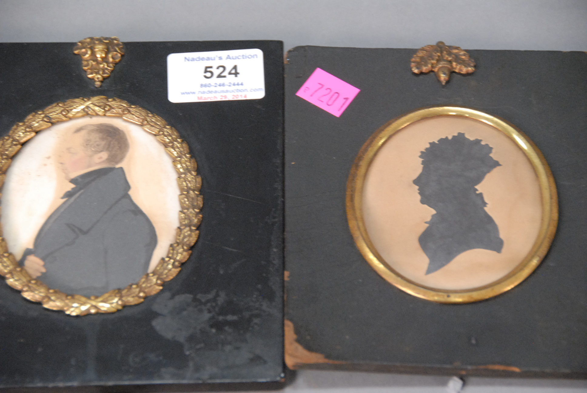 Lot 524: Four piece miniature lot to include two silhouettes, painting on paper, and another painting. 2 x 2 1/2 3 x 2 3/4 2 3/4 x 3 1/2 2 3/4 x 3 1/4