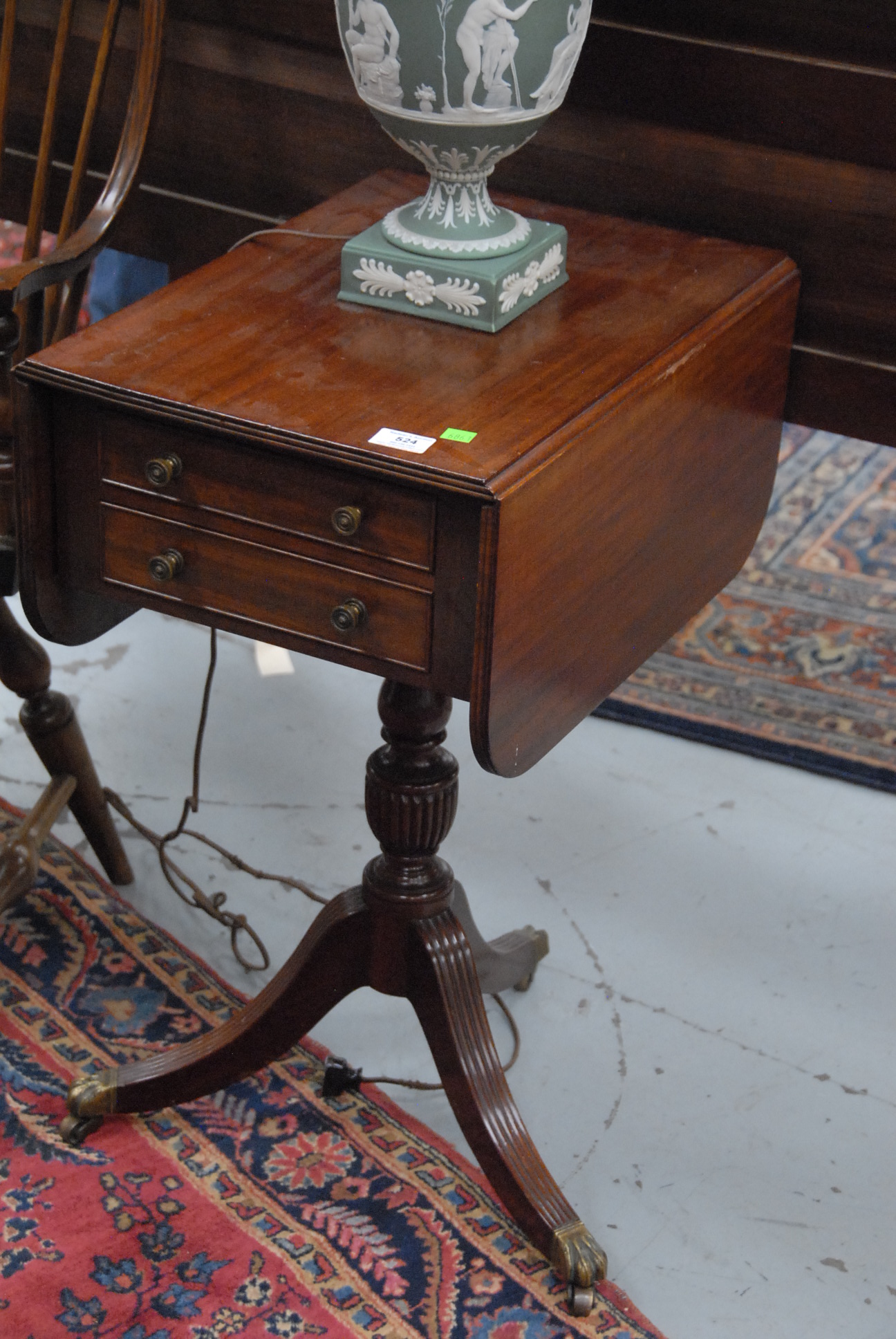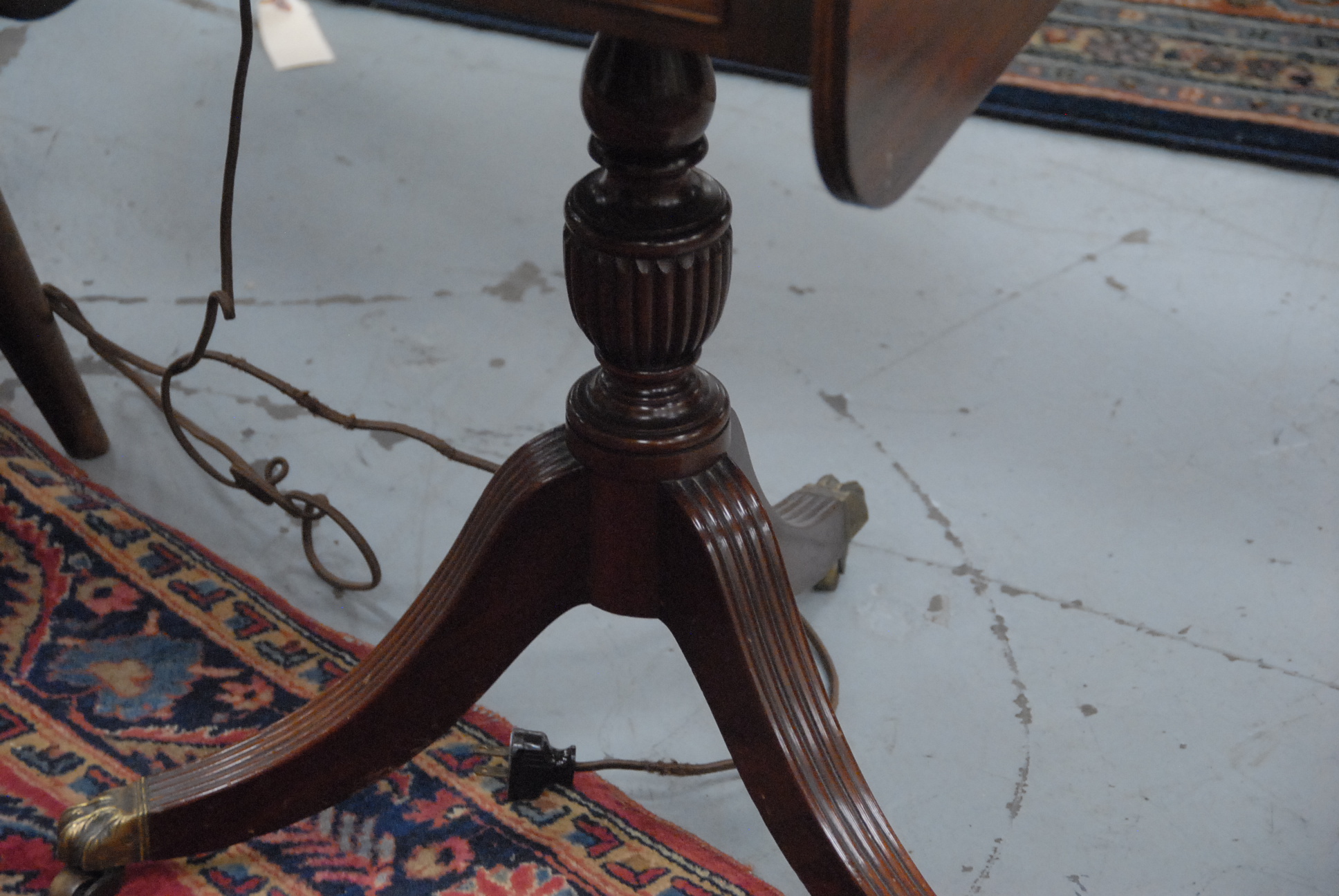 Lot 524: Margolis mahogany stand, Duncan Phyfe style with drop leaves and two drawers on turned shaft ending in three downswept members, signed with paper label under drawer small chip on edge of leaf. ht. 28 1/2in. top closed: 14 x 19 1/2