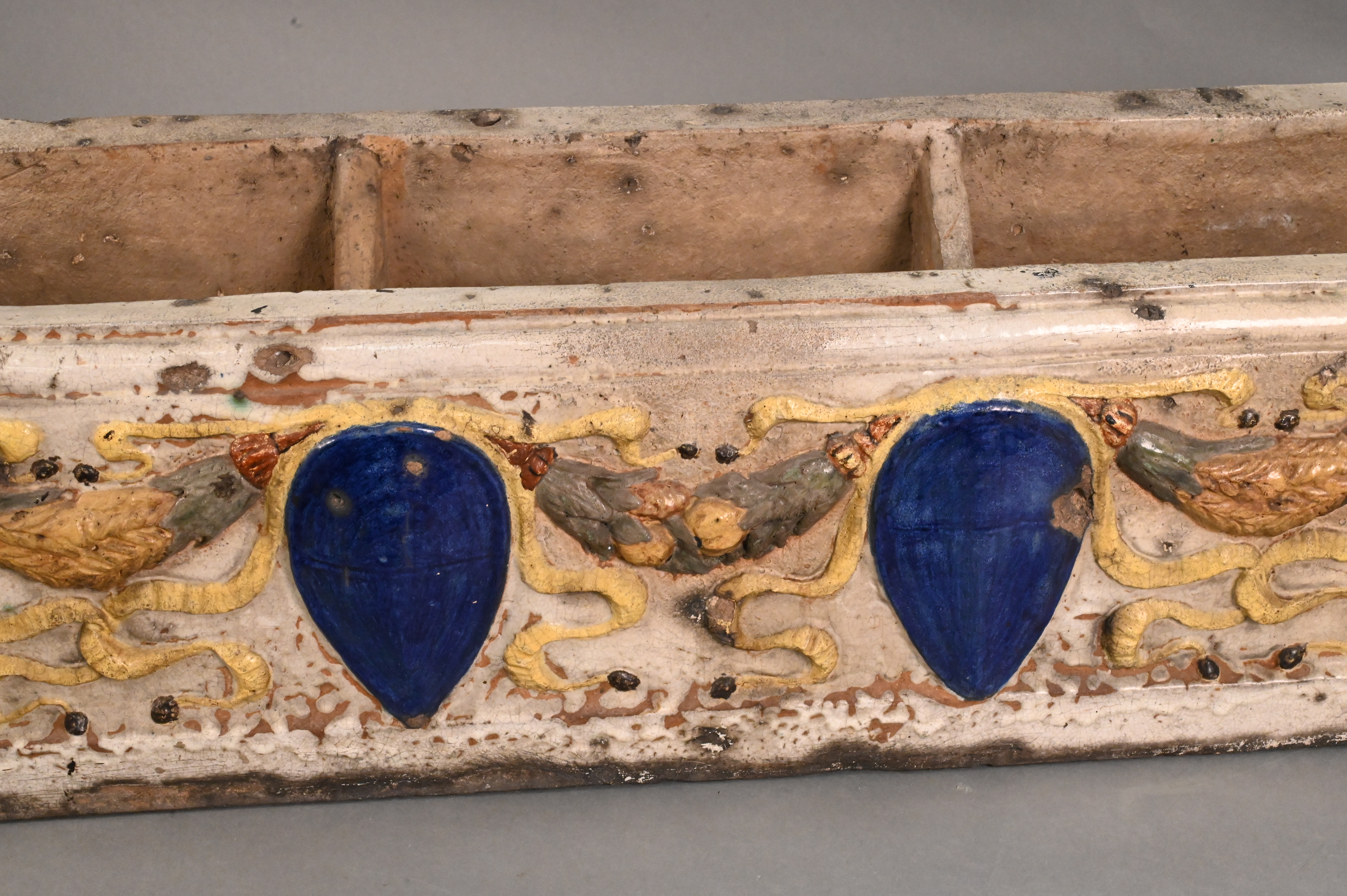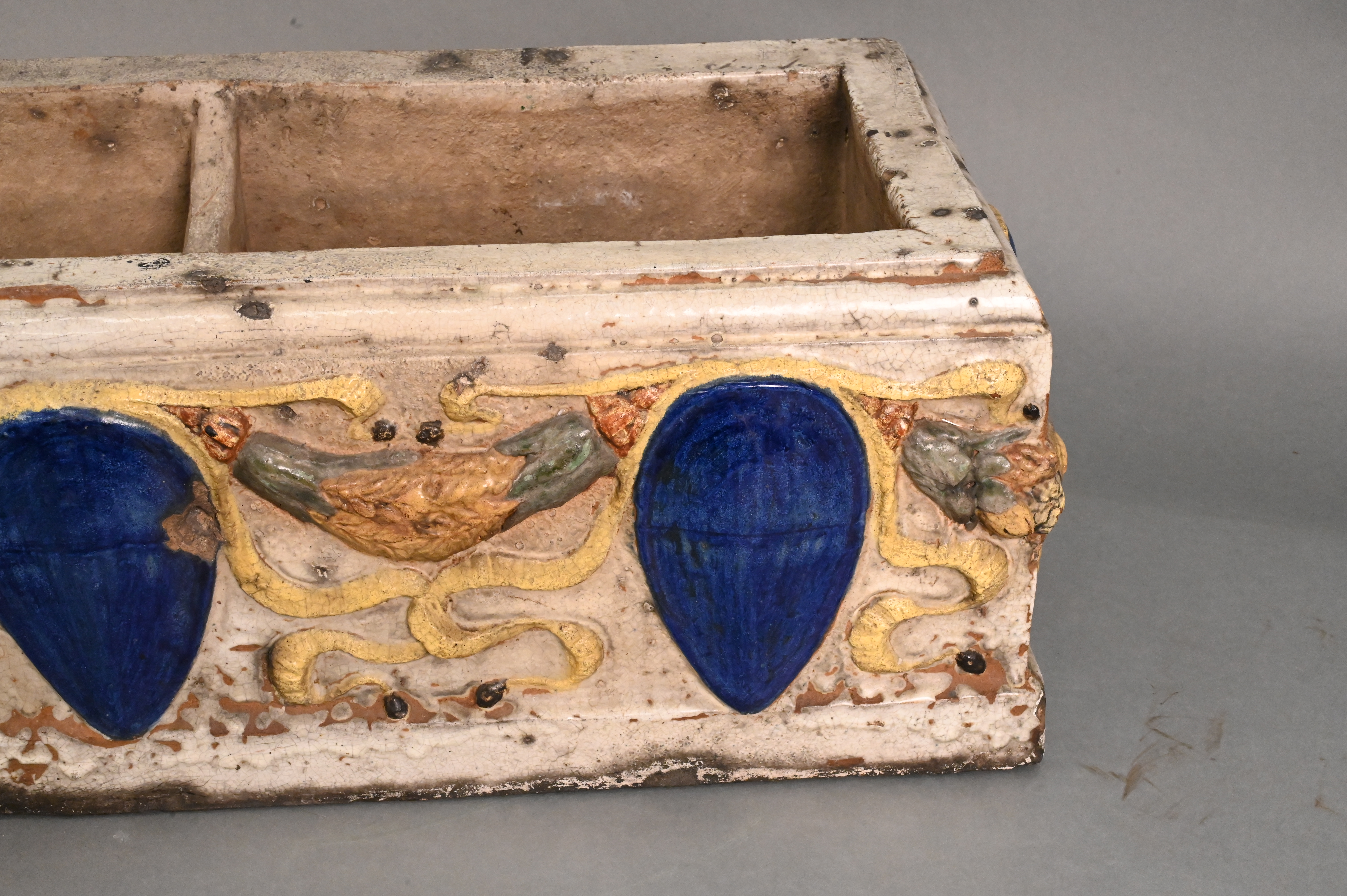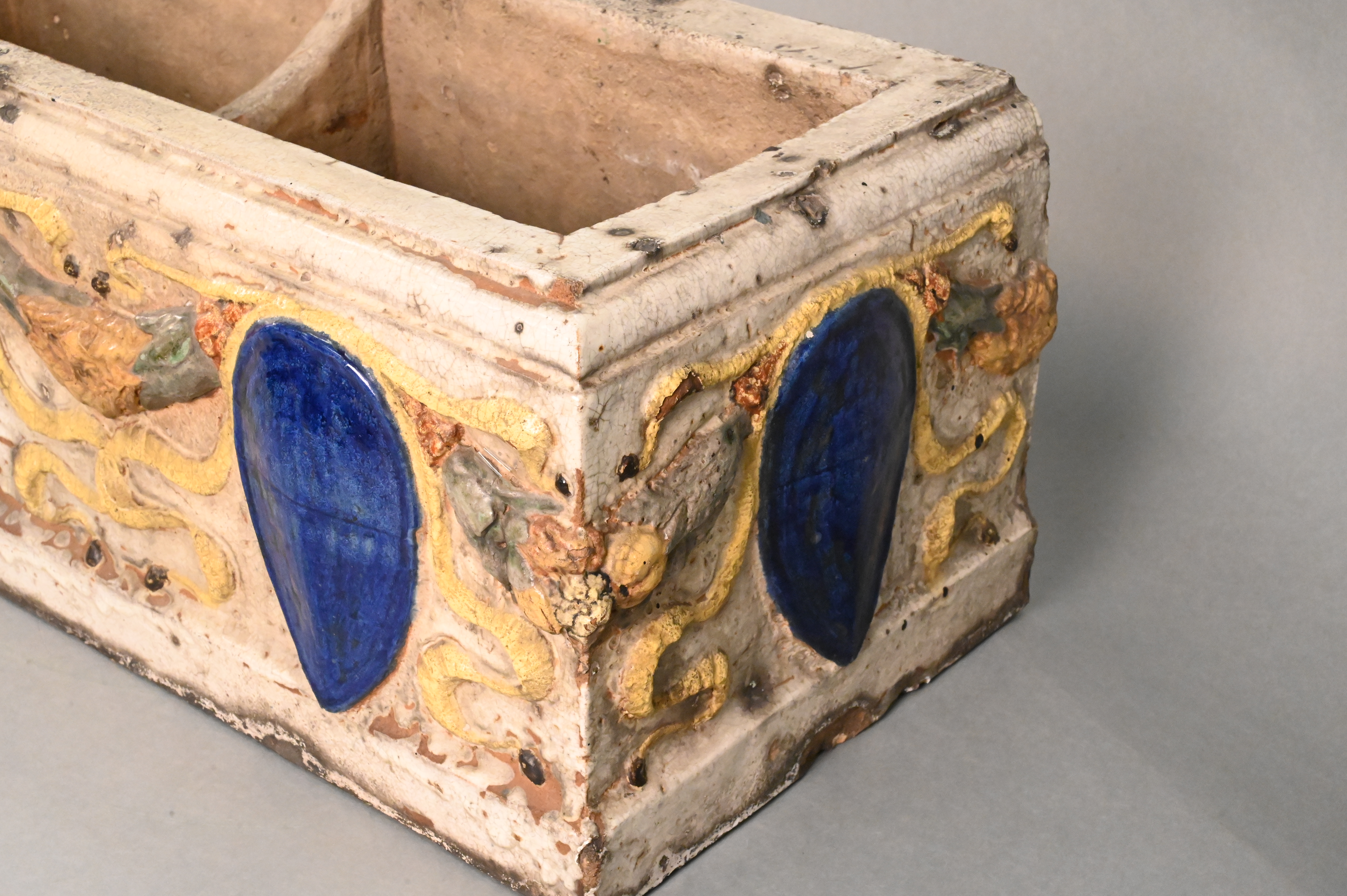 rectangle form with luster, cobalt blue glazed teardrop jewels with yellow and green wreath, white ground, interior divided into three sections, possibly 15th/16th century or later