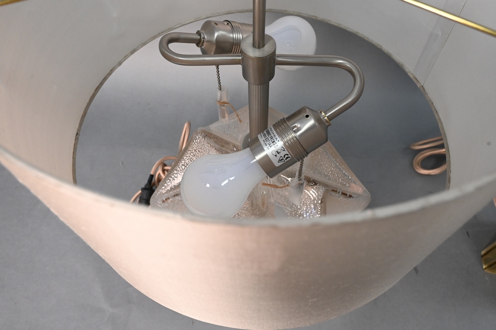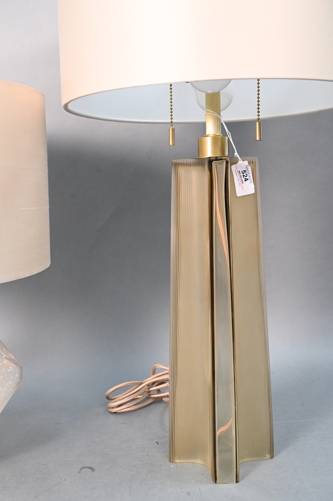 Lot 524: Two Donghai Glass Tables Lamps, to include round linen fold design and a frosted and clear glass, both signed Donghai, height 29 inches.