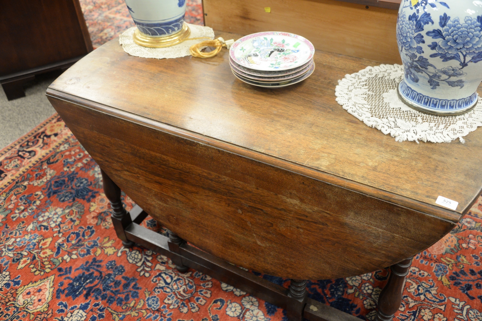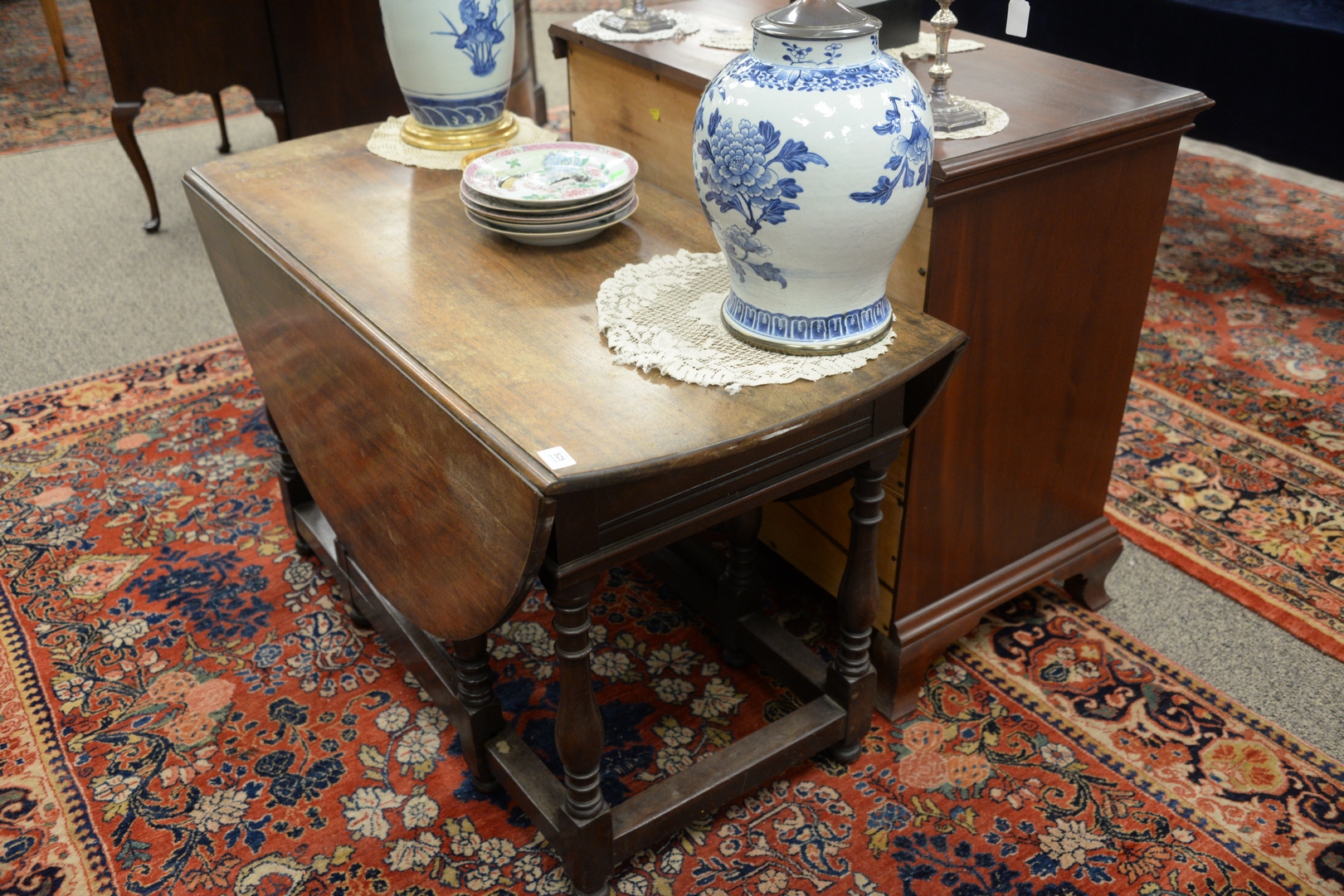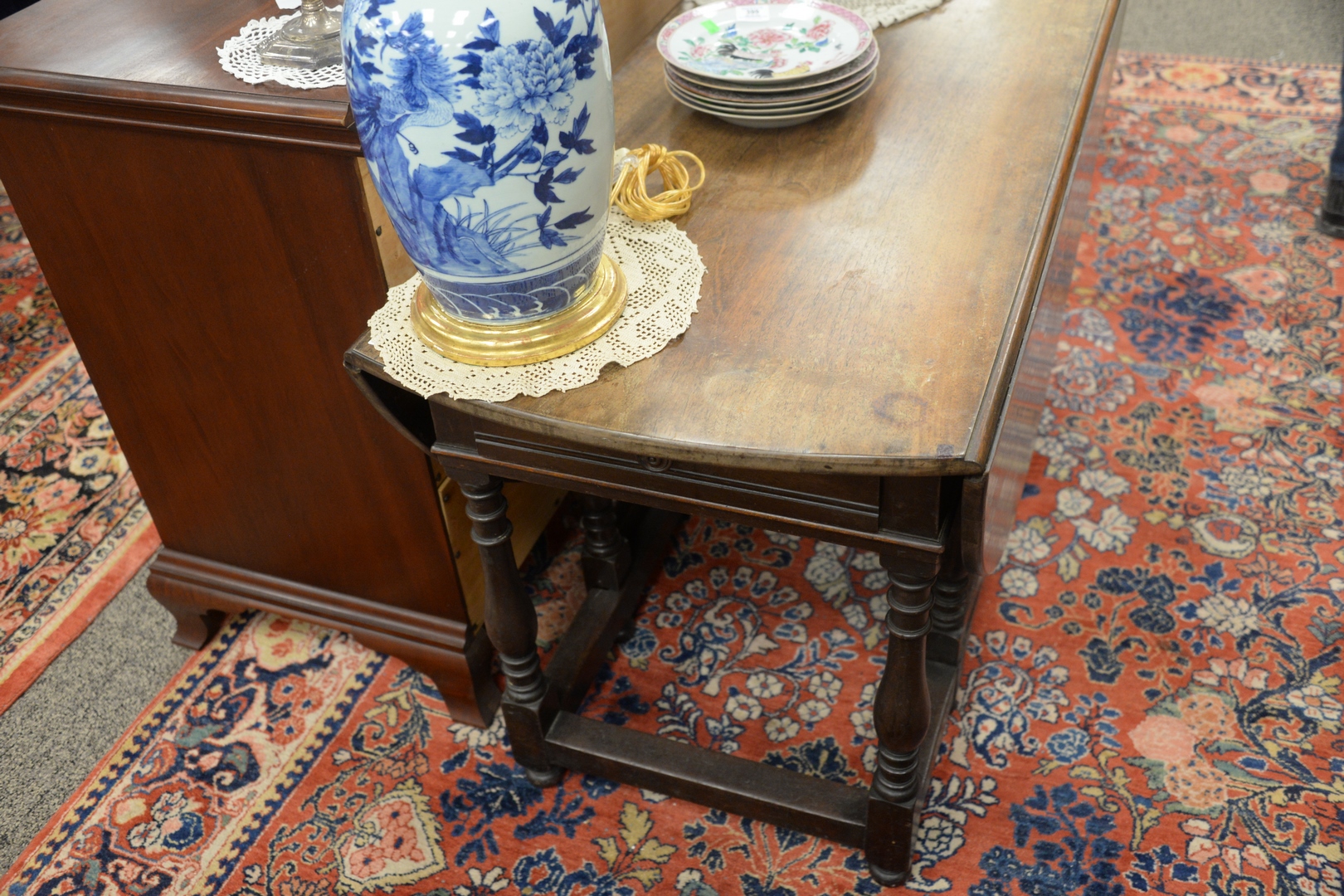 Lot 525: Custom Mahogany Gate Leg Drop Leaf Table, on block and turned legs with drawer, attributed to Kittinger, height 28 inches, open 48 x 57.