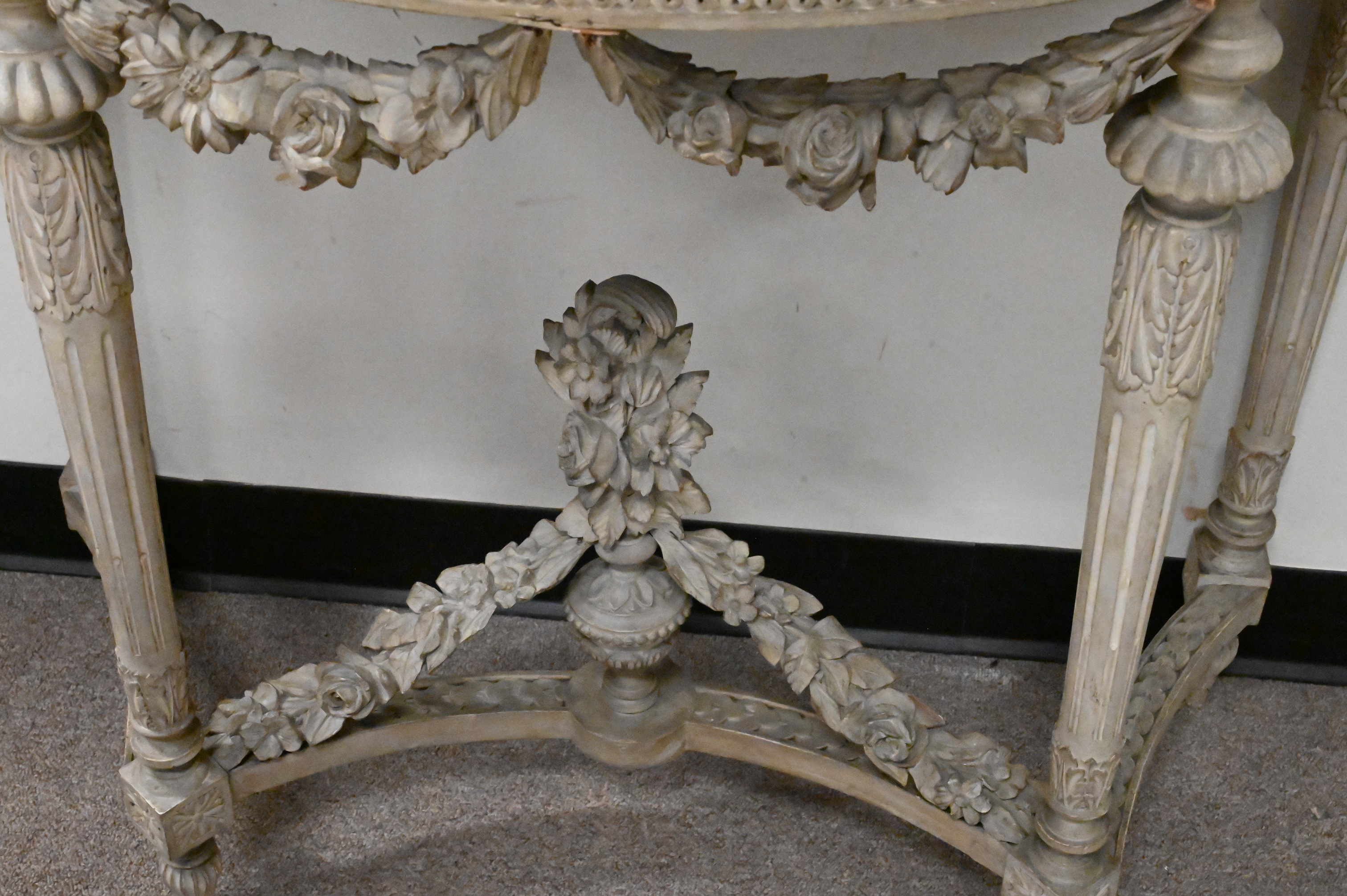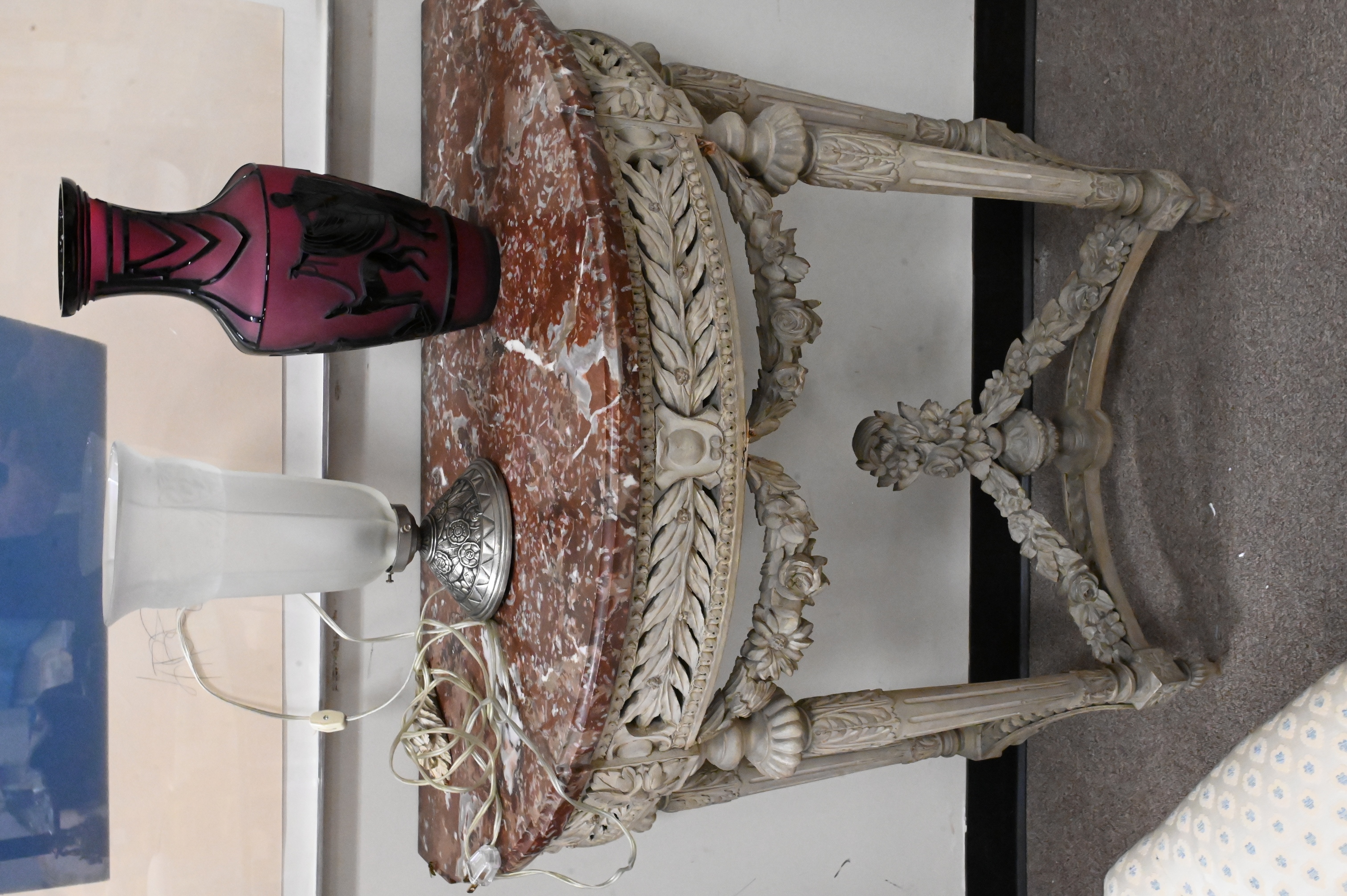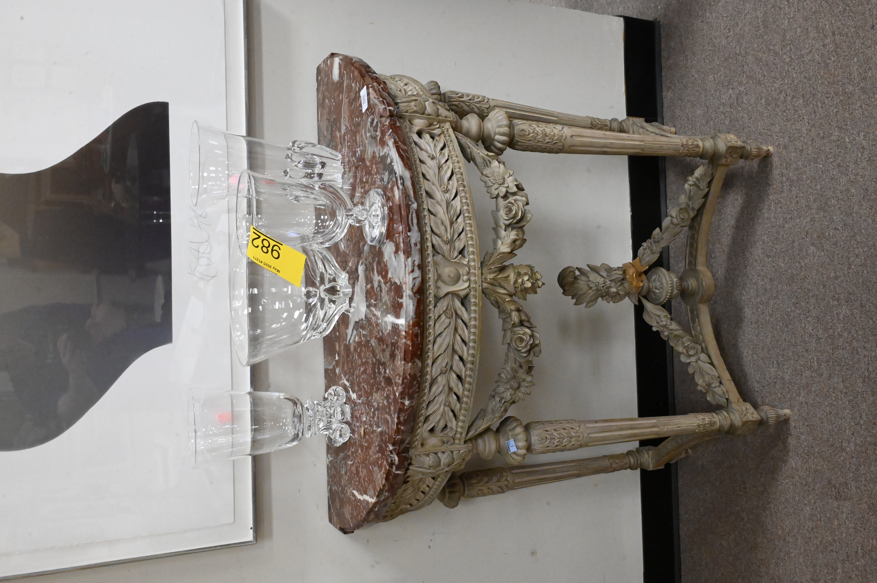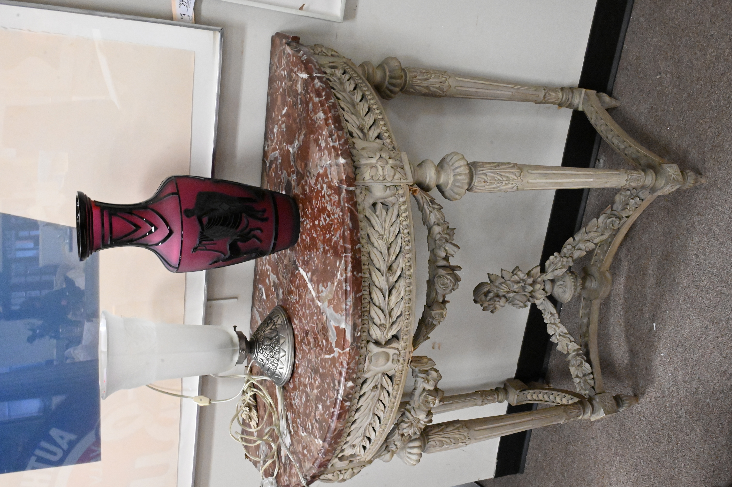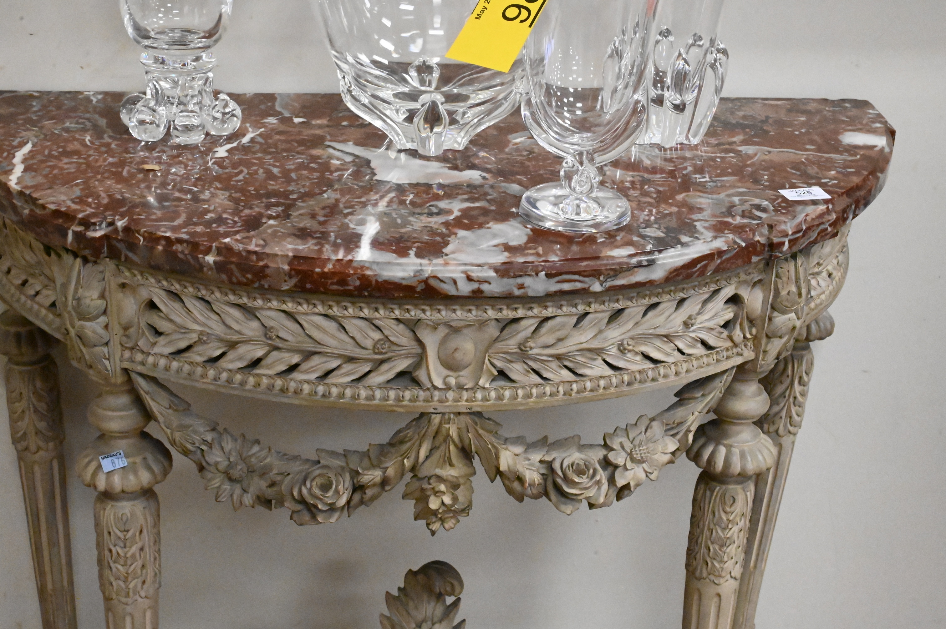 Lot 525: Pair of Louis XVI Style Demilune Console Tables having Rouge Marble Tops