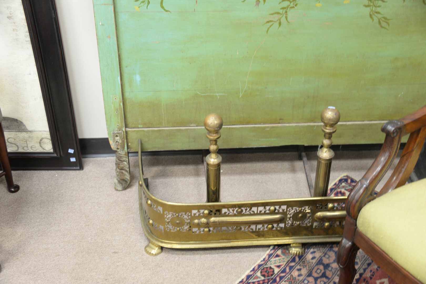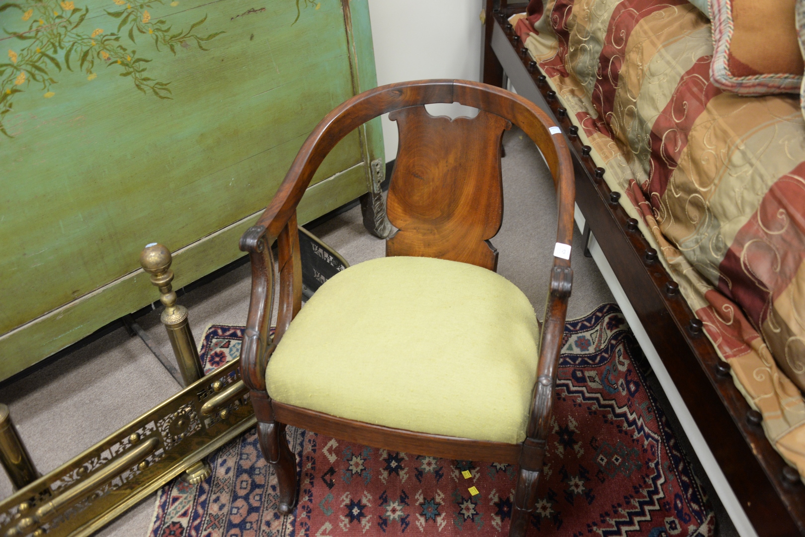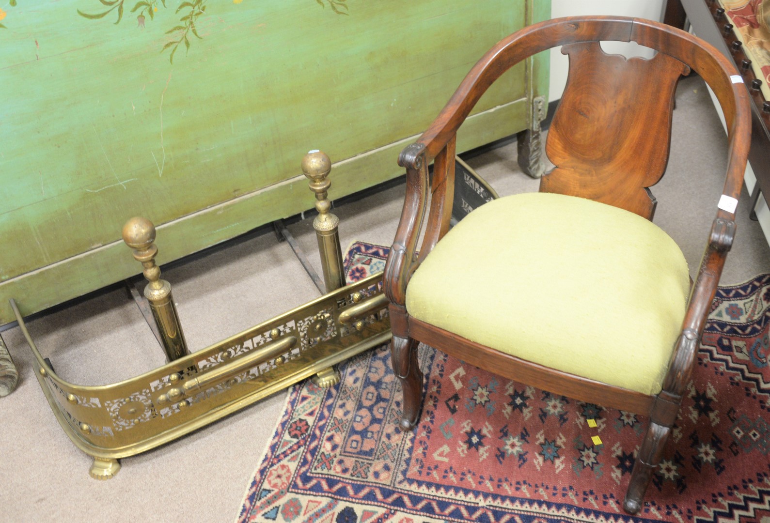 Lot 525: Three Piece Lot, to include Federal mahogany tub chair, with repairs brass andirons, height 21 1/2 inches along with fender, len…