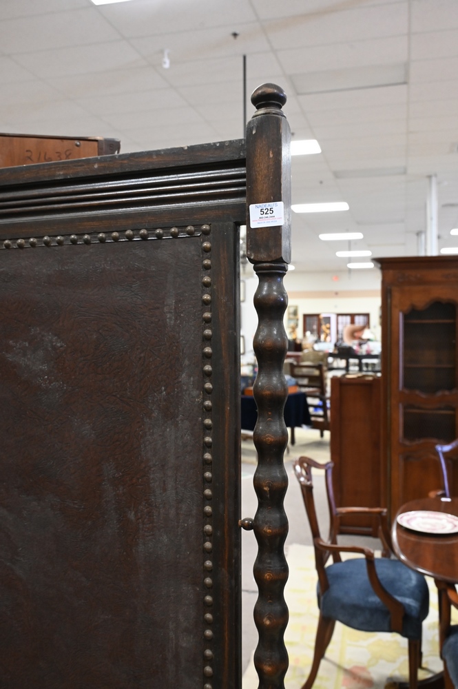 Lot 525: Victorian Four-Part Dressing Screen, in two sections, having leather center, height 73 inches, width (32″ x 4) 128 inches.