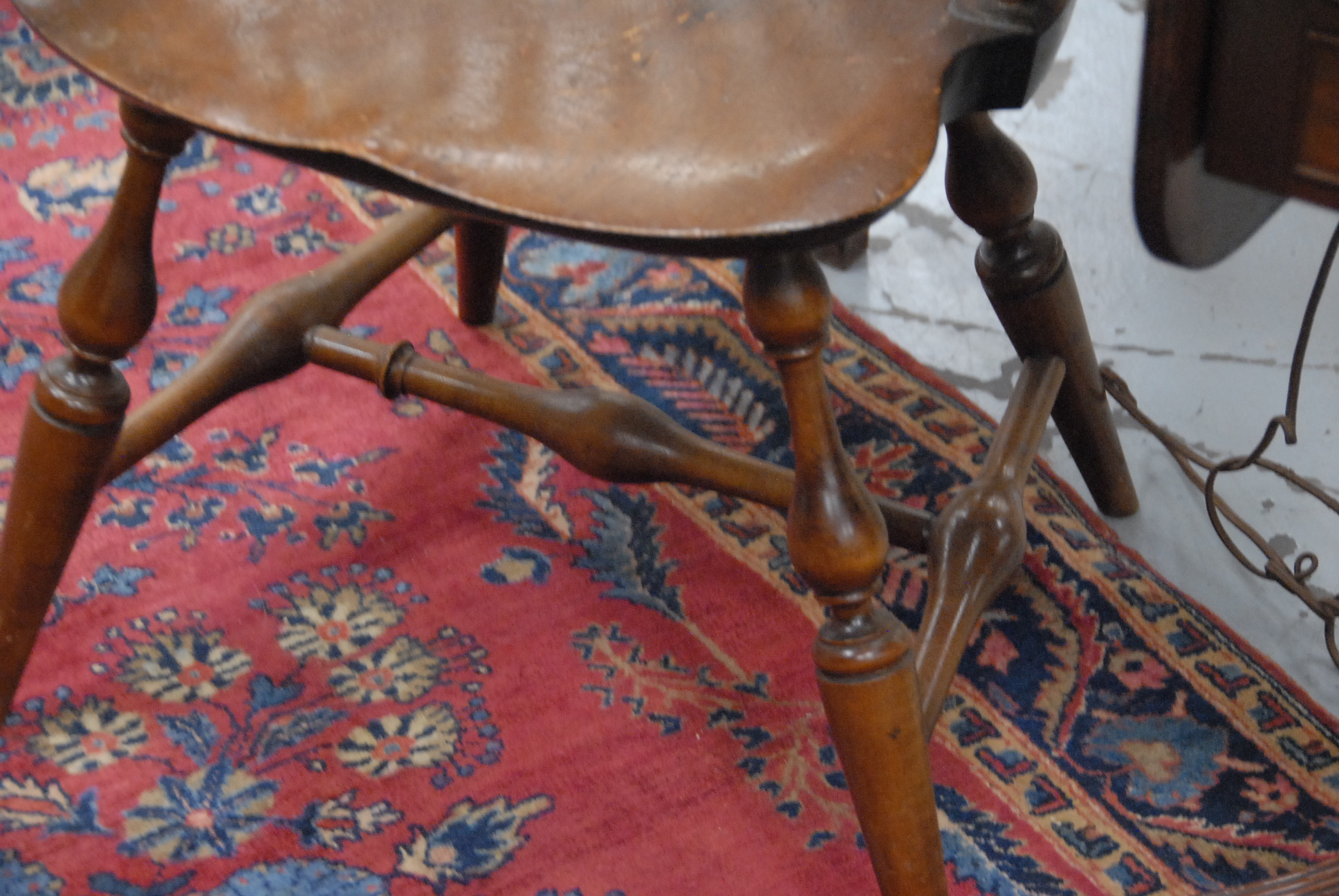 Lot 525: Wallace Nutting Windsor chair having continuous arm with brace back on bold turned legs signed Wallace Nutting in block letters.