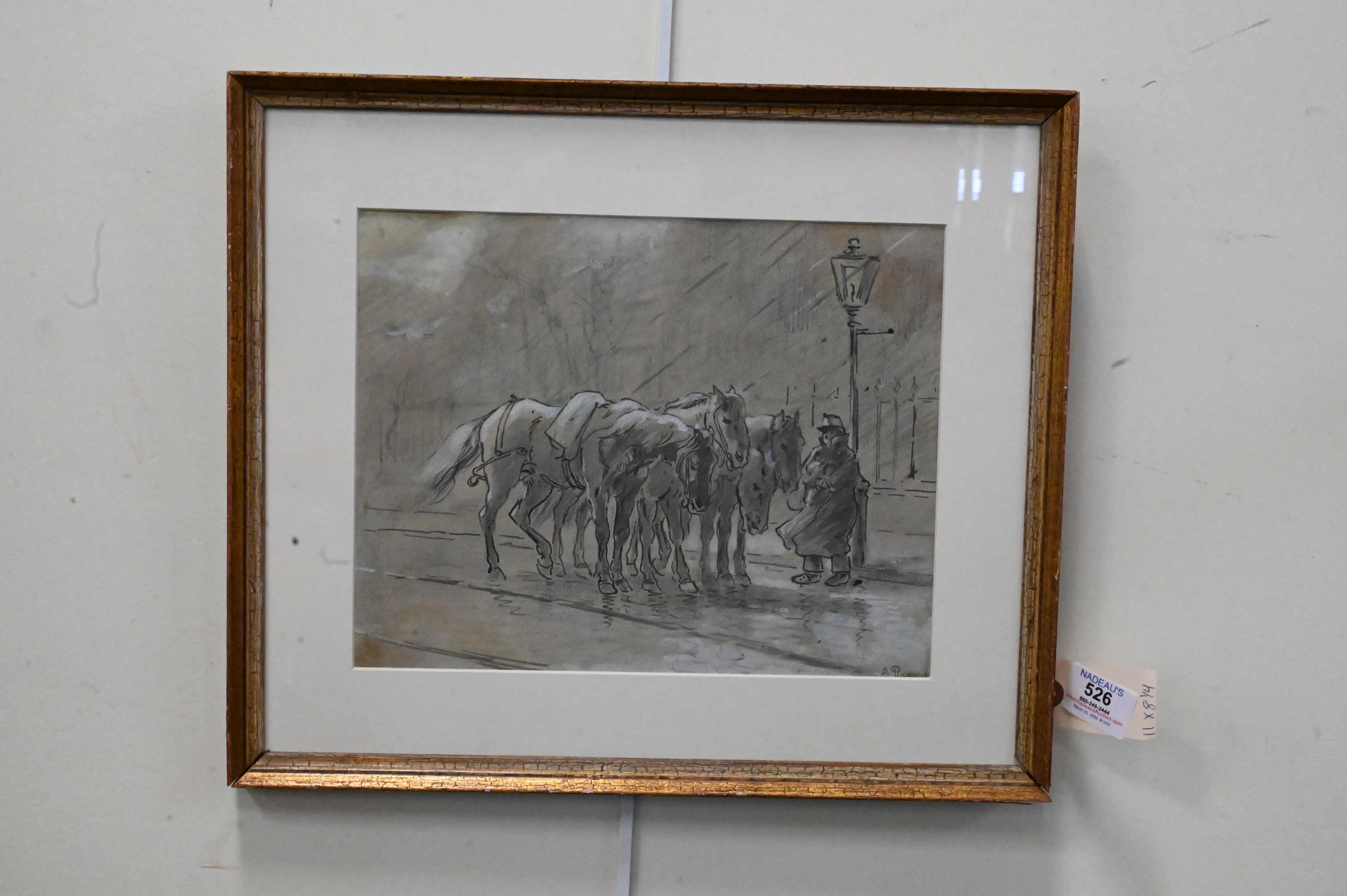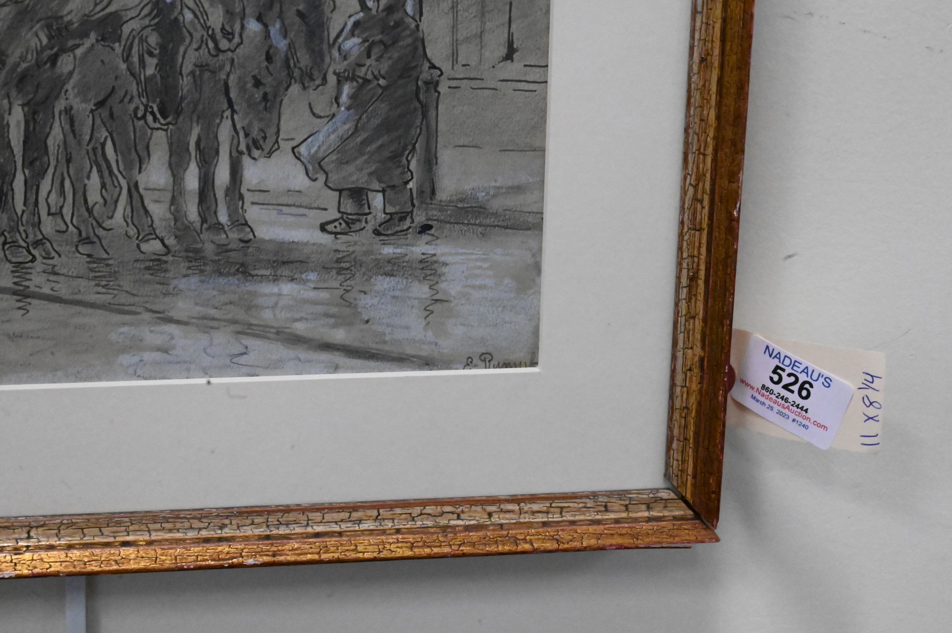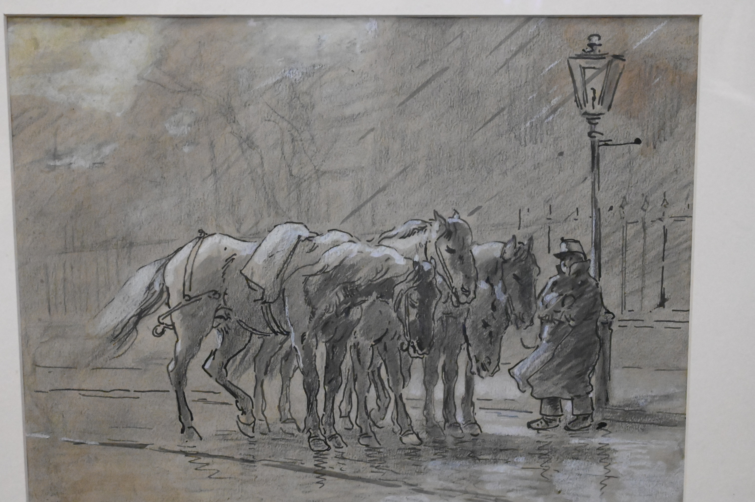 Emil Rumpf (1860 – 1948), four carriage horses and man by street light, ink and gouache on paper, signed lower right E. Rumpf, 8 1/4″ x 11″, Roetzel & Company label on back.