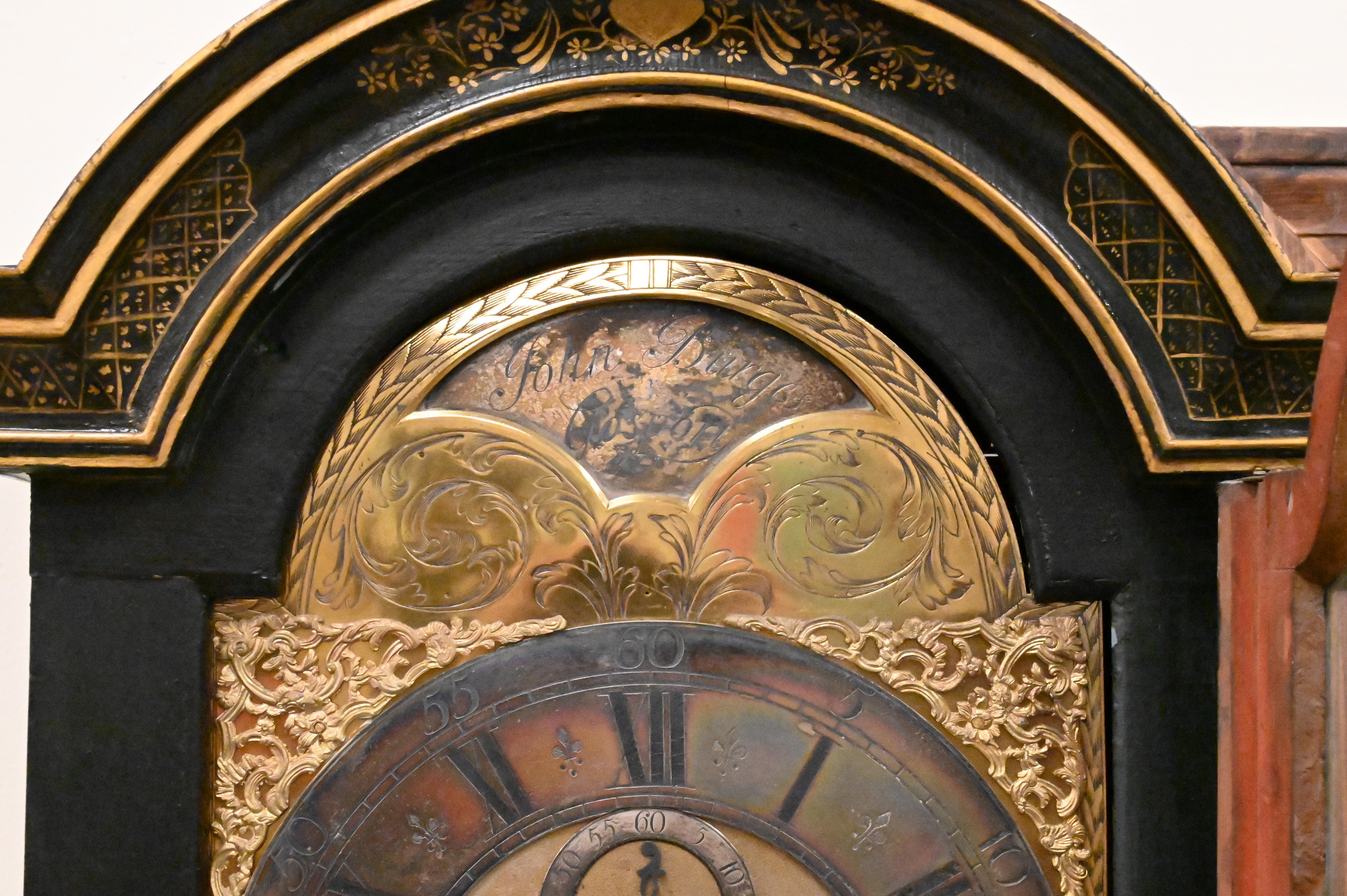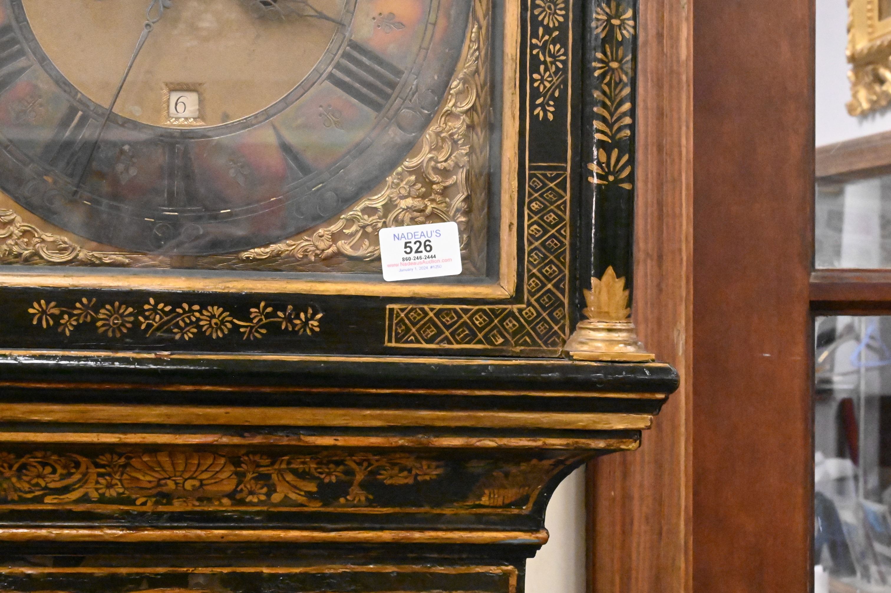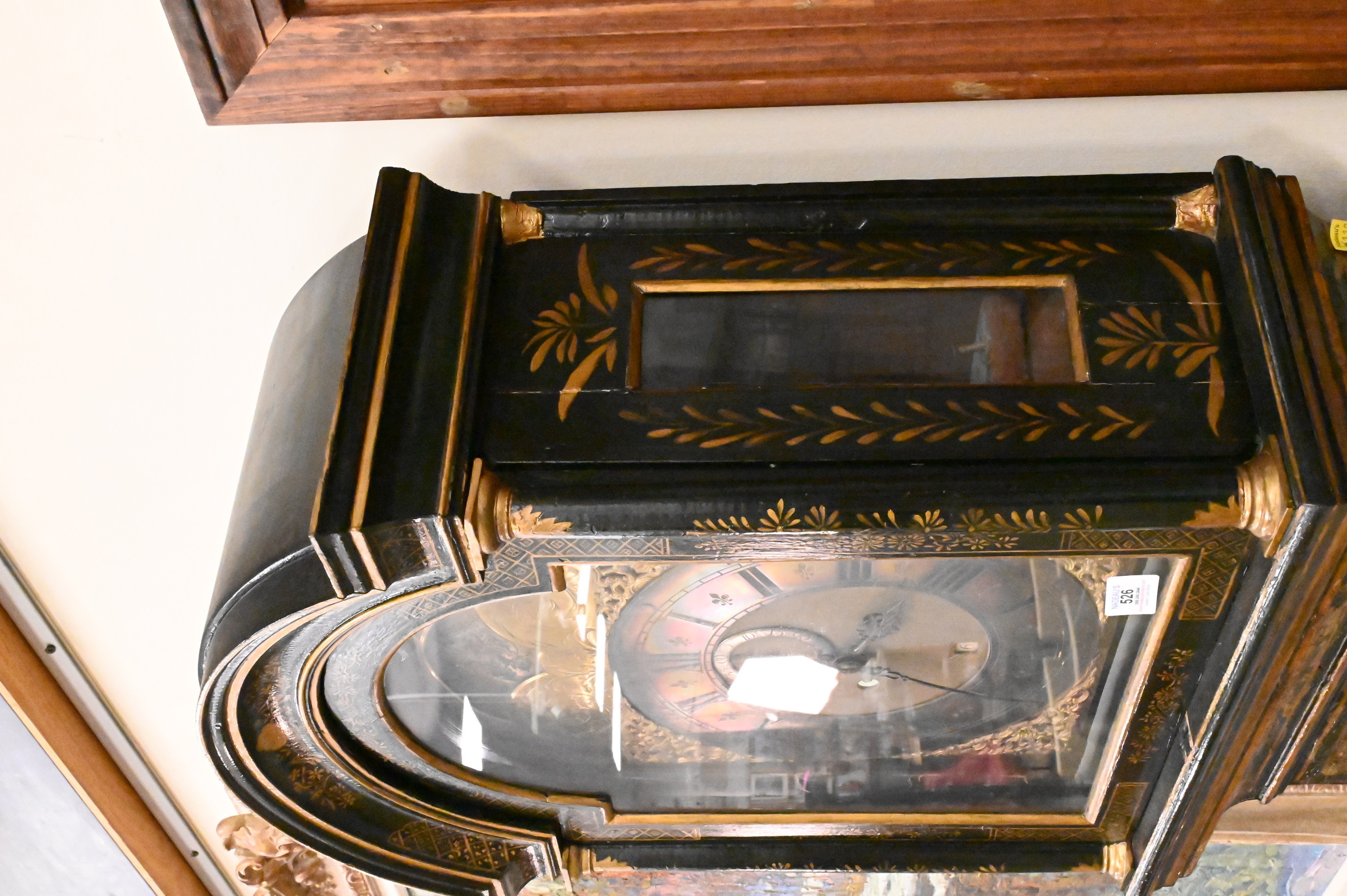 in dark green Chinoiserie lacquer, by John Burgess Gosport, with weights and pendulum, circa 1780