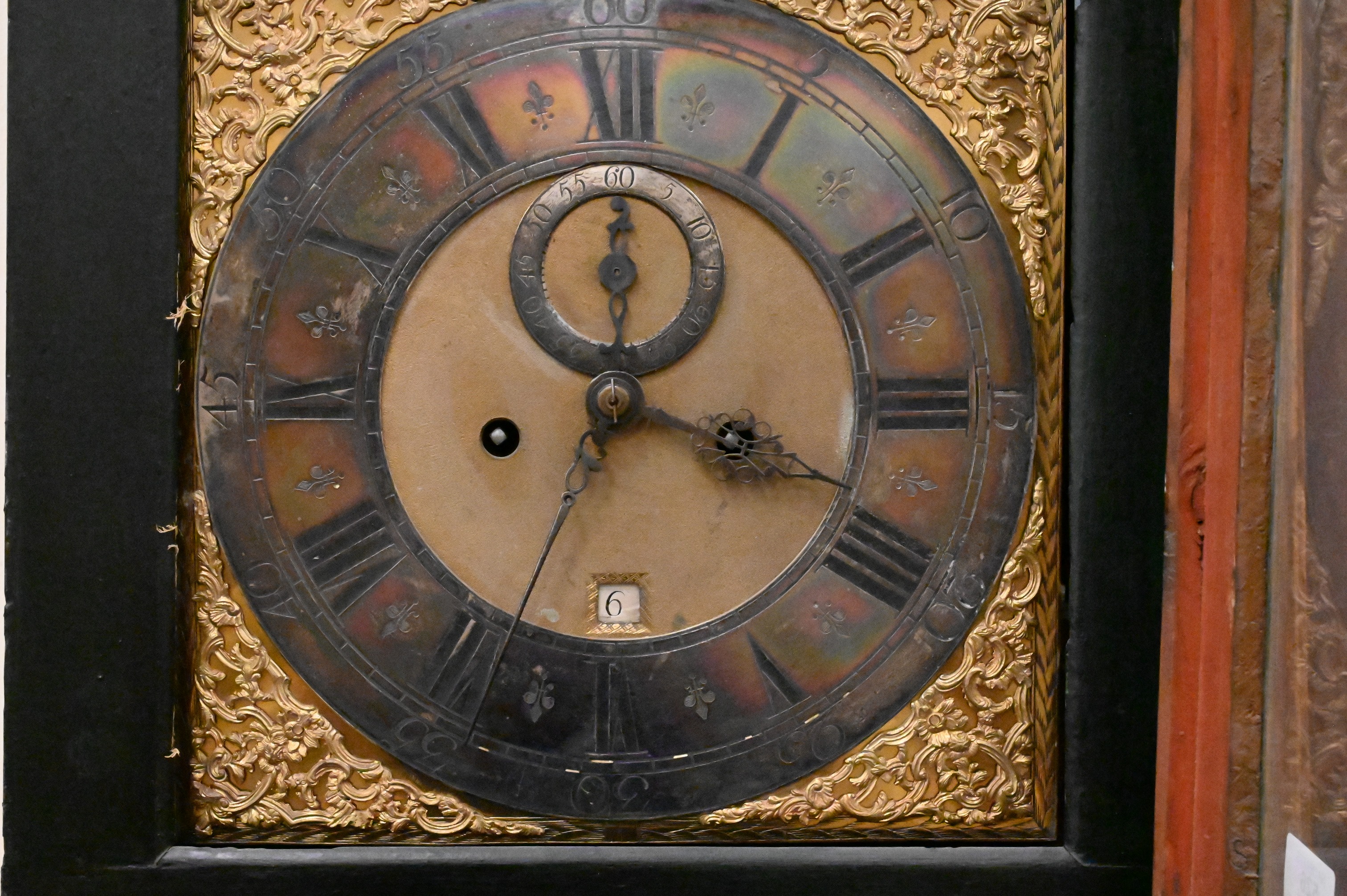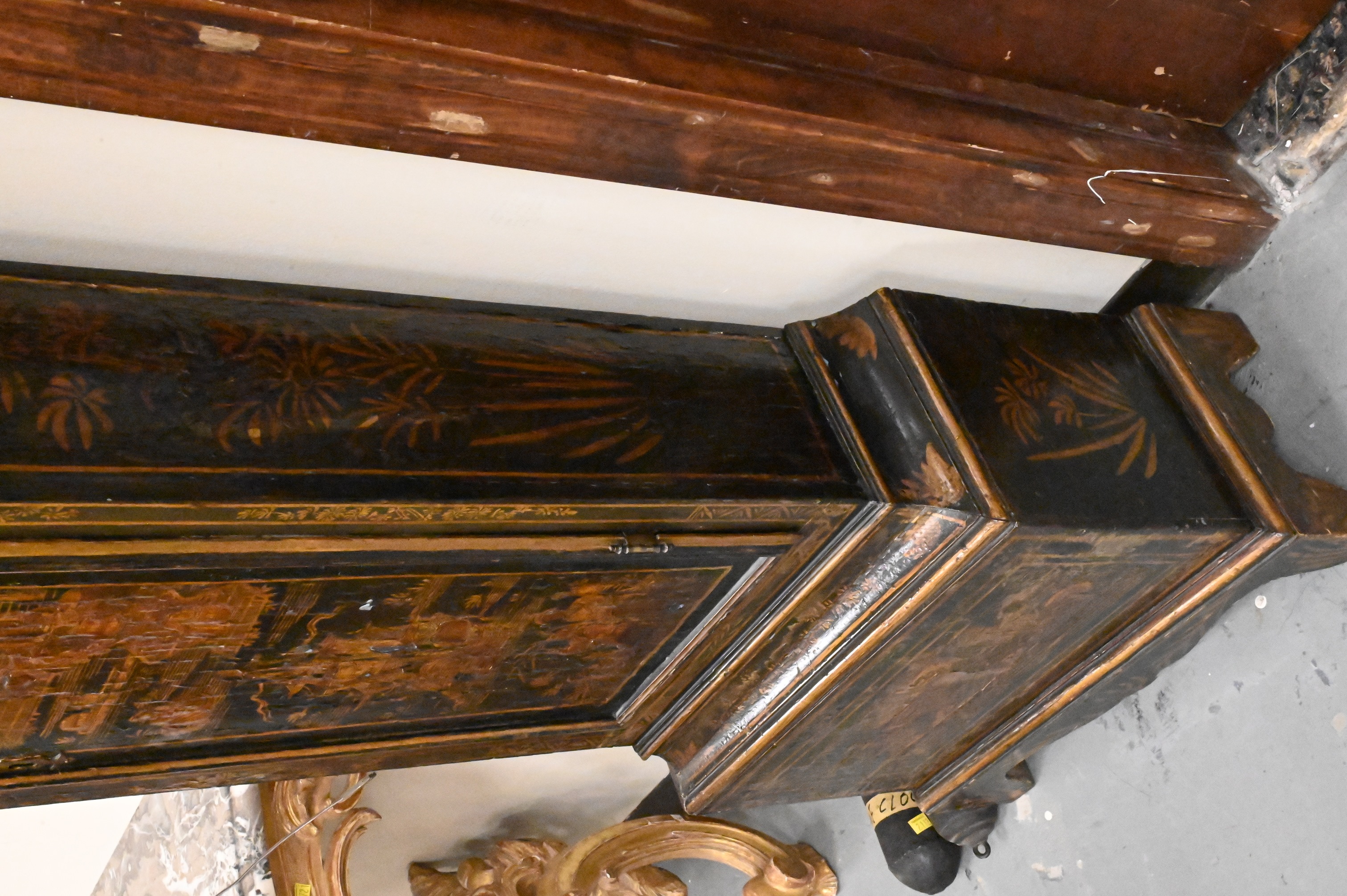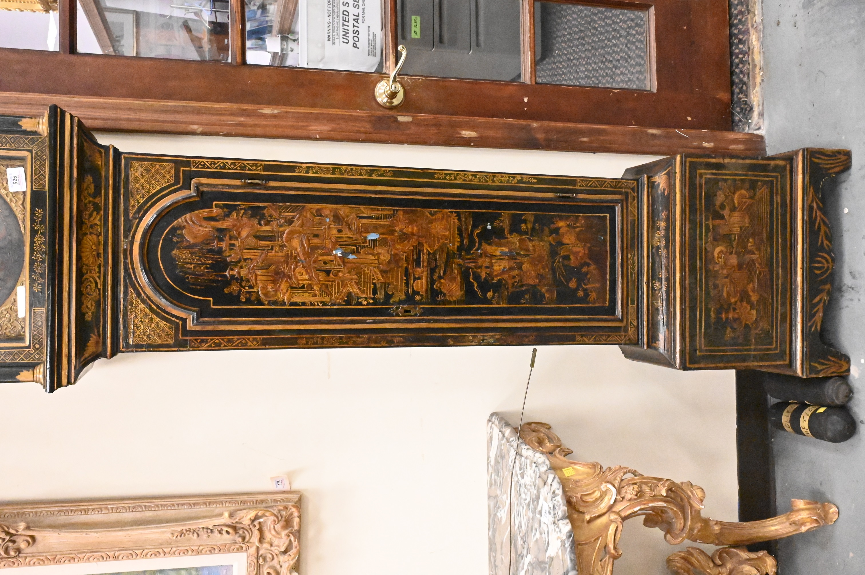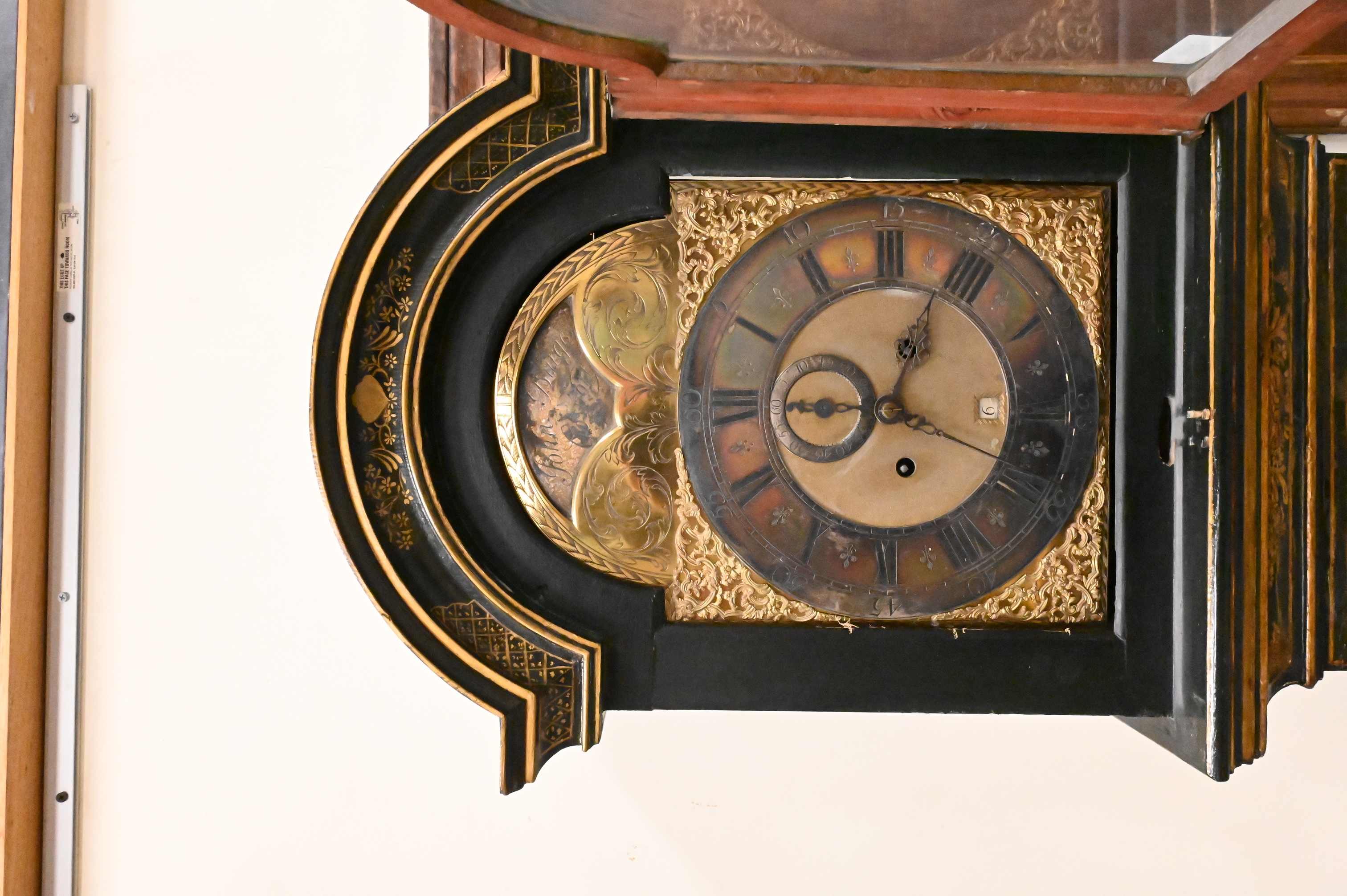 in dark green Chinoiserie lacquer, by John Burgess Gosport, with weights and pendulum, circa 1780