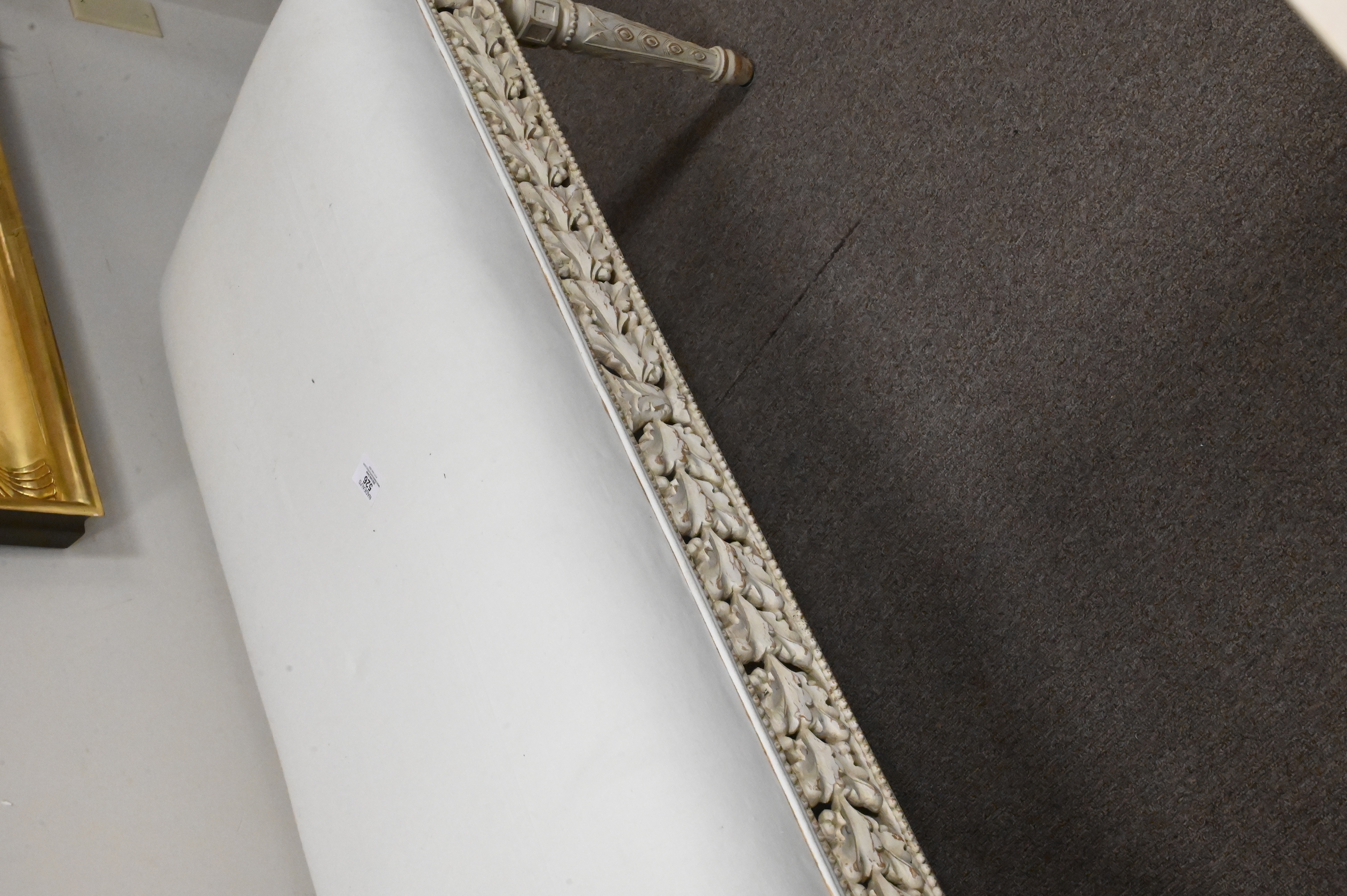 in custom white upholstery over carved and painted base having acanthus leaf apron over tapering legs with flower motif throughout, Moinat retails for $3,671 each