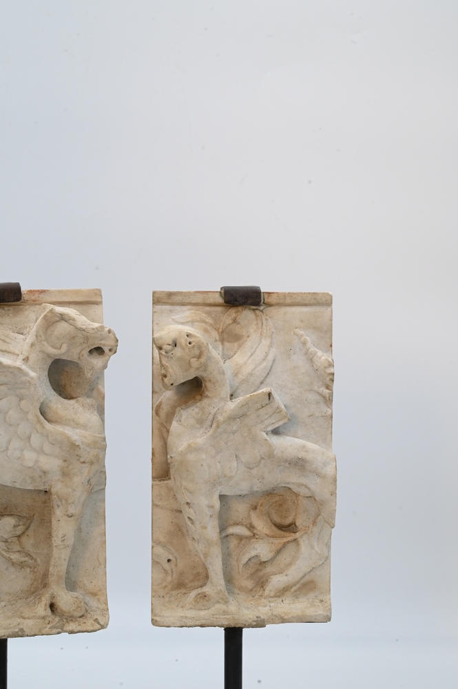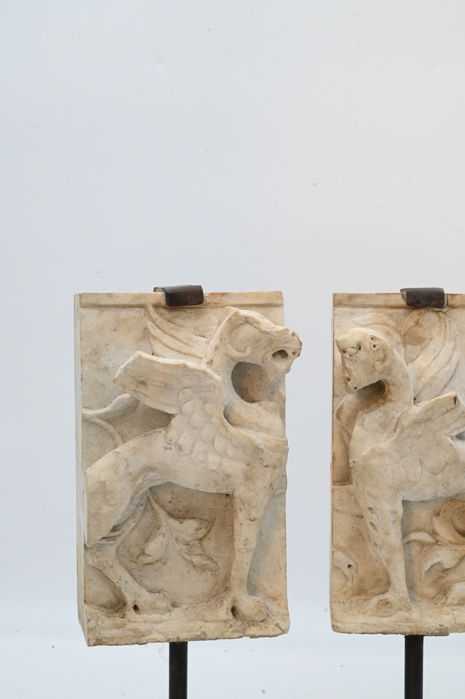 Pair of Italian Marble Fragments, having carved winged griffins mounted on metal stand, height 14 inches.